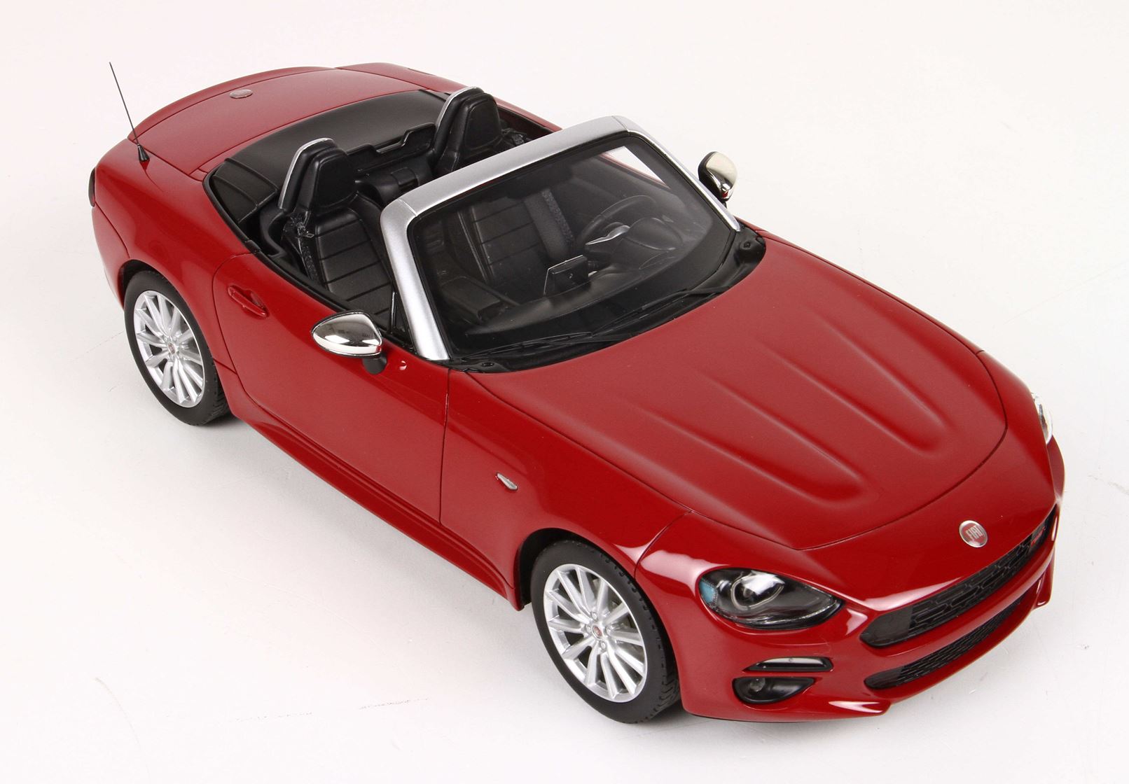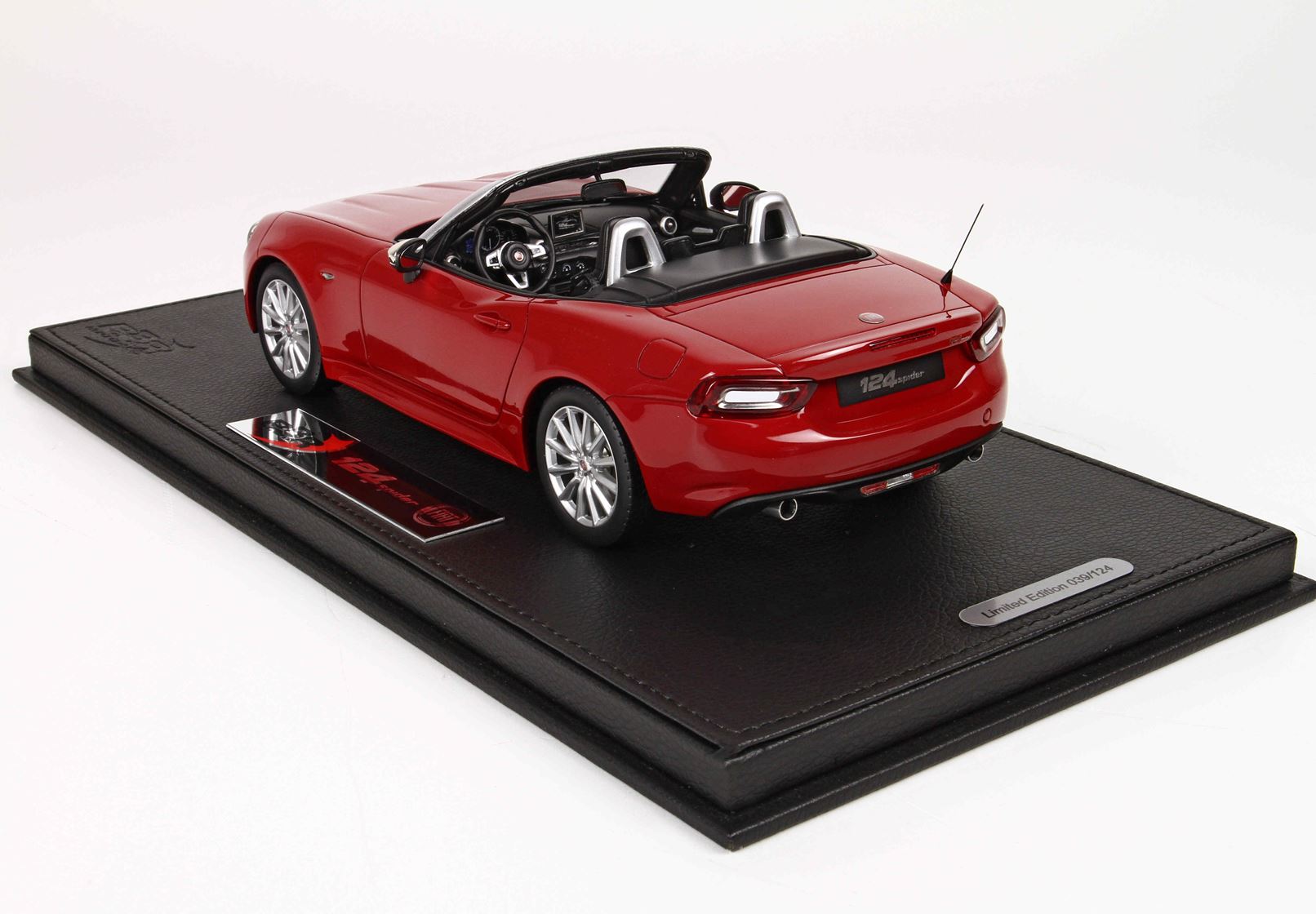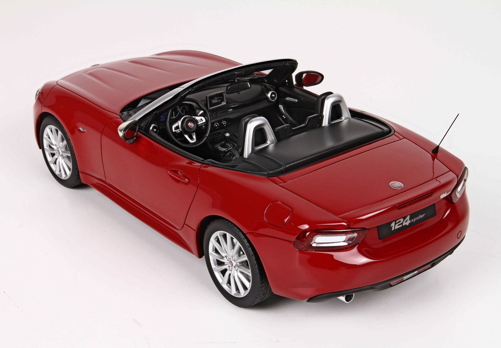 We propose the 1/18 scale scale replica of the limited series that Fiat has proposed at the launch of the 124 Spider in red with chrome mirrors and black interior.