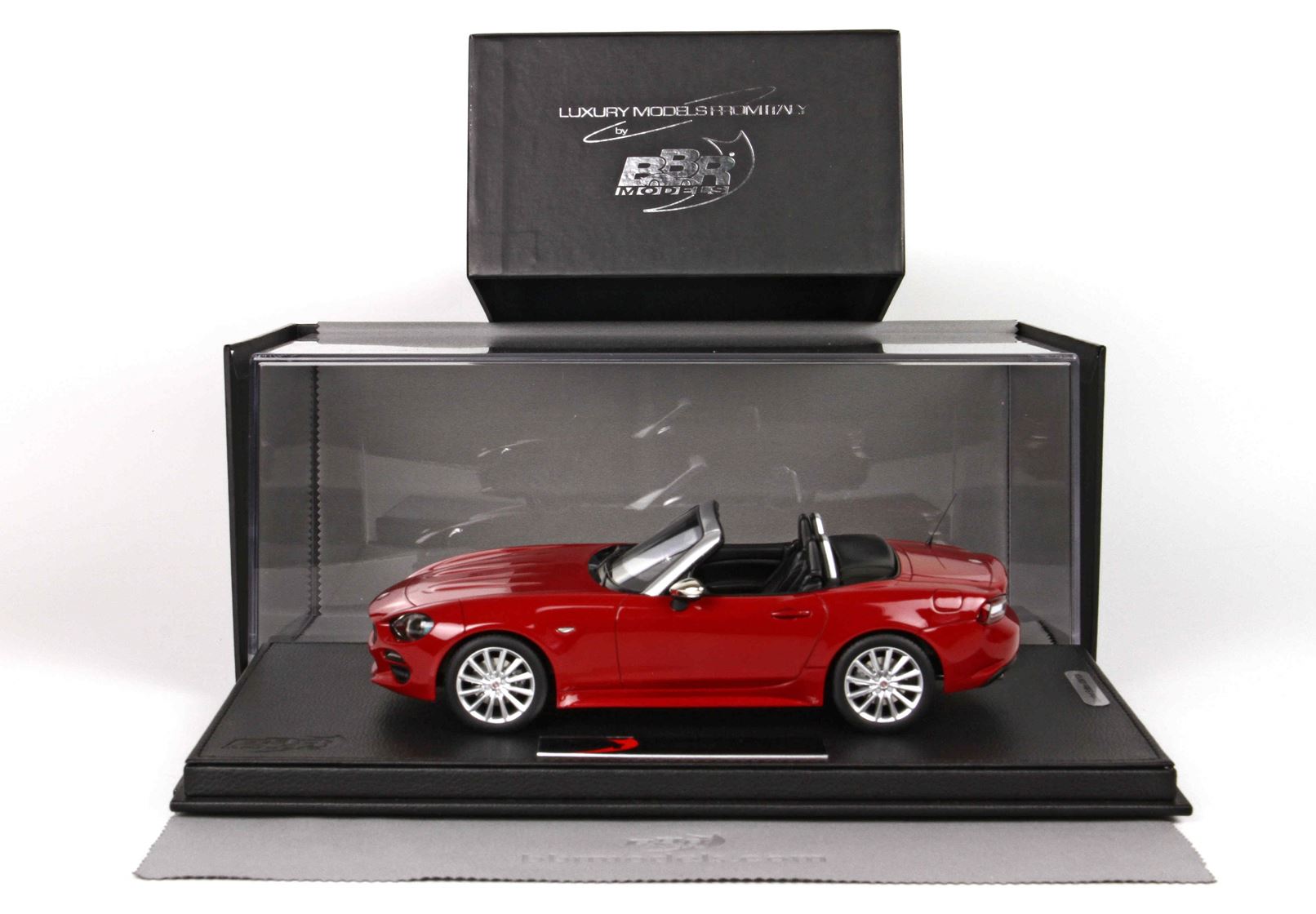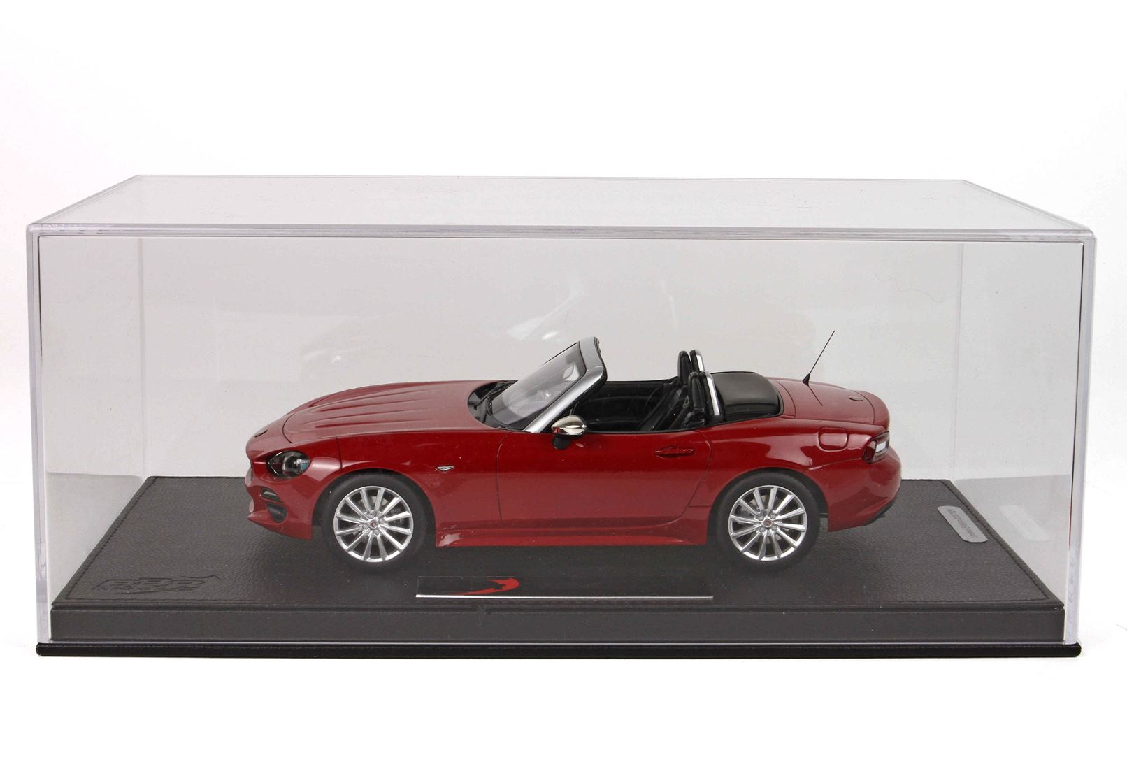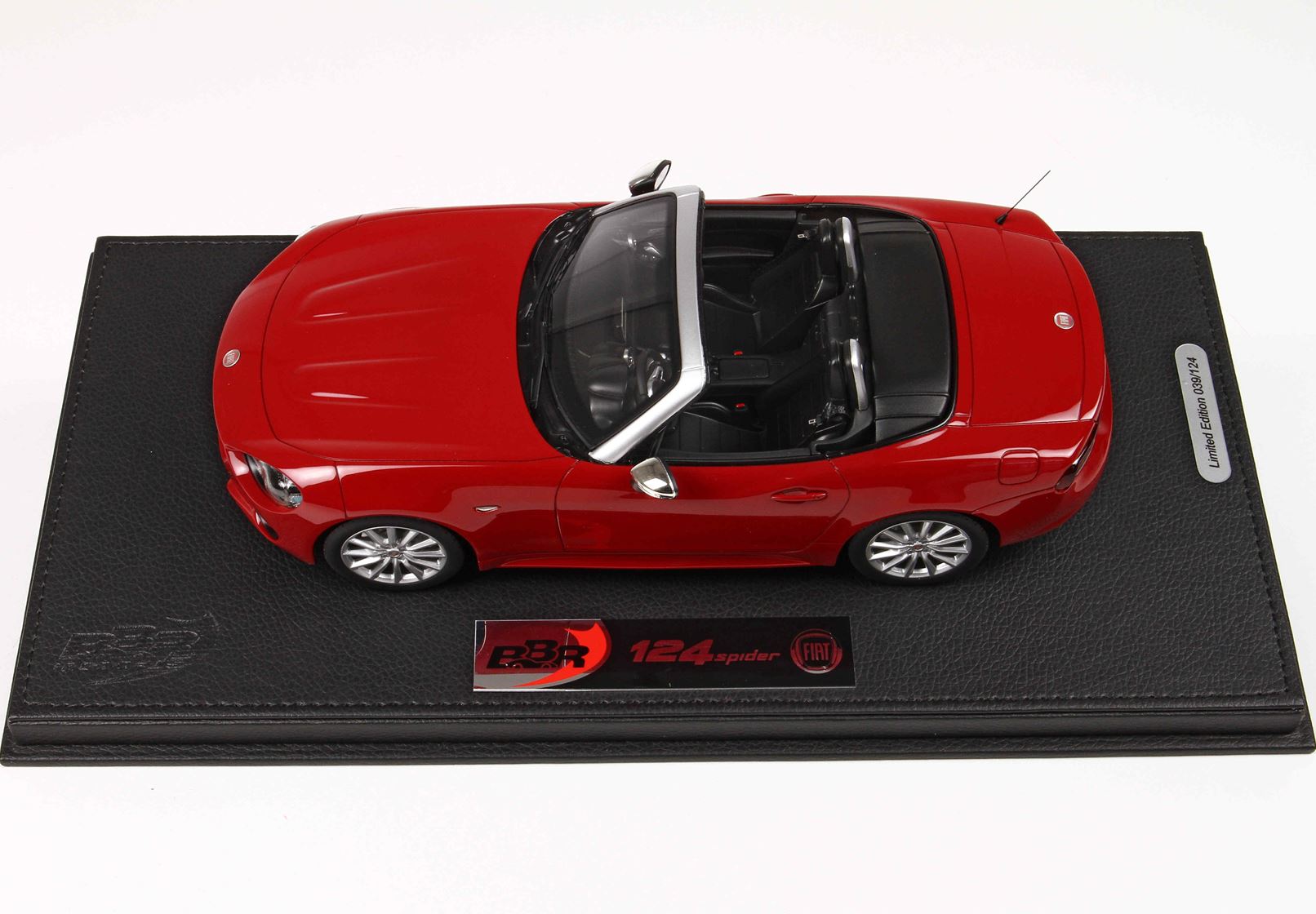 We propose the 1/18 scale scale replica of the limited series that Fiat has proposed at the launch of the 124 Spider in red with chrome mirrors and black interior.