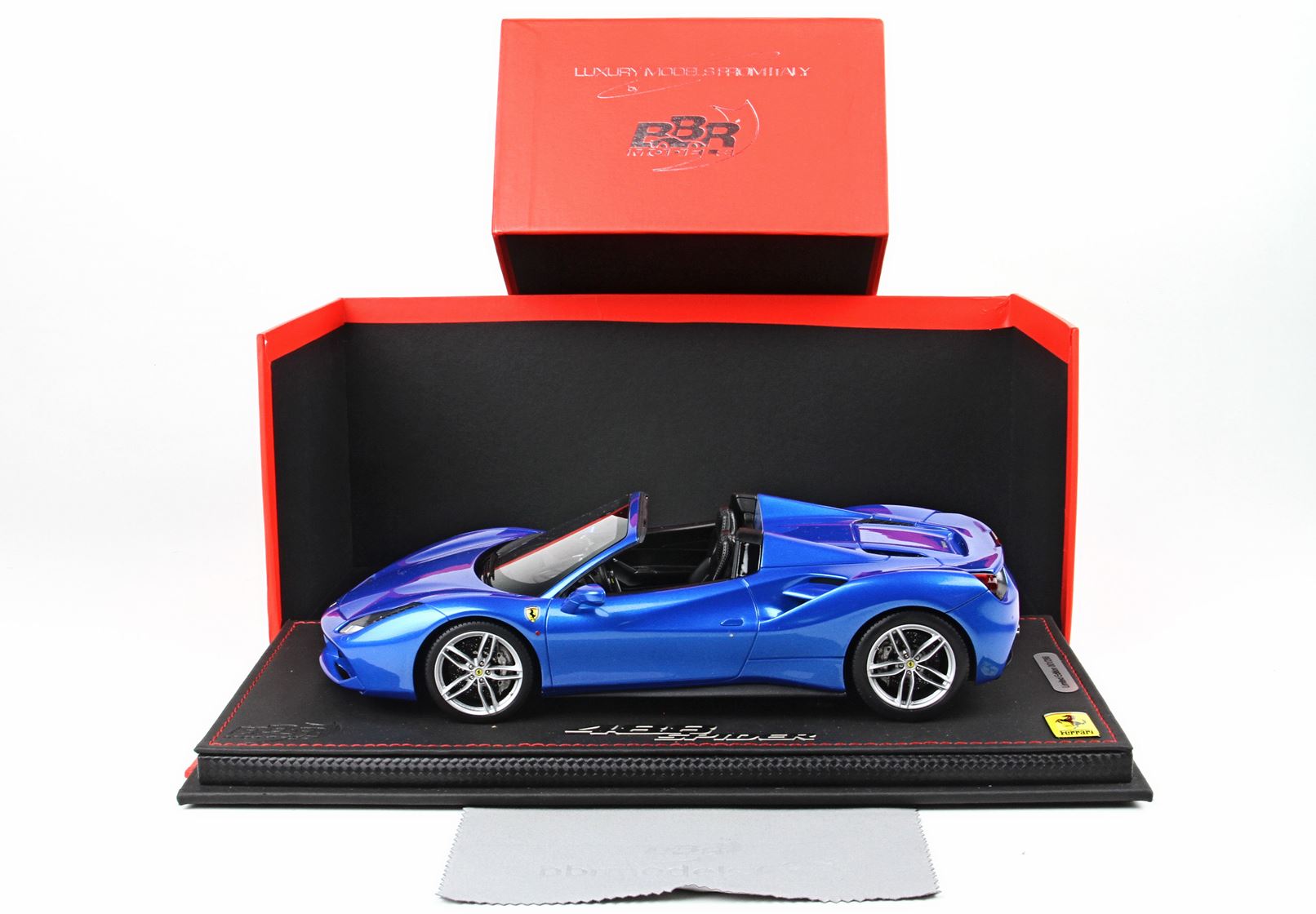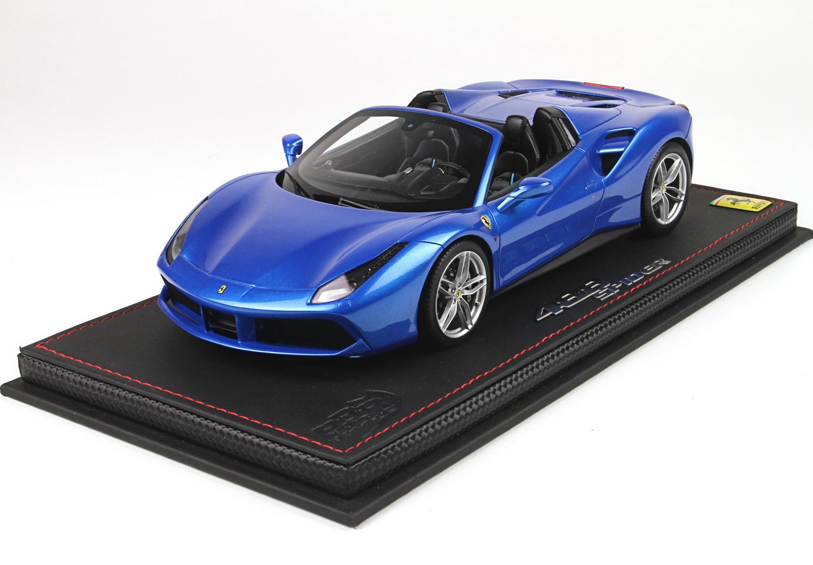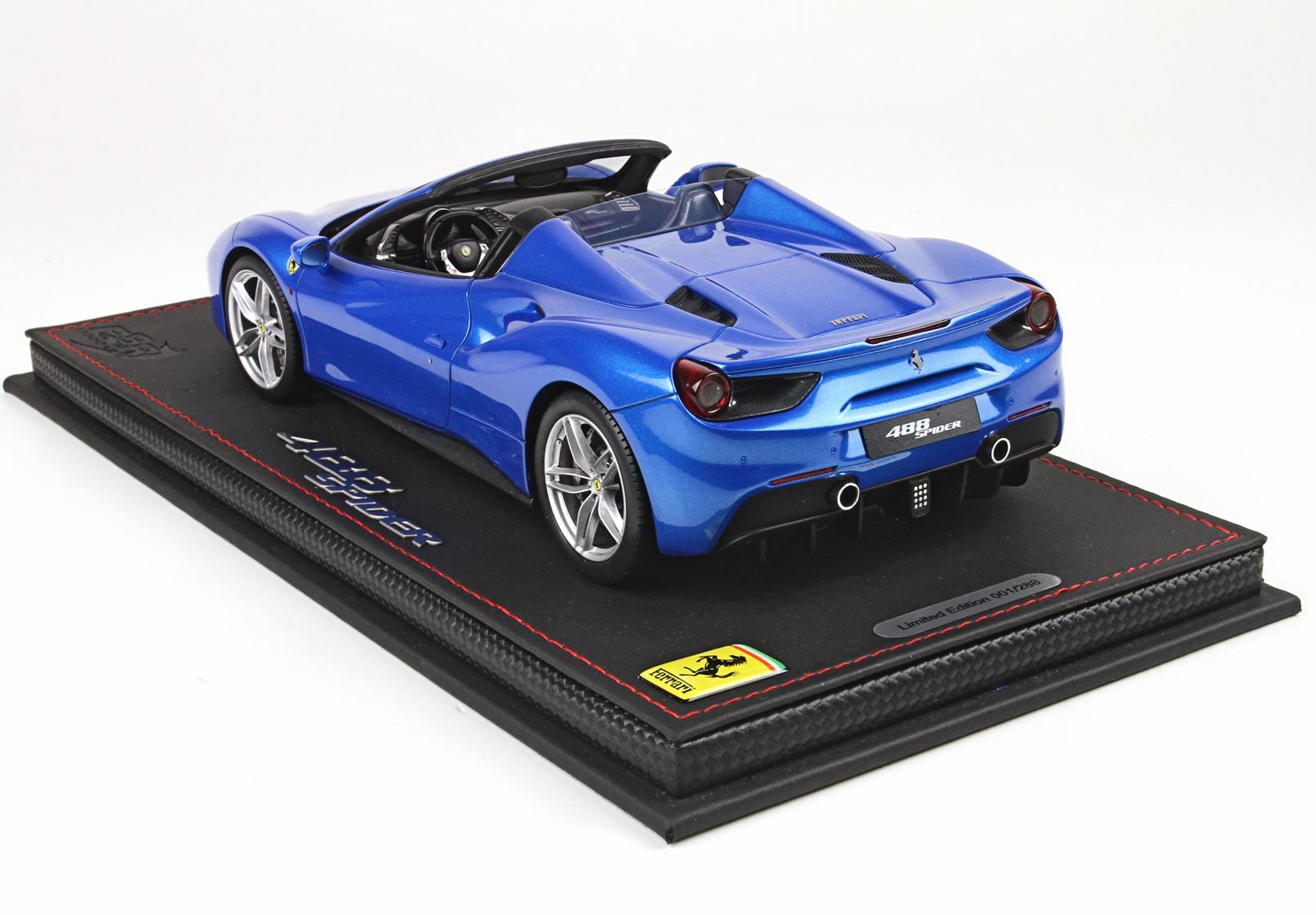 This model in scale 1/18 is the loyal reproduction of Ferrari 488 GTB spider, big attention is been given to reproduce teh wheels that is made of 9 pieces with real chrome steel knocks. New is also the metallic blue color used for the presentation of the car
