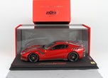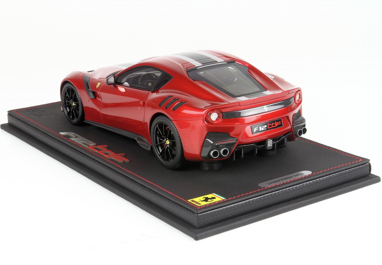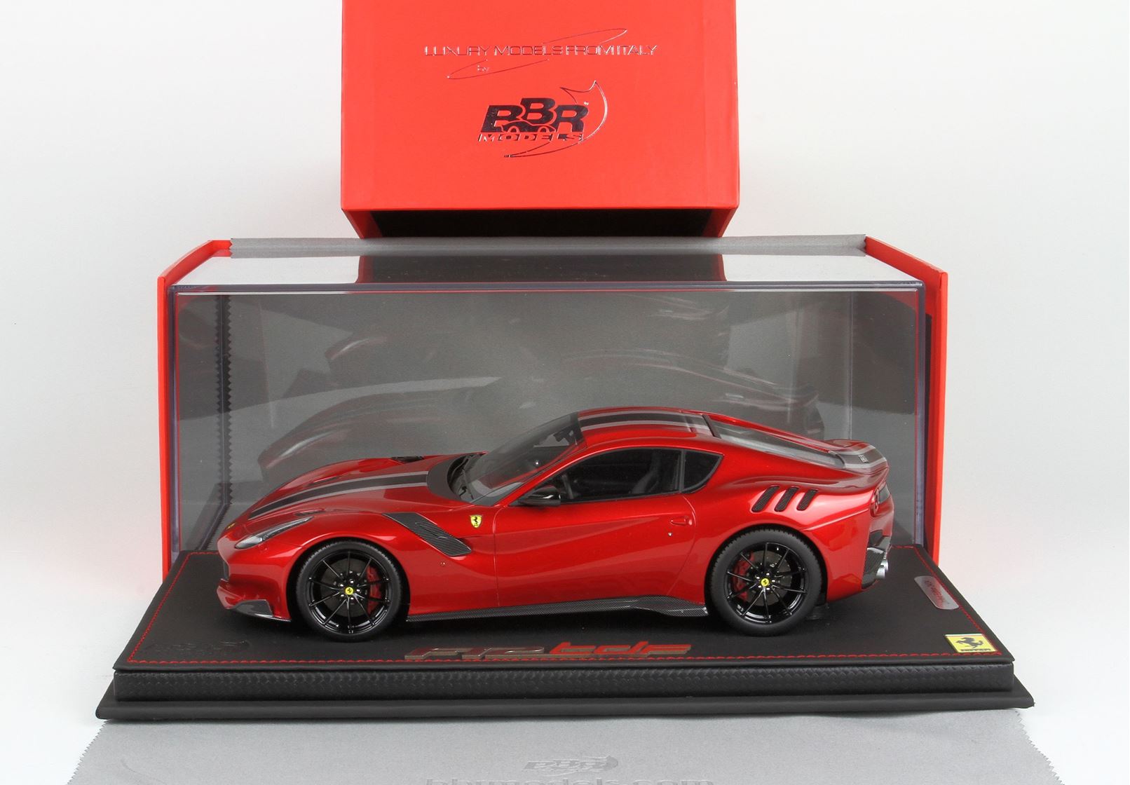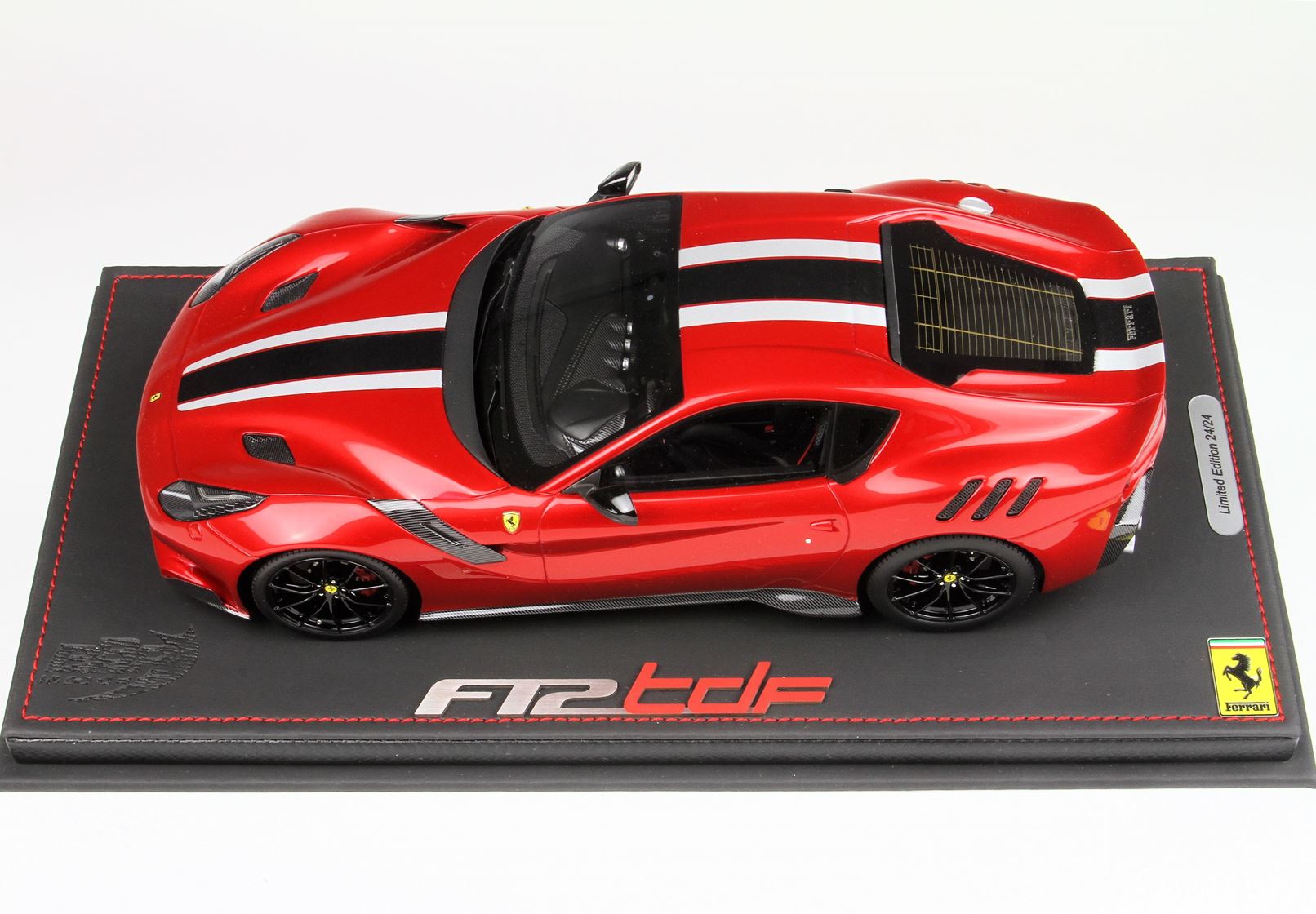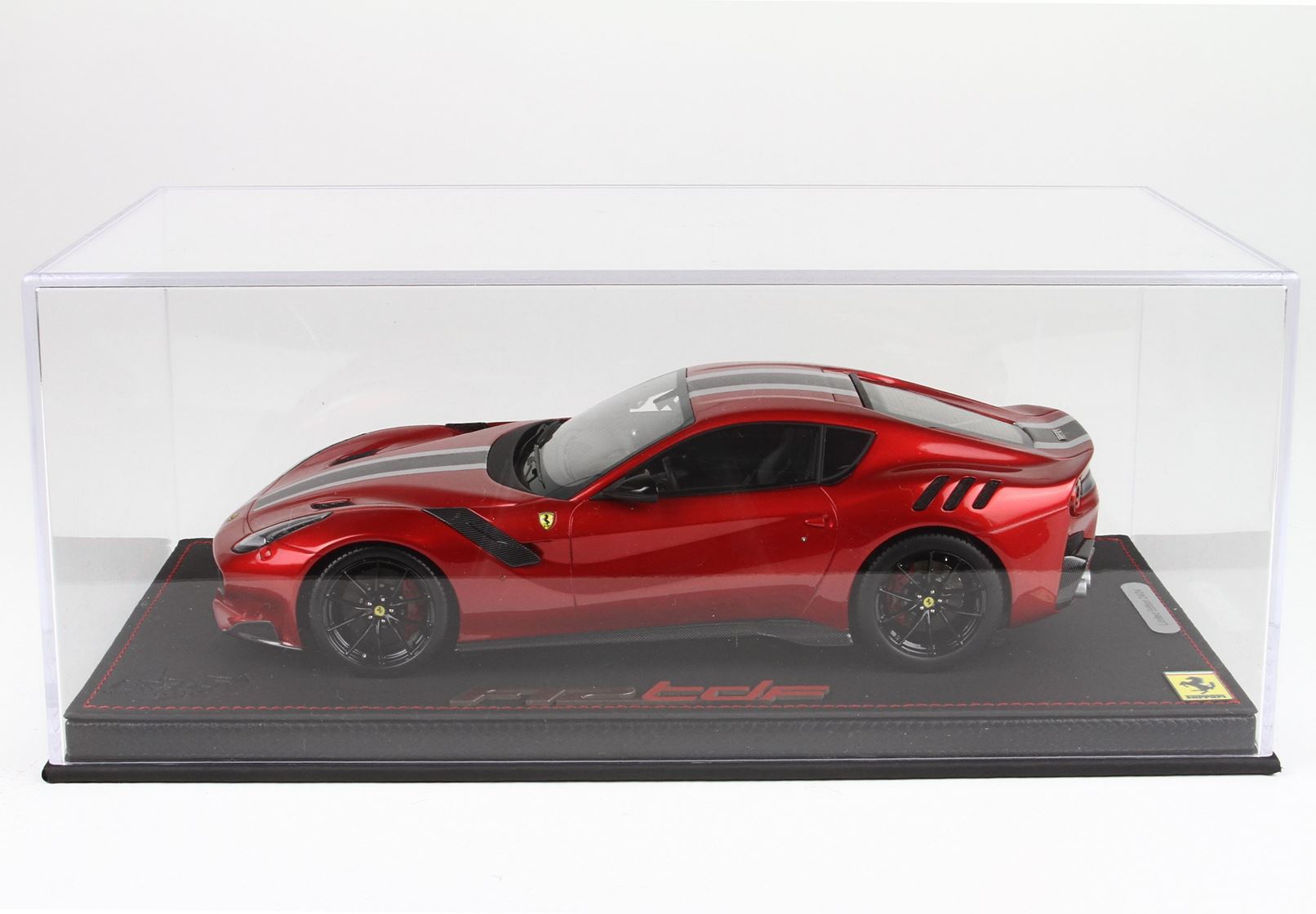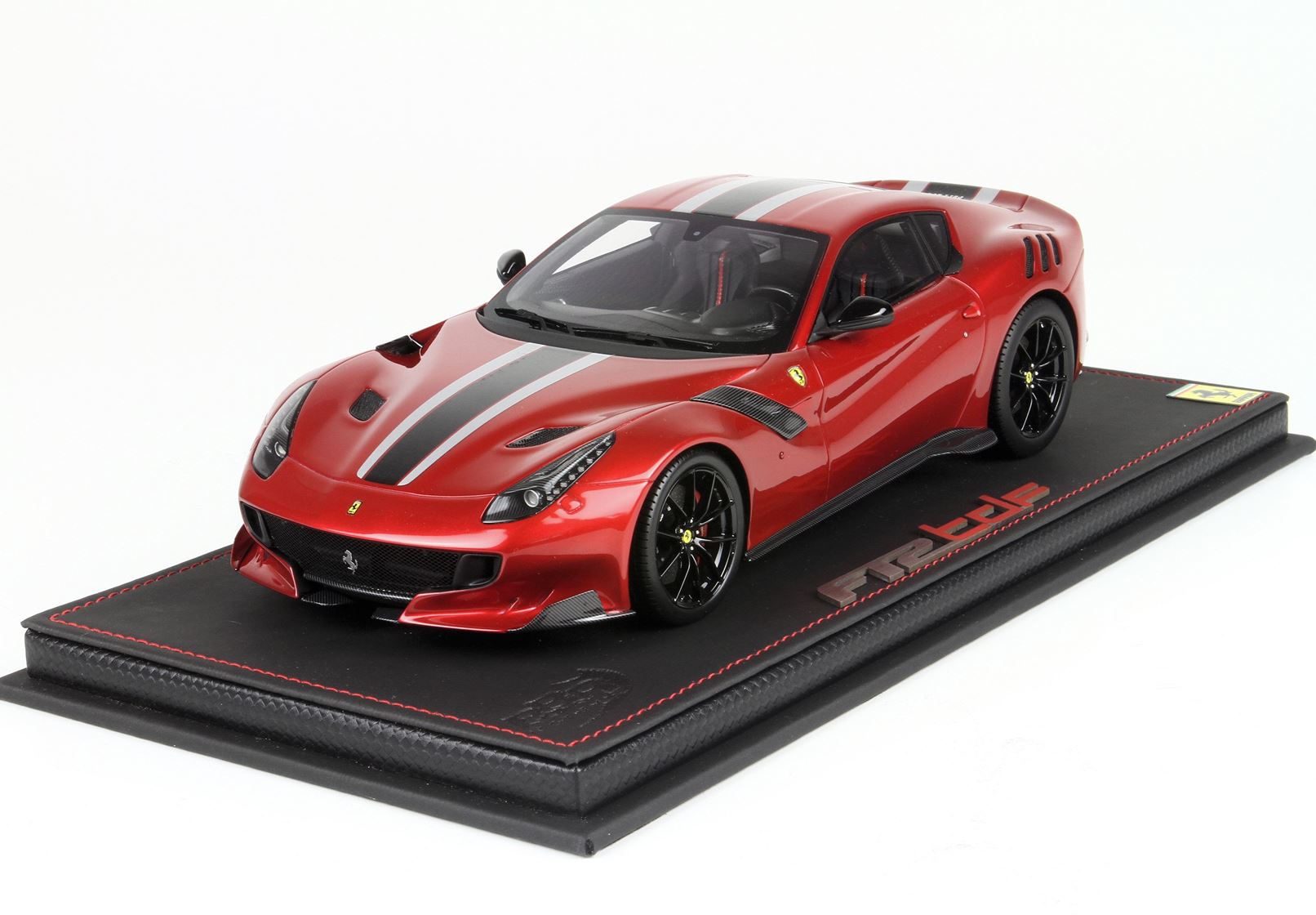 version of F12 TDF in red fire color, with black Daytona and Grey Nurburging strip on body. gloss black wheels and red brakes.