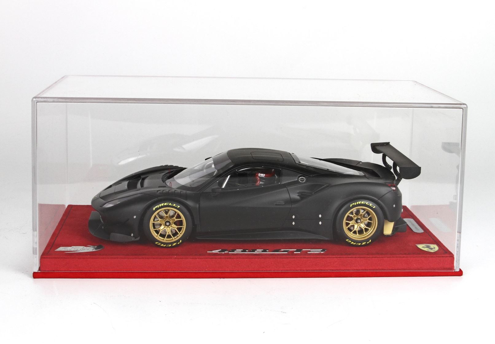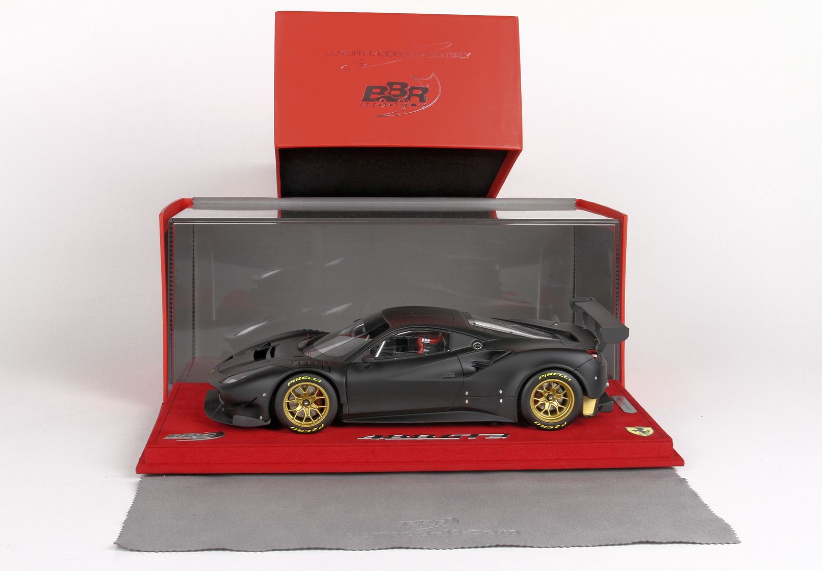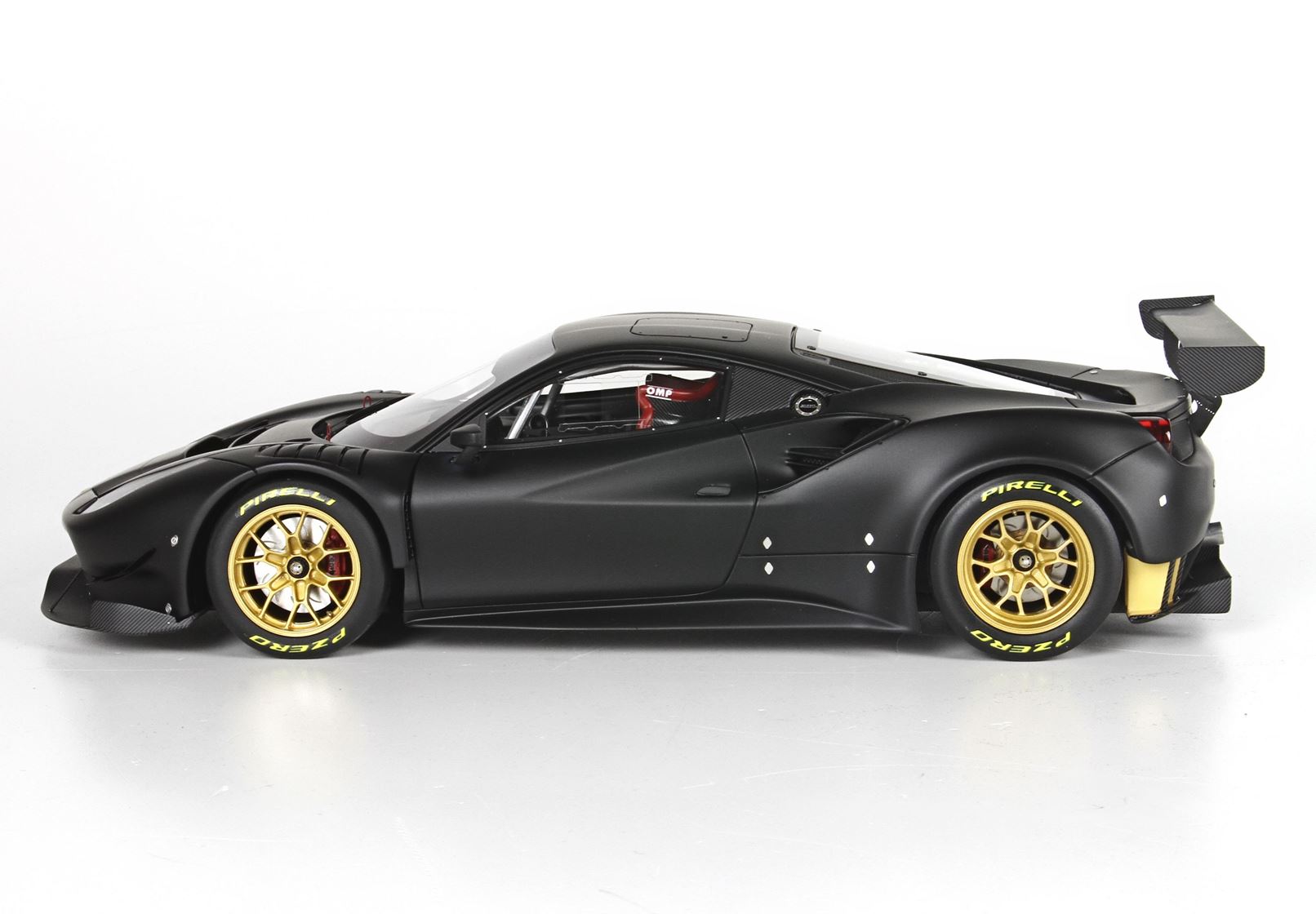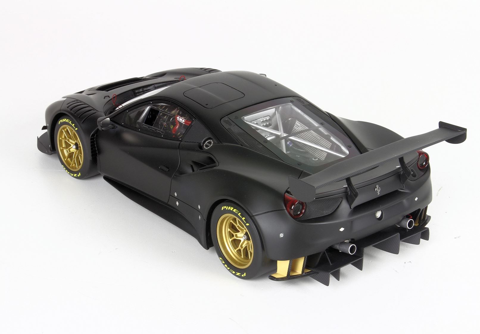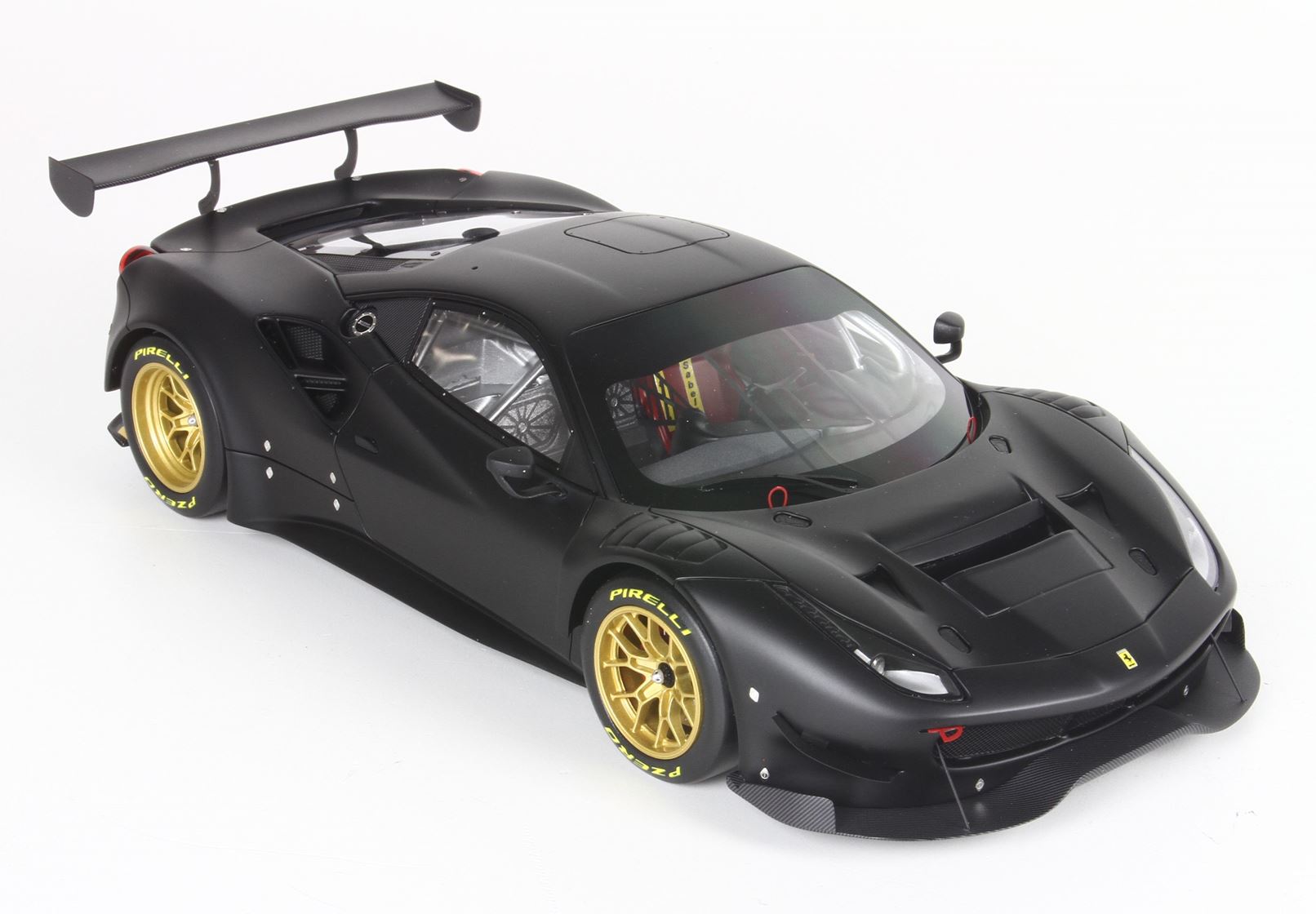 Questo automodello replica la Ferrari 488 GT3 in scala 1/18, nel colore nero opaco.
