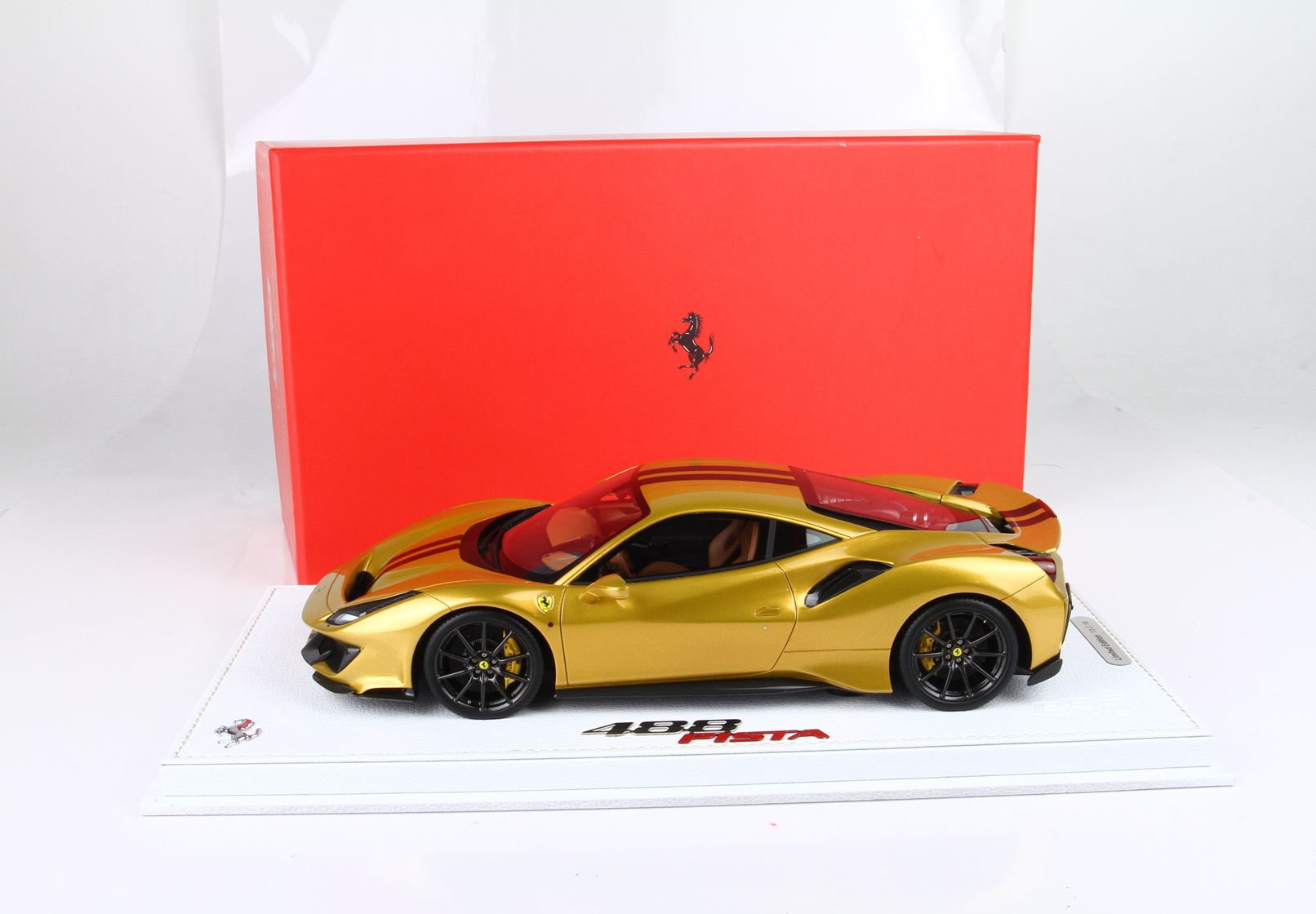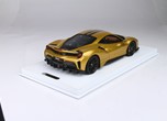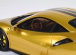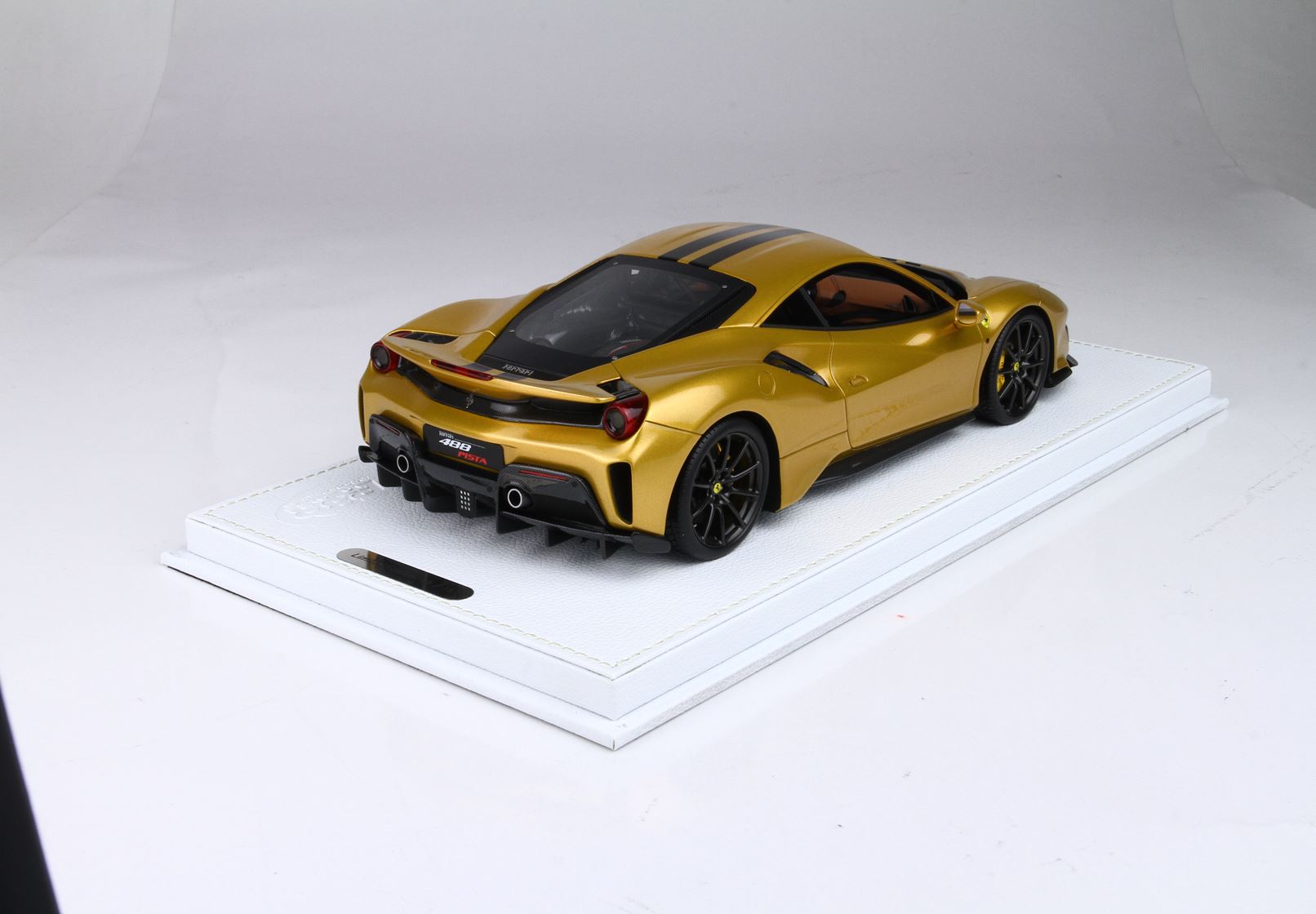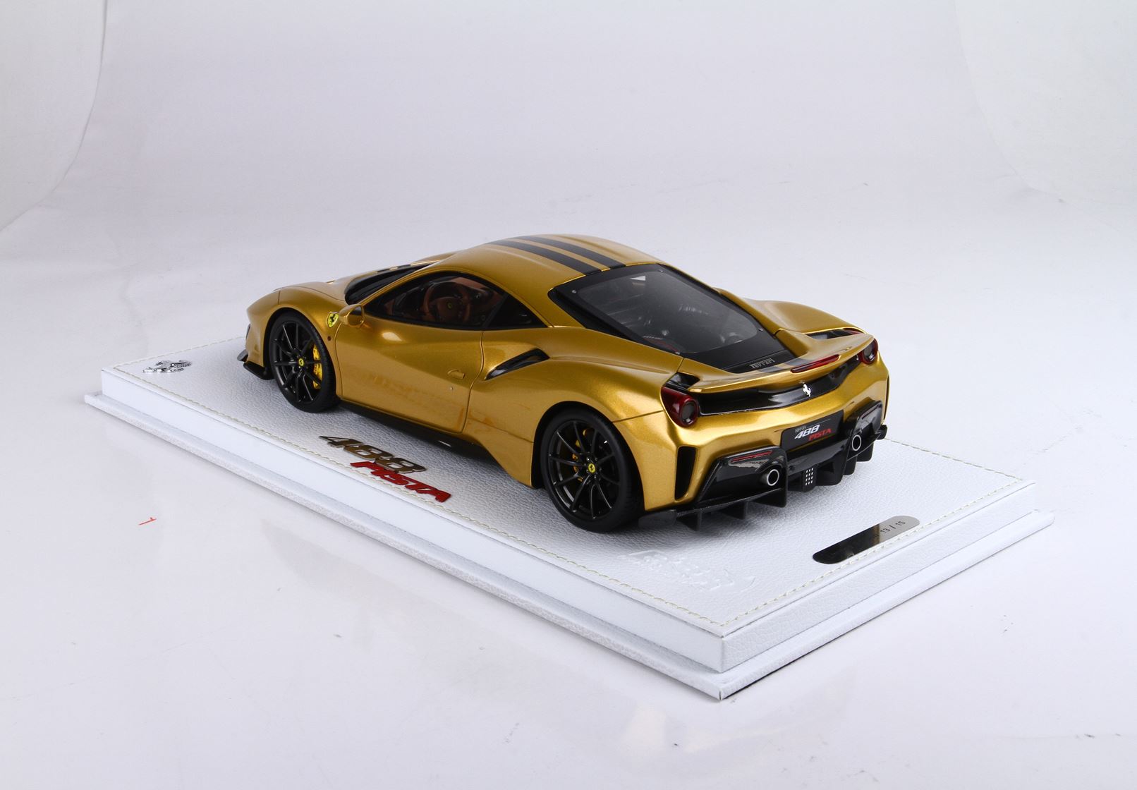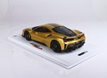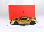 Questo modello esclusivo di Ferrari 488 Pista è stato prodotto in edizione limitata di soli 15 pezzi. Il colore della vettura è Oro metallizzato, con interni Cuoio.