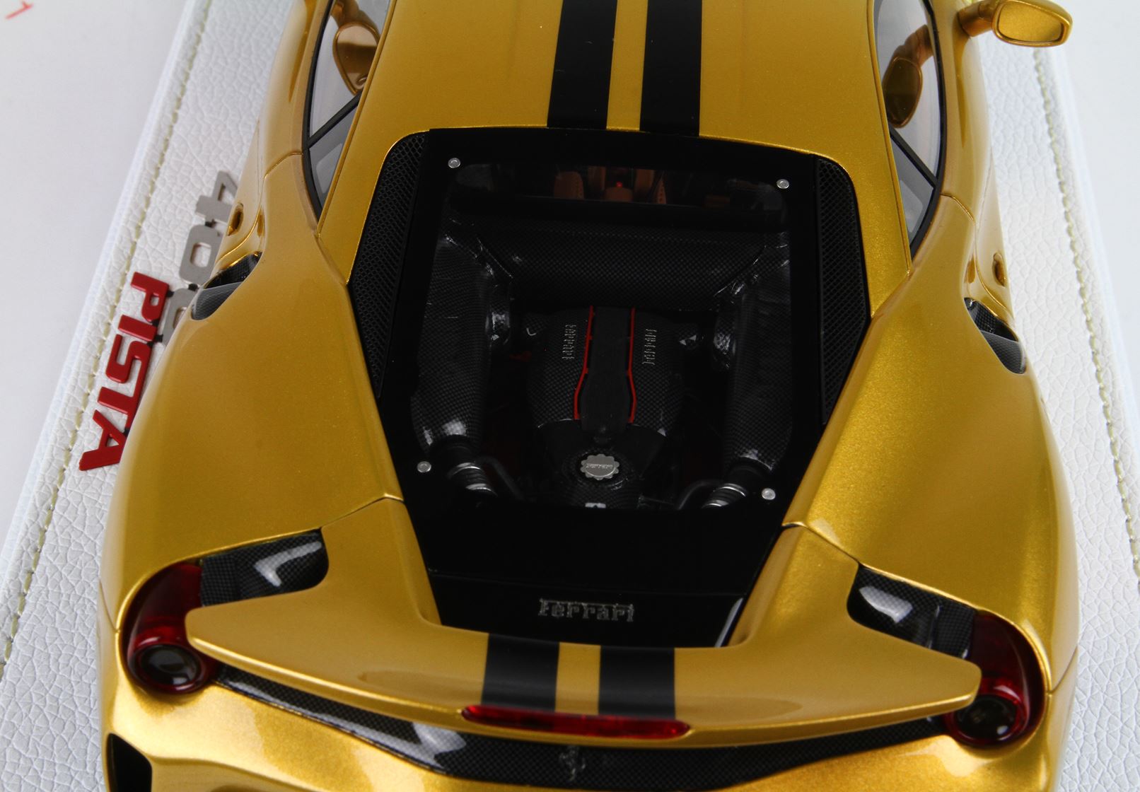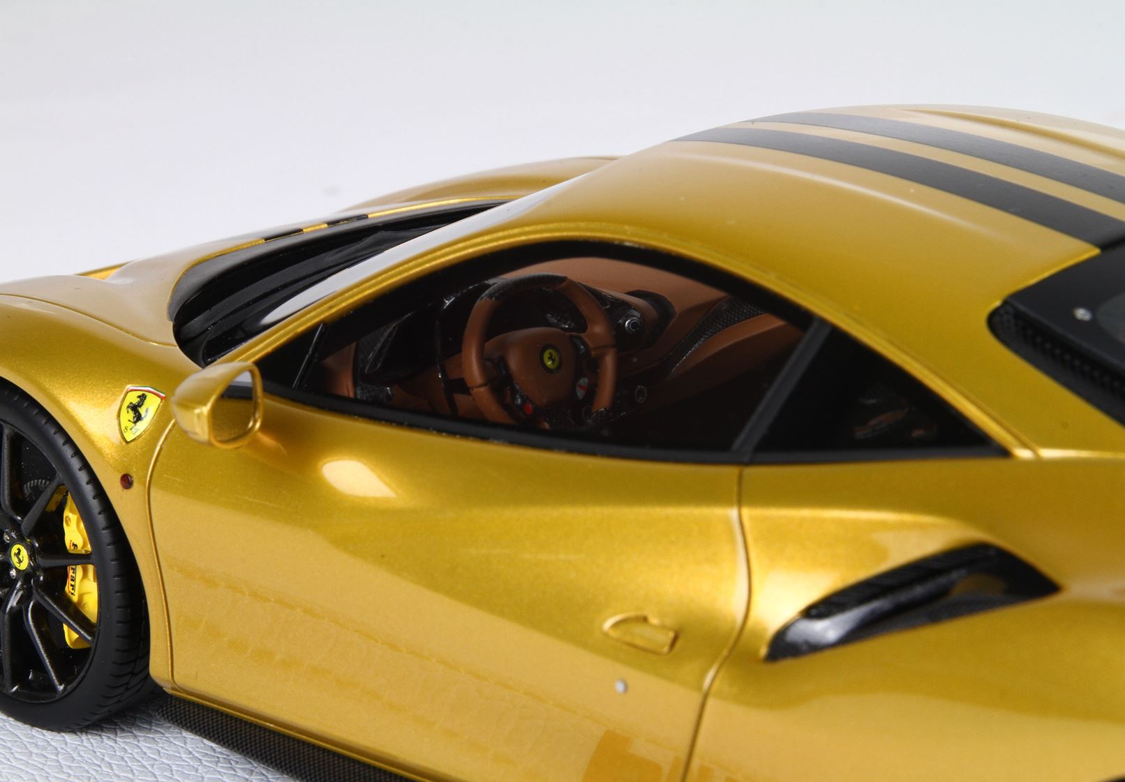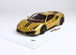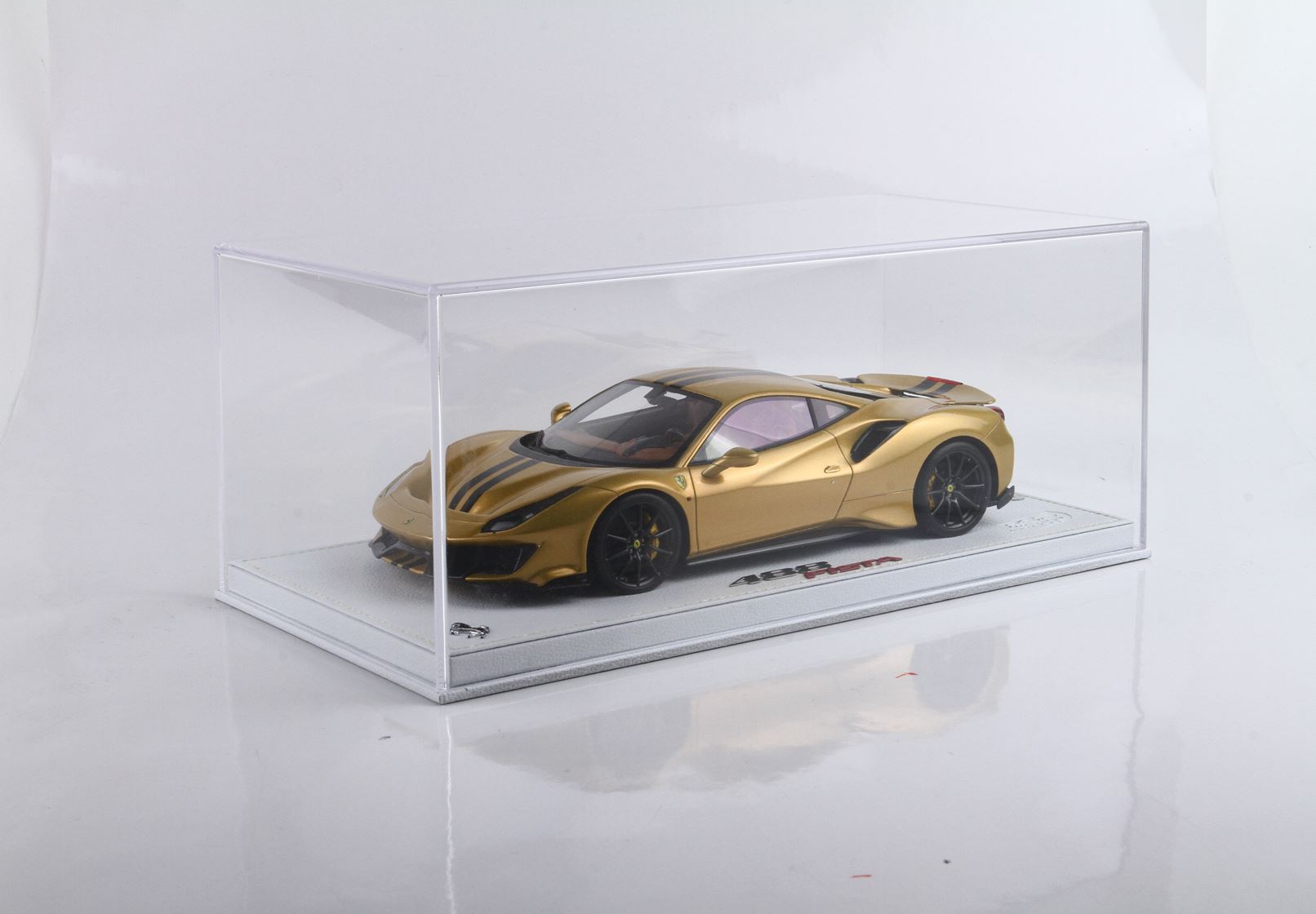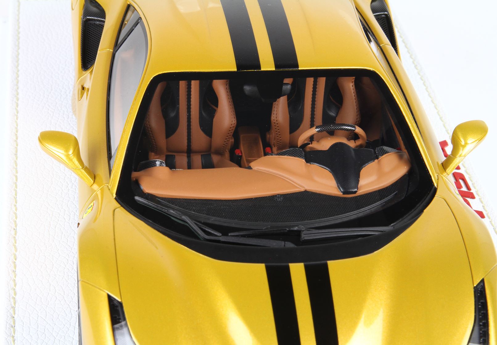 Questo modello esclusivo di Ferrari 488 Pista è stato prodotto in edizione limitata di soli 15 pezzi. Il colore della vettura è Oro metallizzato, con interni Cuoio.