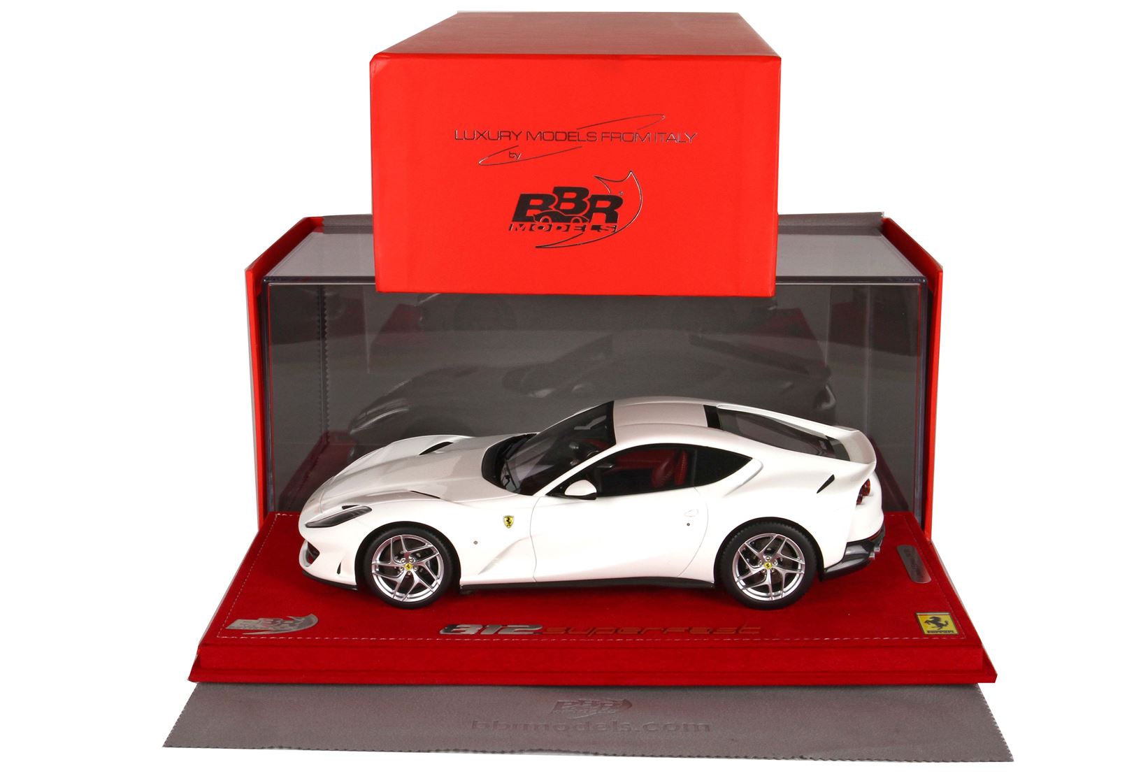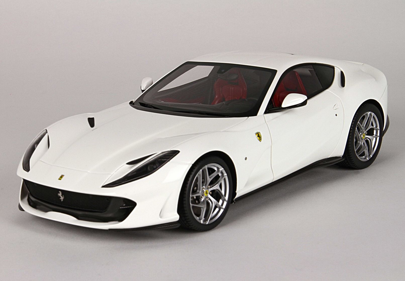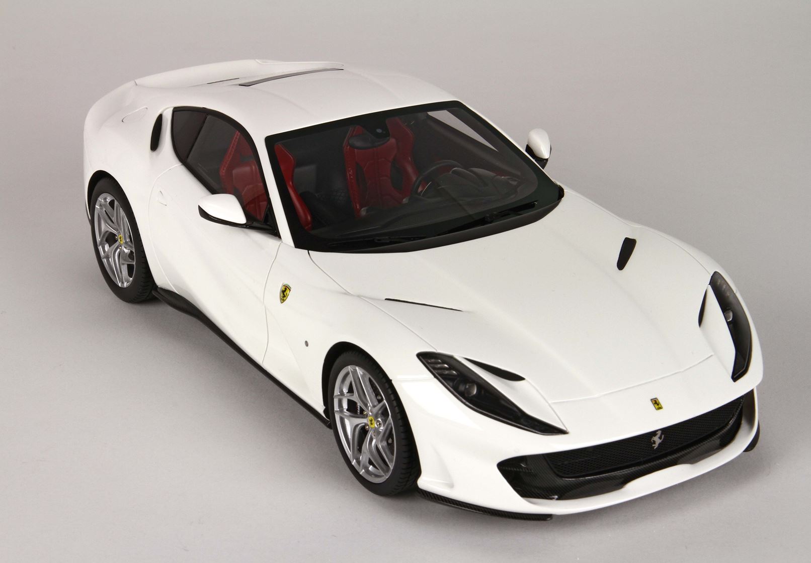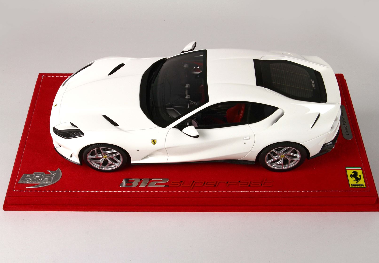 Model car painted in the original Ferrari color avus white, with seats in Cartier red and black hatbox.