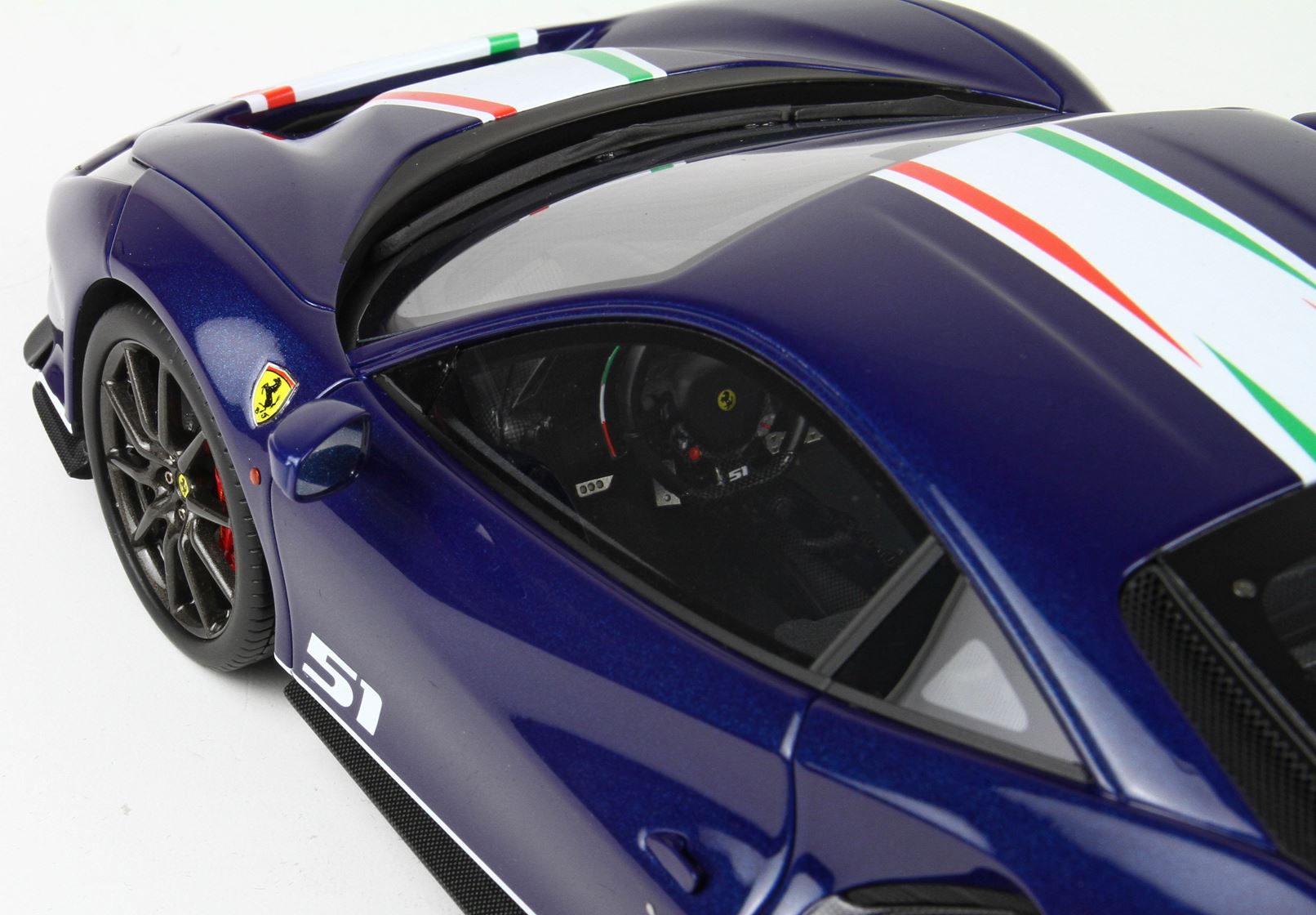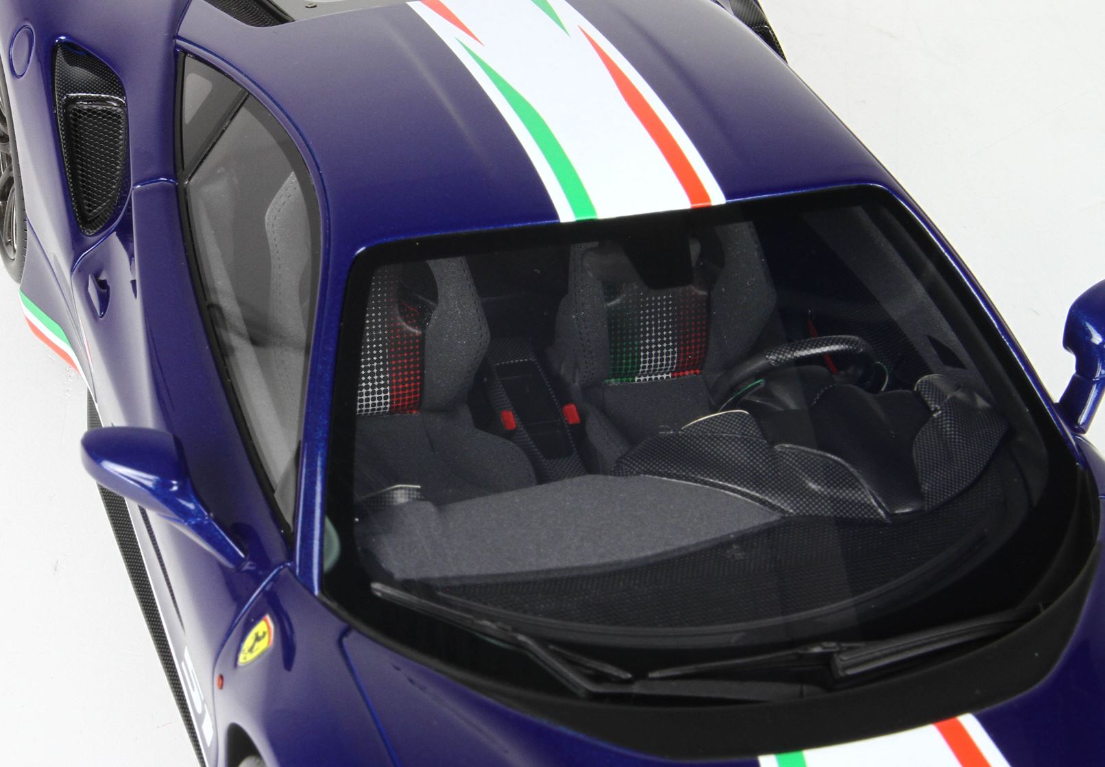 Passando agli interni, i rivestimenti dei sedili sono in una speciale Alcantara nera e traforata; al centro dello schienale viene ripresa una bandiera tricolore sfumata, tema ripreso anche sui tappetini e sul bordo delle palette del cambio.