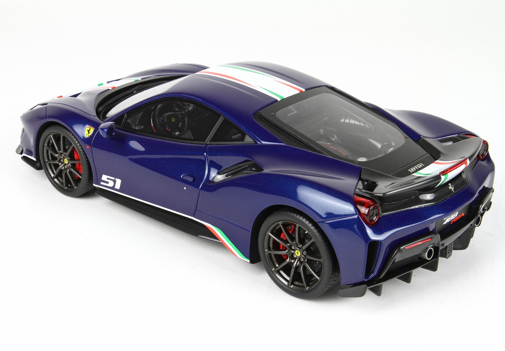 l'ala posteriore è in carbonio a vista. L'allestimento Piloti Ferrari della 488 Pista prevede quattro tinte per la carrozzeria, tutte ispirate al mondo delle competizioni: Rosso Corsa, Blu Tour de France, Nero Daytona e Argento Nürburgring.