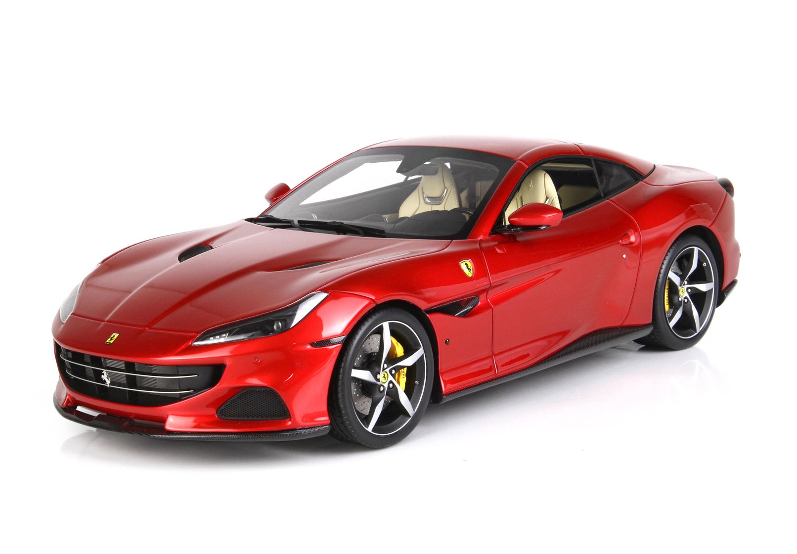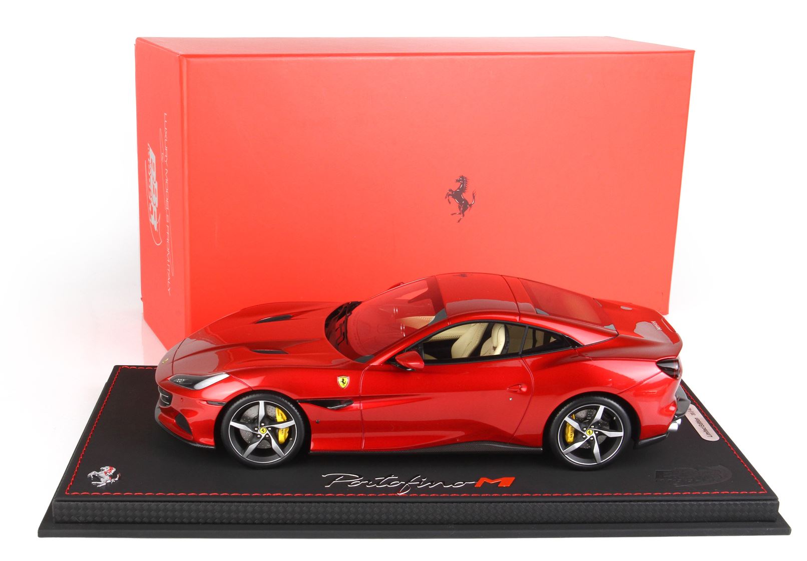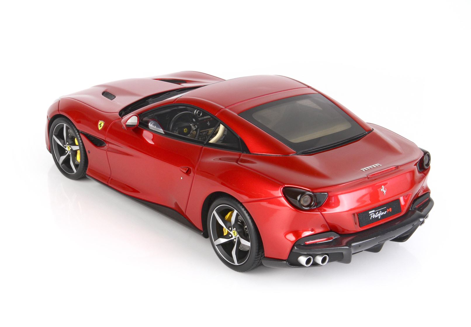 Il modello Ferrari Portofino M si contraddistingue per questo luminoso colore rosso Fuoco metallizzato, con interni crema e ruote diamantate in nero opaco: una combinazione di colori perfetta.