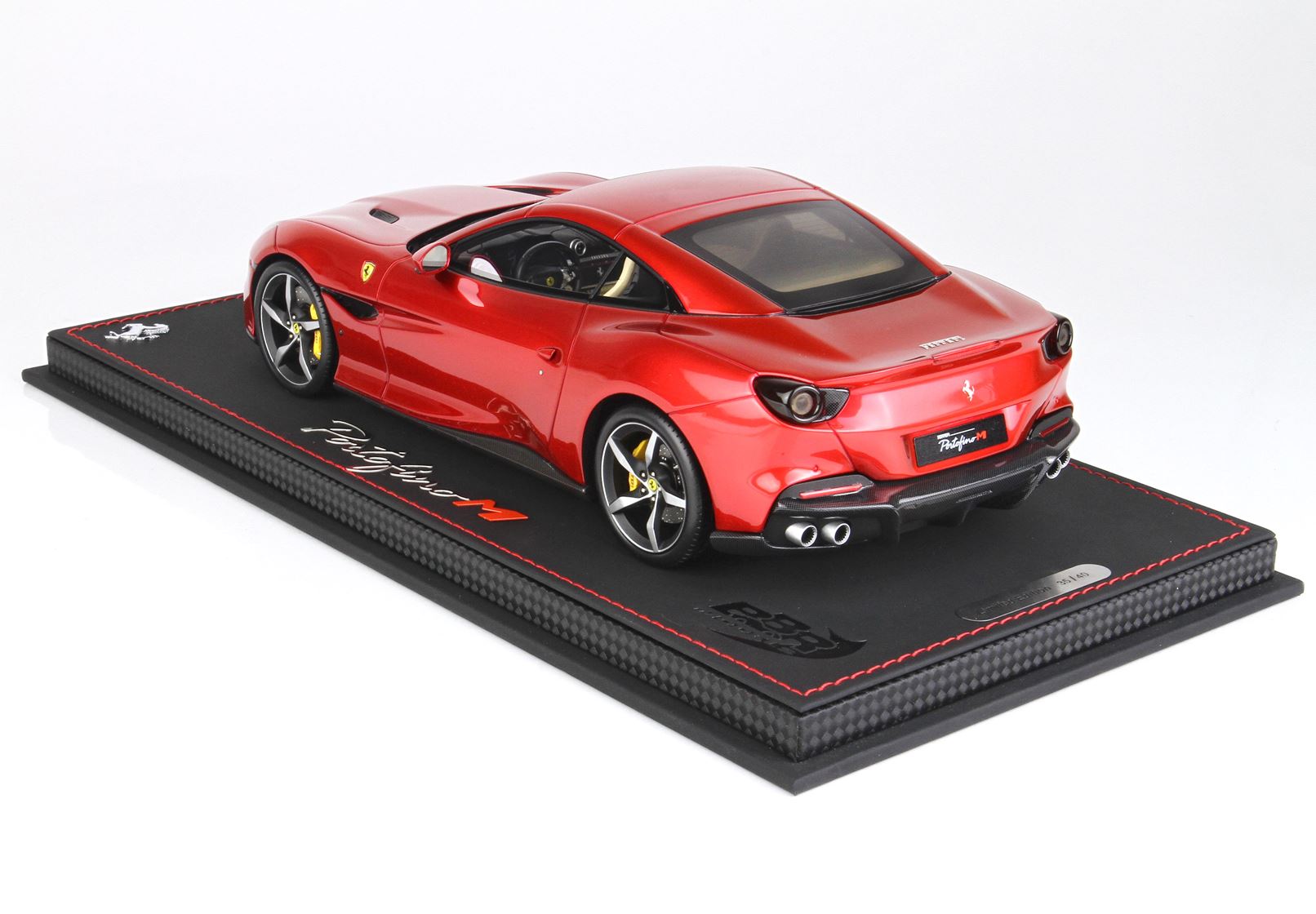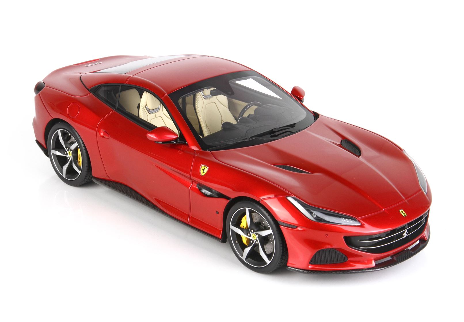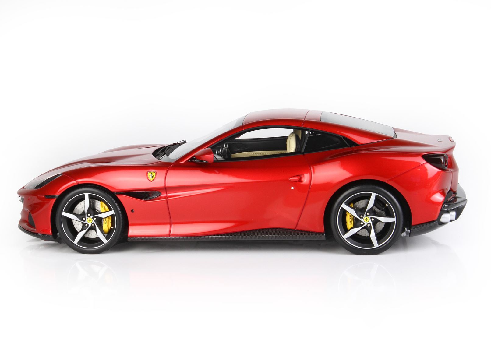 Il modello Ferrari Portofino M si contraddistingue per questo luminoso colore rosso Fuoco metallizzato, con interni crema e ruote diamantate in nero opaco: una combinazione di colori perfetta.