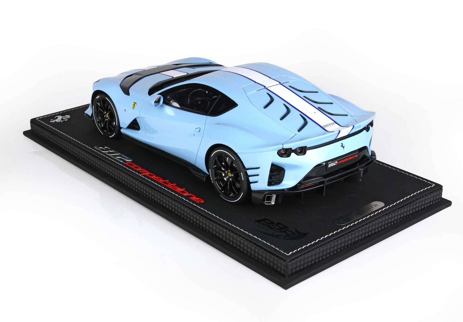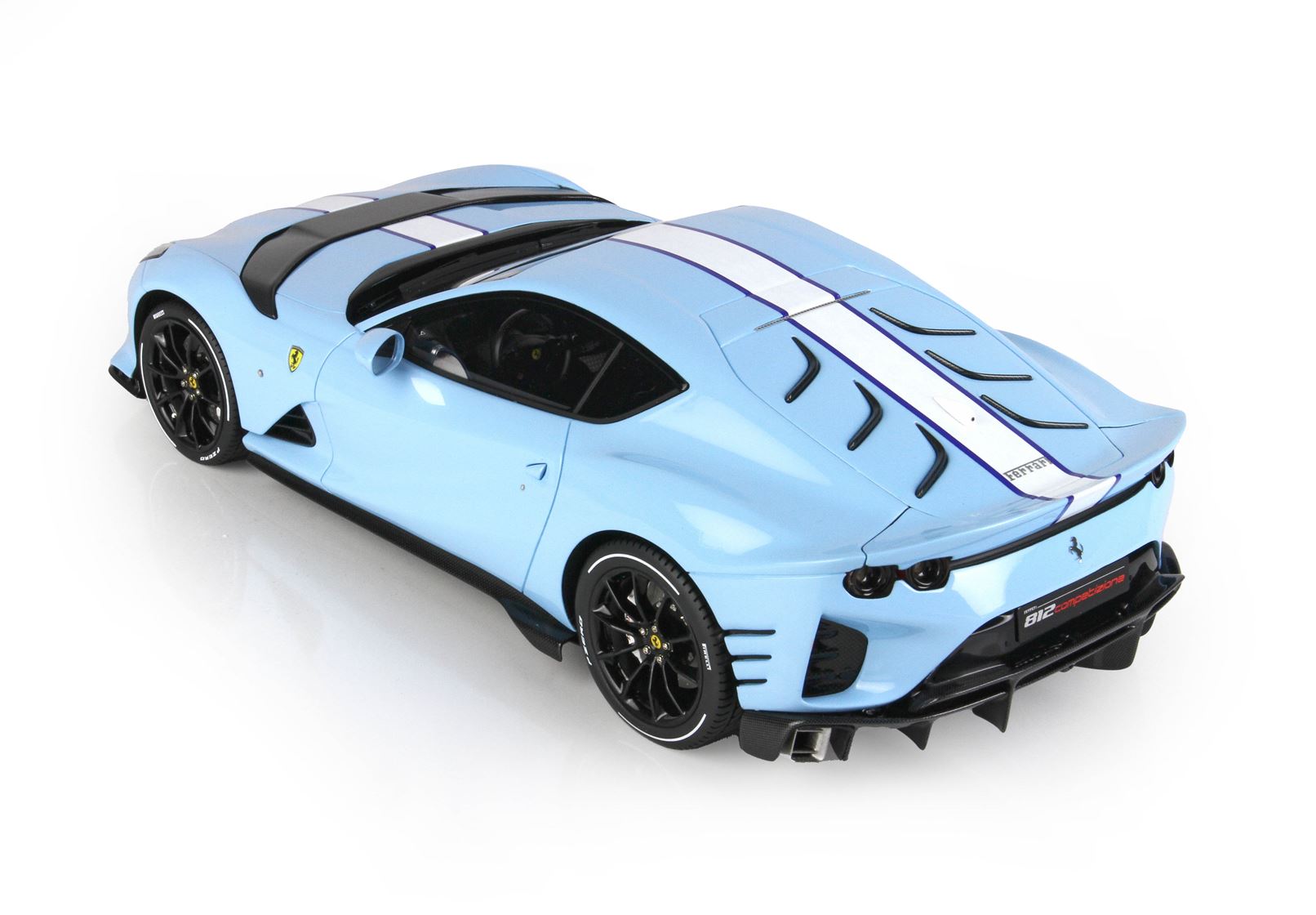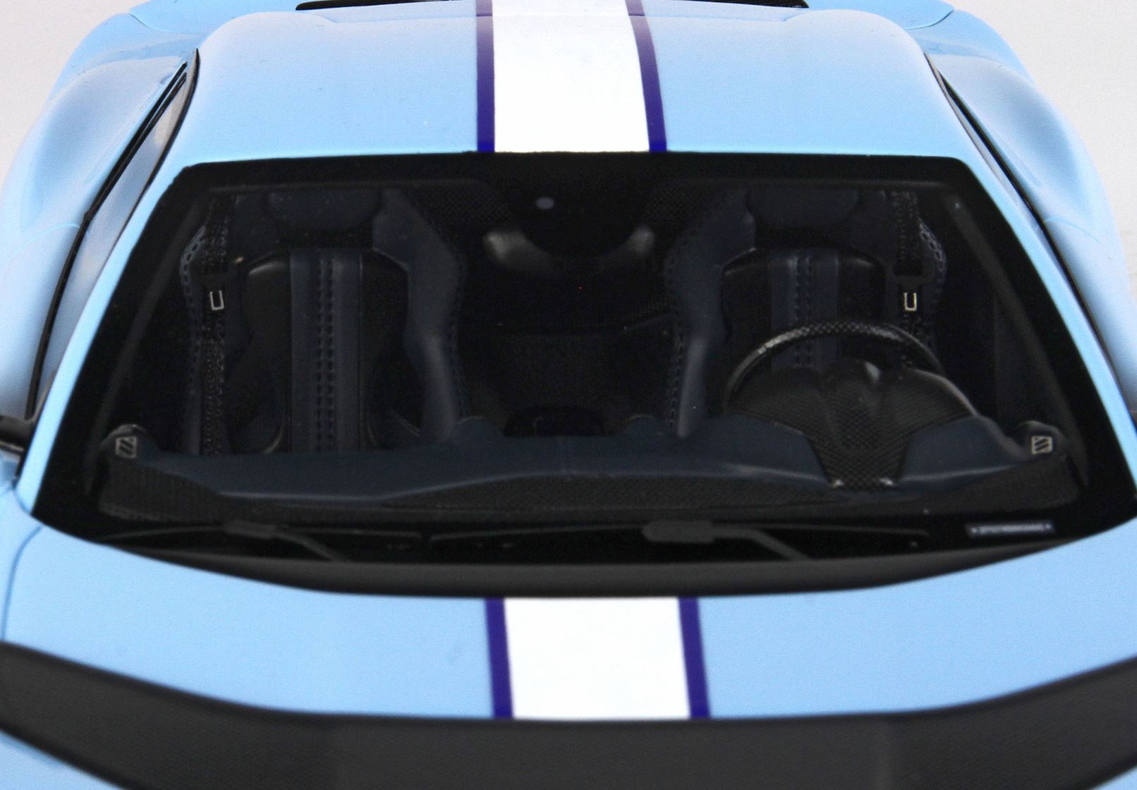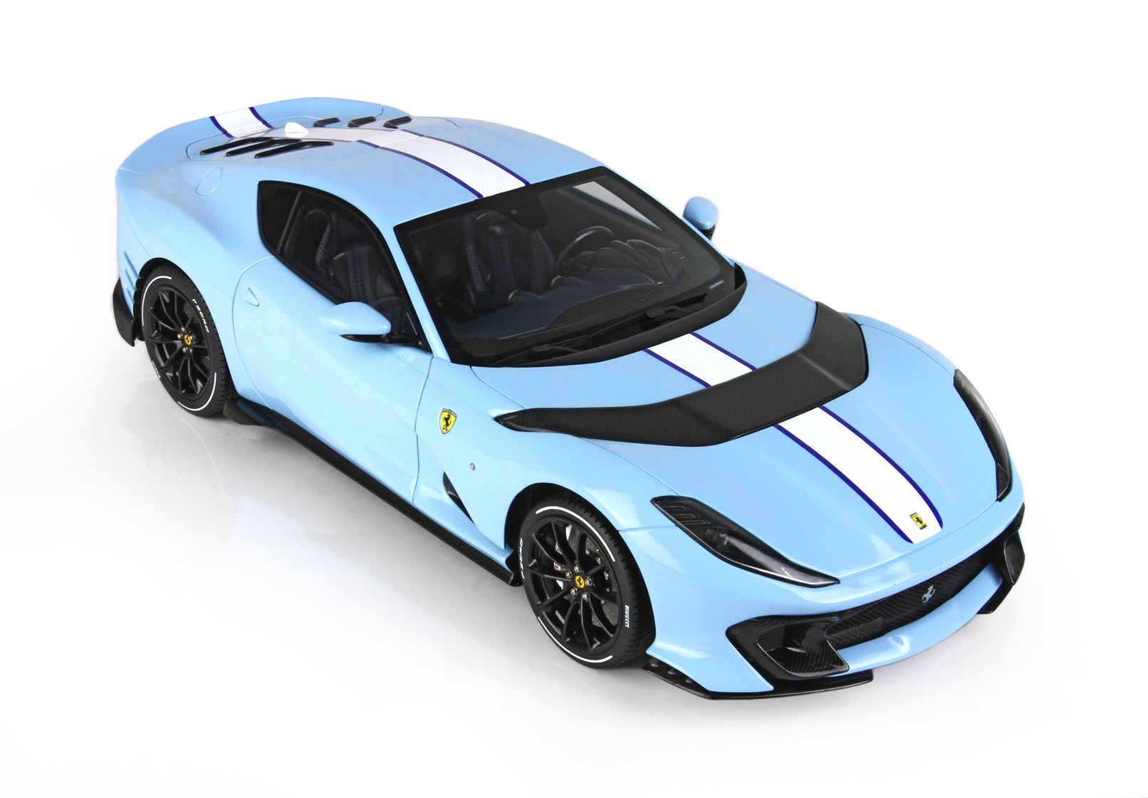 Colore Azzurro La Plata Lucido all'esterno, completato dalla striscia centrale bianca , interni in colore Blue Medio, replicata la fibra di Carbonio che sulla vettura vera è un optional.