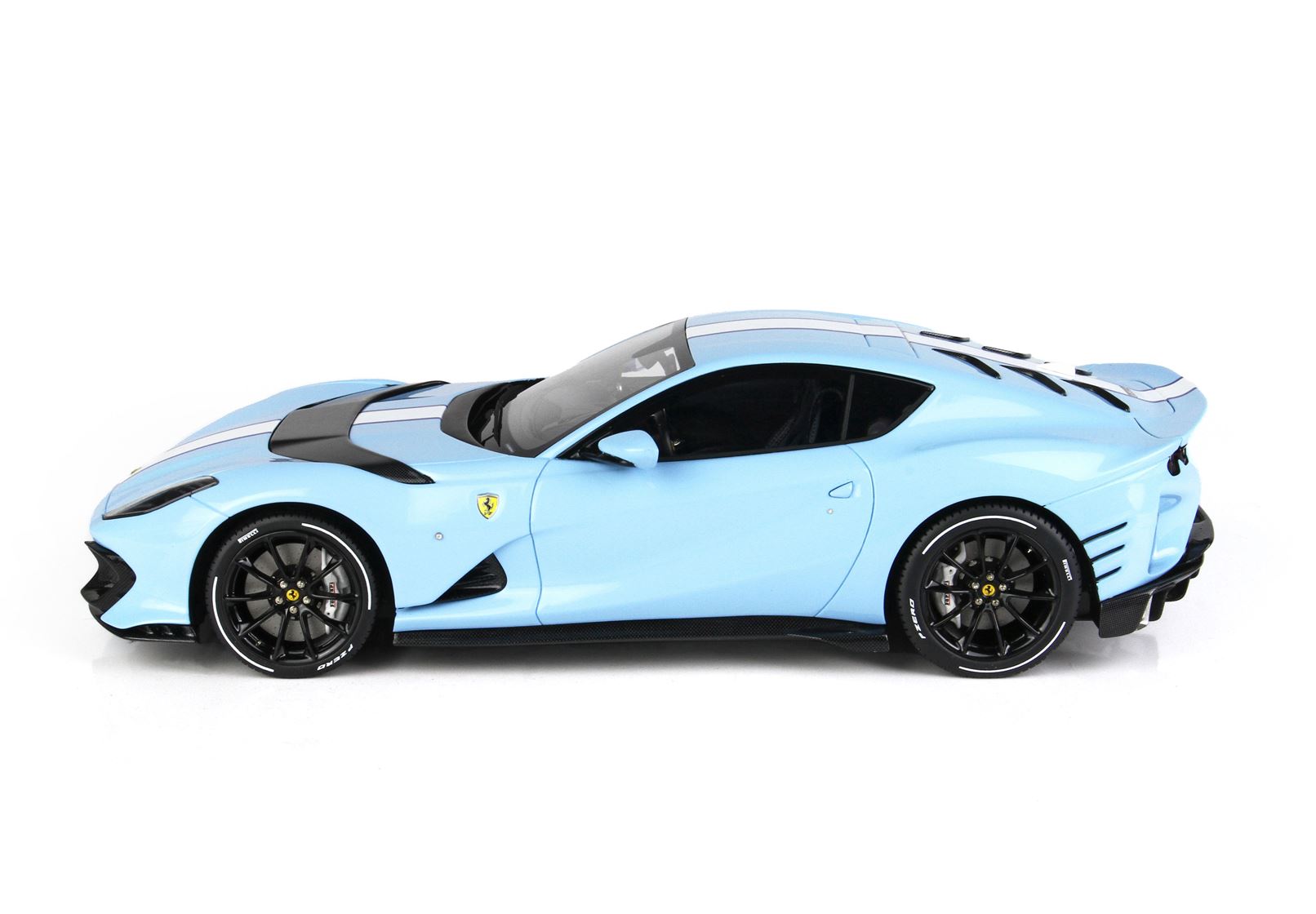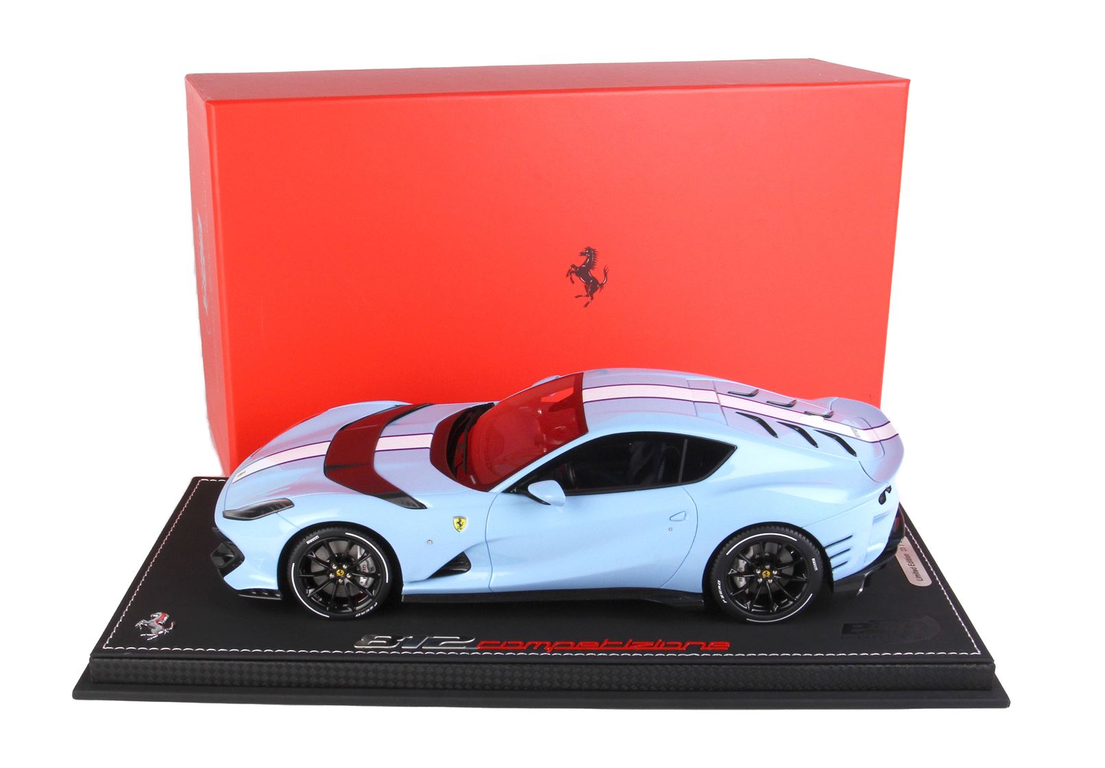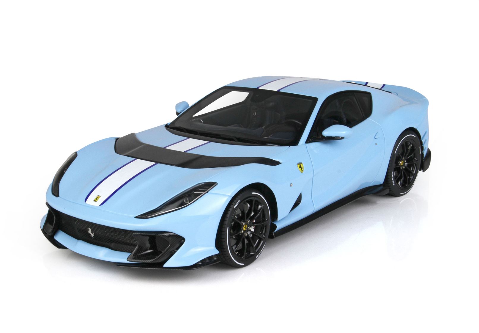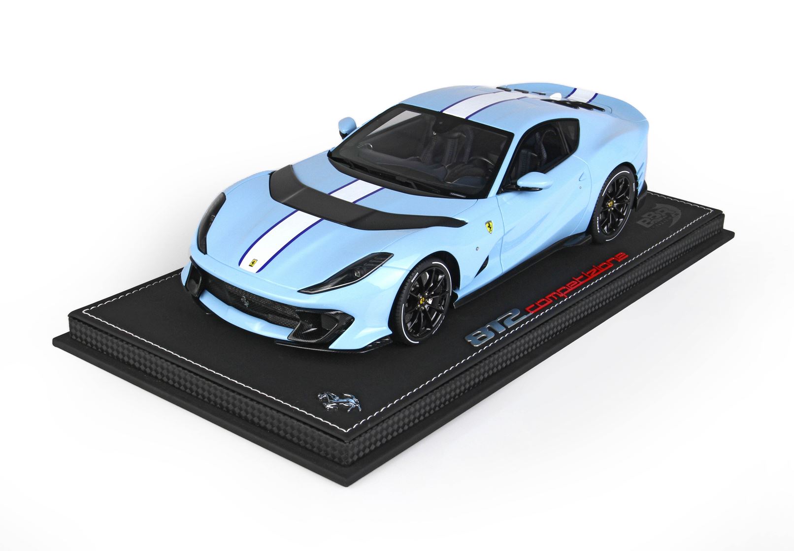 Colore Azzurro La Plata Lucido all'esterno, completato dalla striscia centrale bianca , interni in colore Blue Medio, replicata la fibra di Carbonio che sulla vettura vera è un optional.