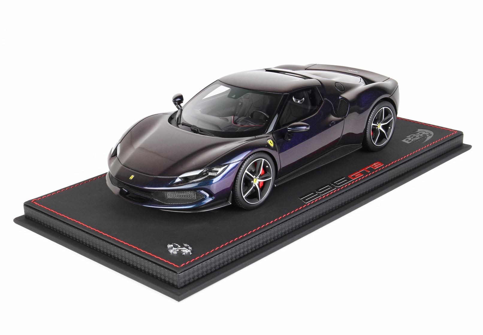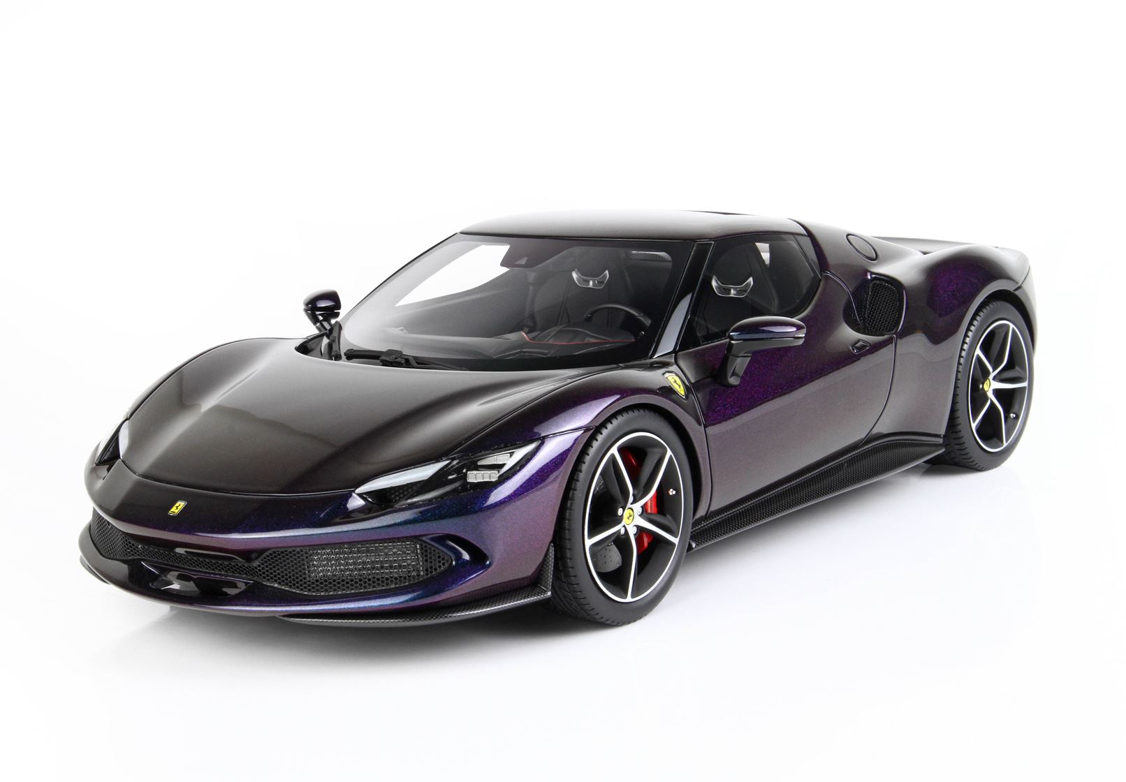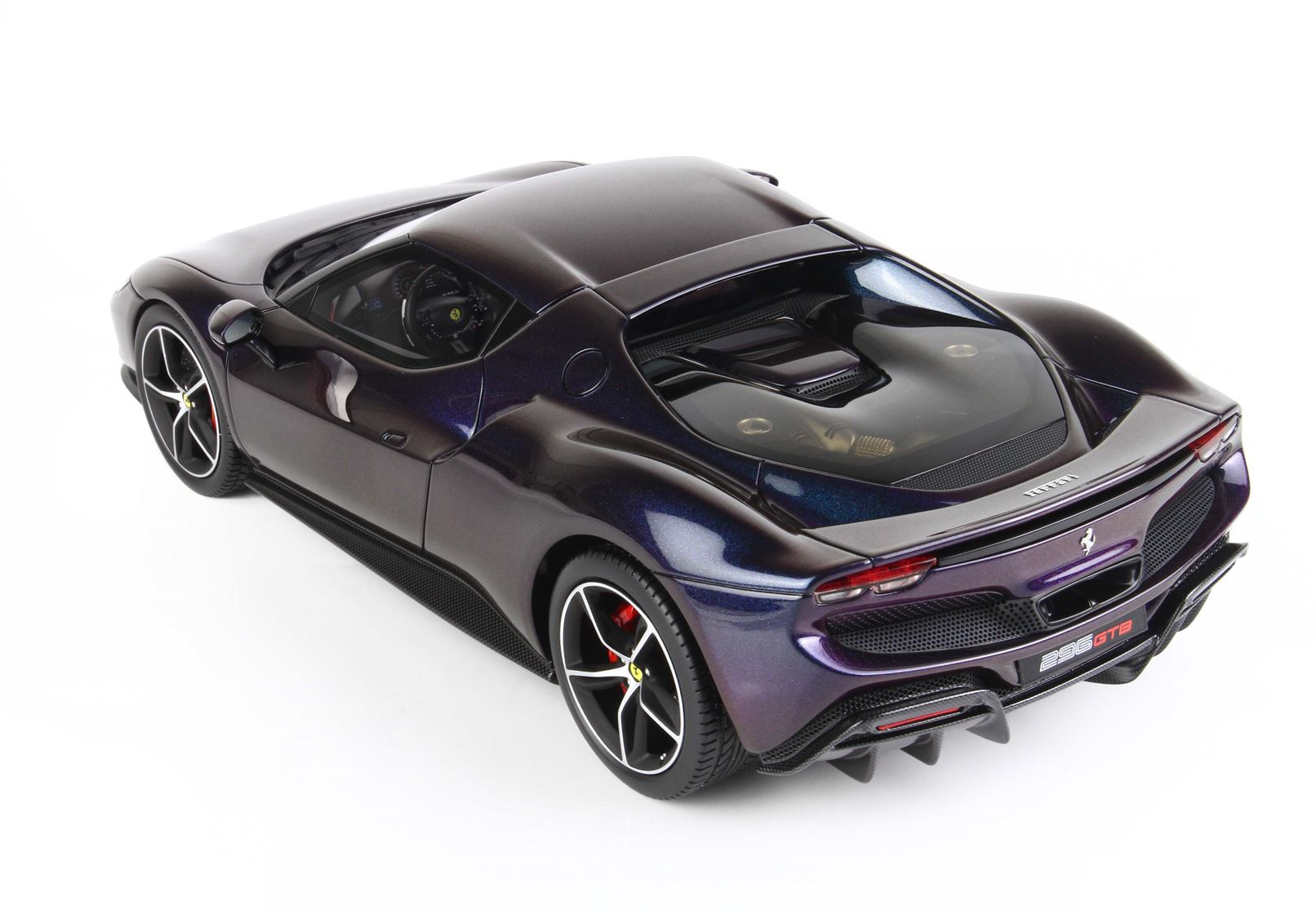 Here it is a version of the Ferrari 296 GTB in iridescent chameleon colour, which changes according to the display.