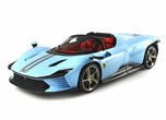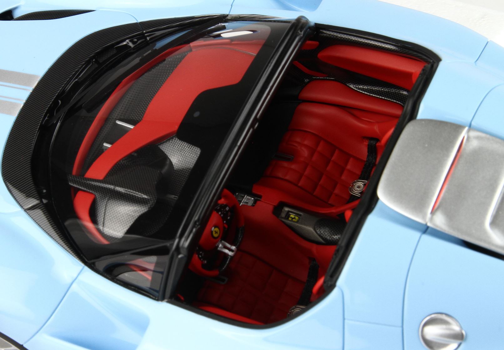 Qui vi proponiamo l’automodello in colore Azzurro La Plata, interni e cruscotto nel colore rosso Cartier opaco. Completa la livrea la striscia argento Nurburgring