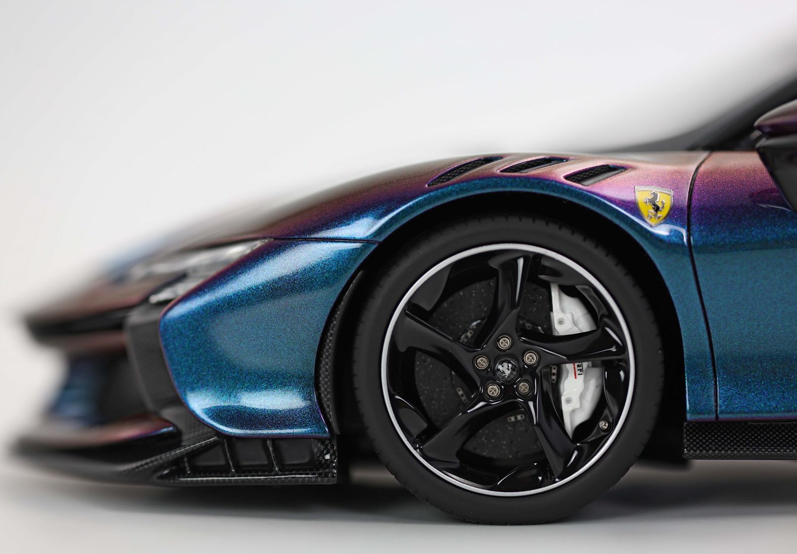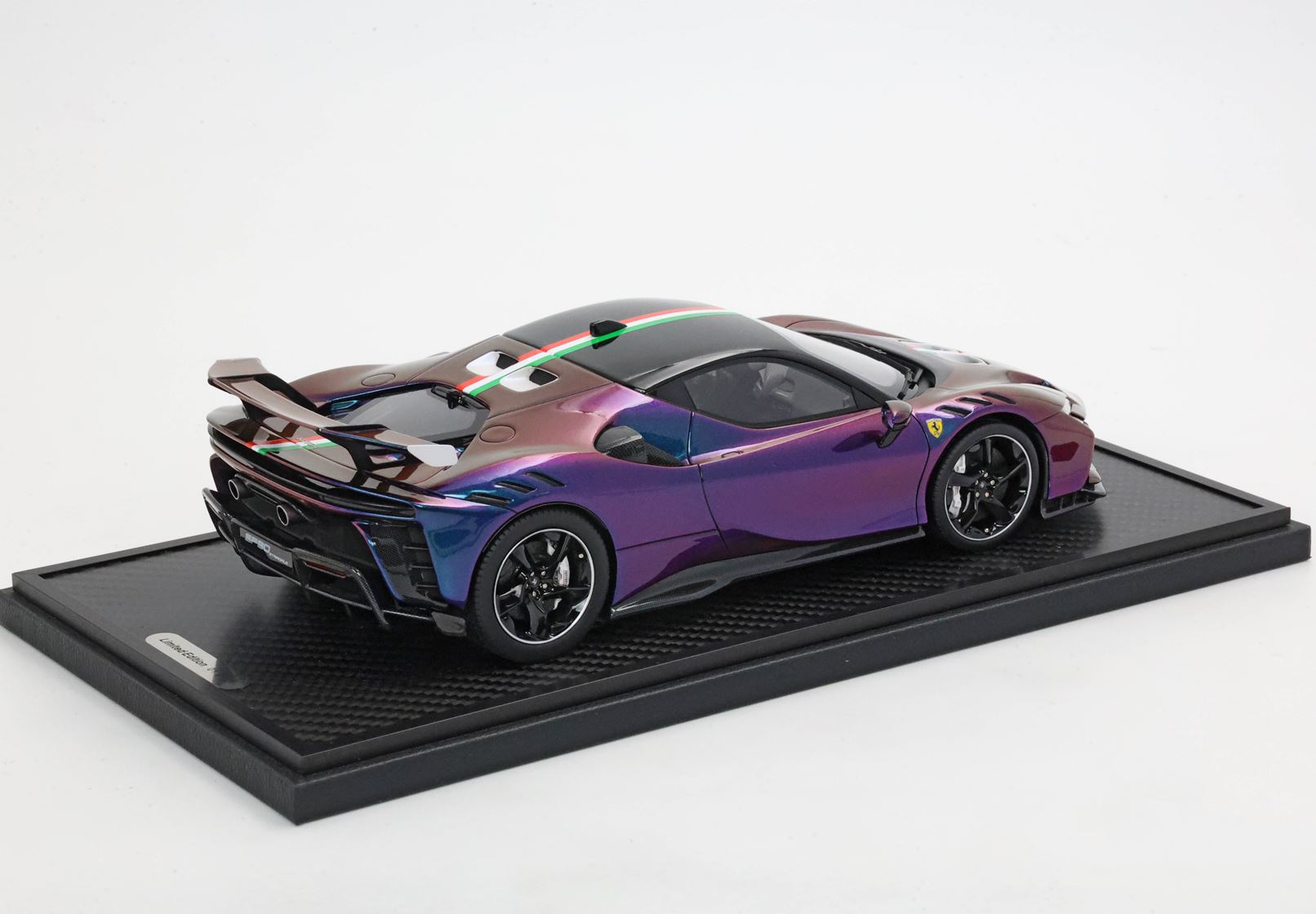 Cinque veri bulloni torniti in acciaio fissano ogni ruota, automodello posizionato su una base di vero Carbonio Opaco.