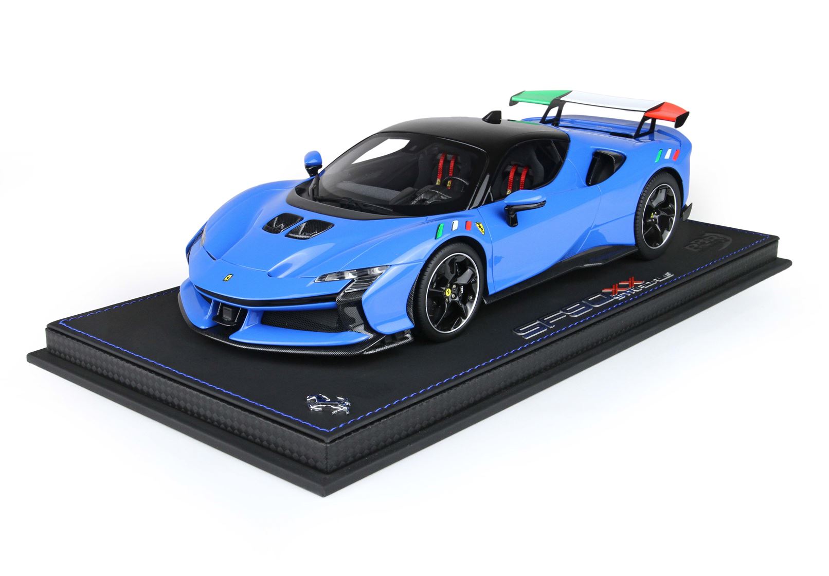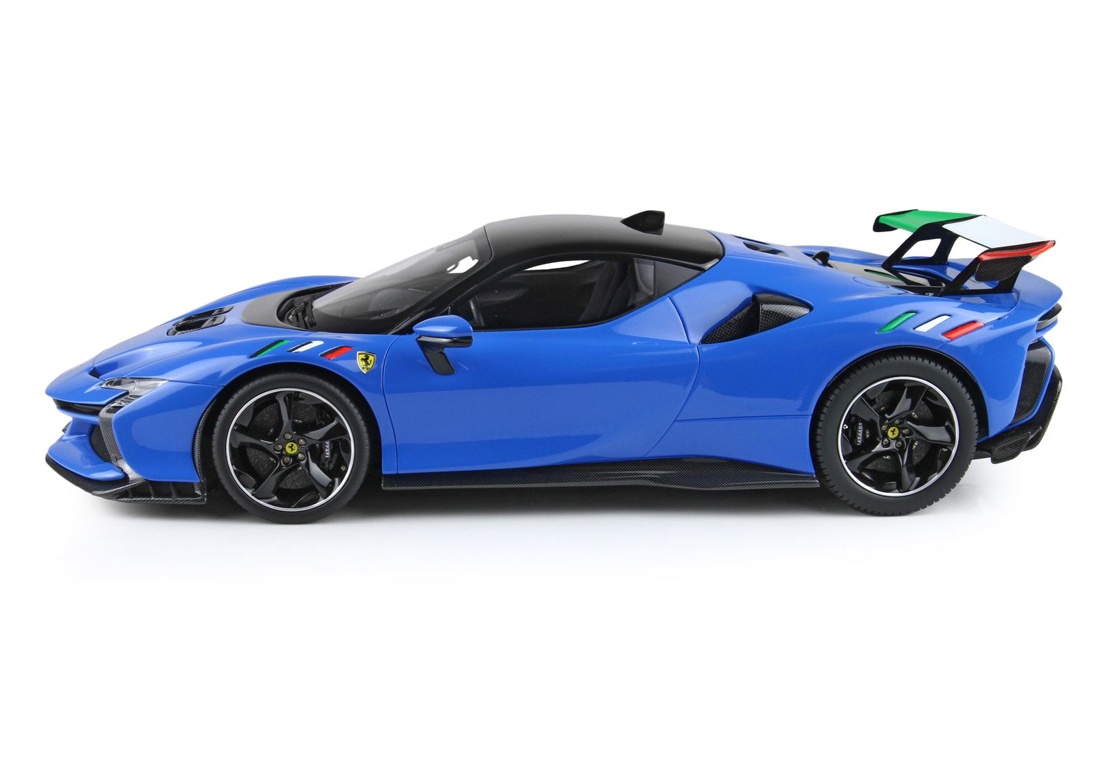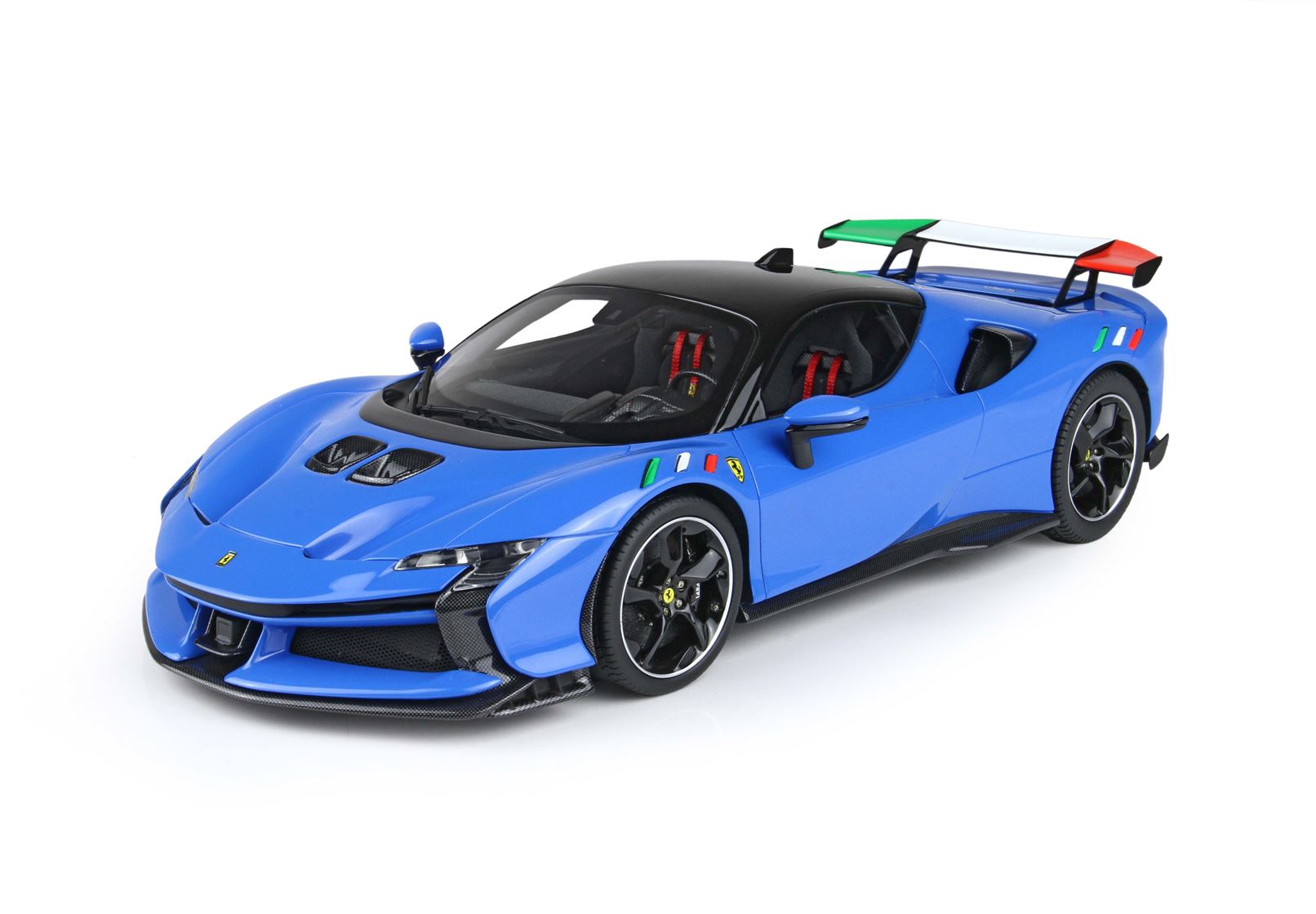 Questo modello in scala 1/18 della SF90XX celebra il tricolore italiano e l'azzurro. Una curiosità: tra i colori ufficiali Ferrari quello che più si avvicina all'azzurro delle maglie dei team sportivi italiani è il Blu Francia.