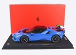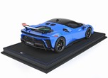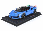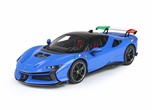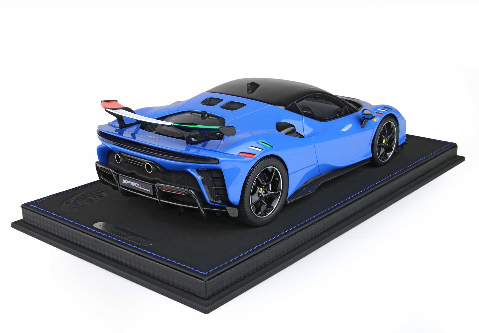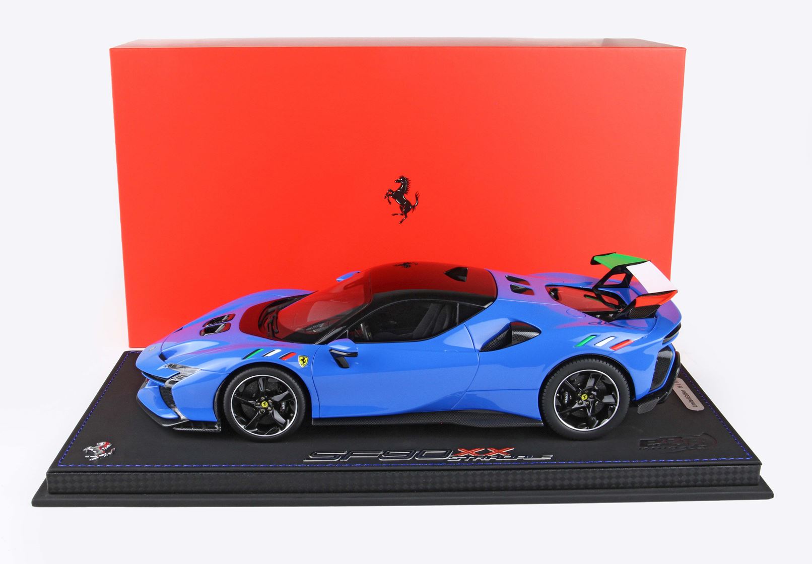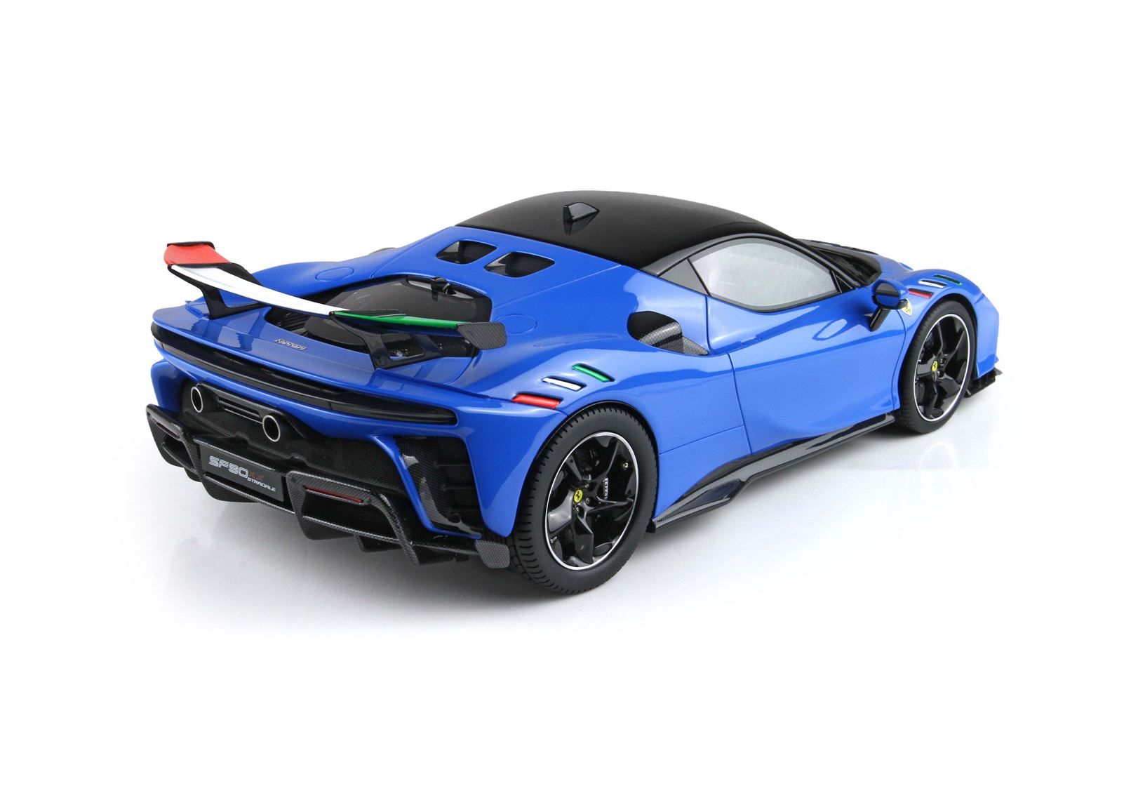 Questo modello in scala 1/18 della SF90XX celebra il tricolore italiano e l'azzurro. Una curiosità: tra i colori ufficiali Ferrari quello che più si avvicina all'azzurro delle maglie dei team sportivi italiani è il Blu Francia.