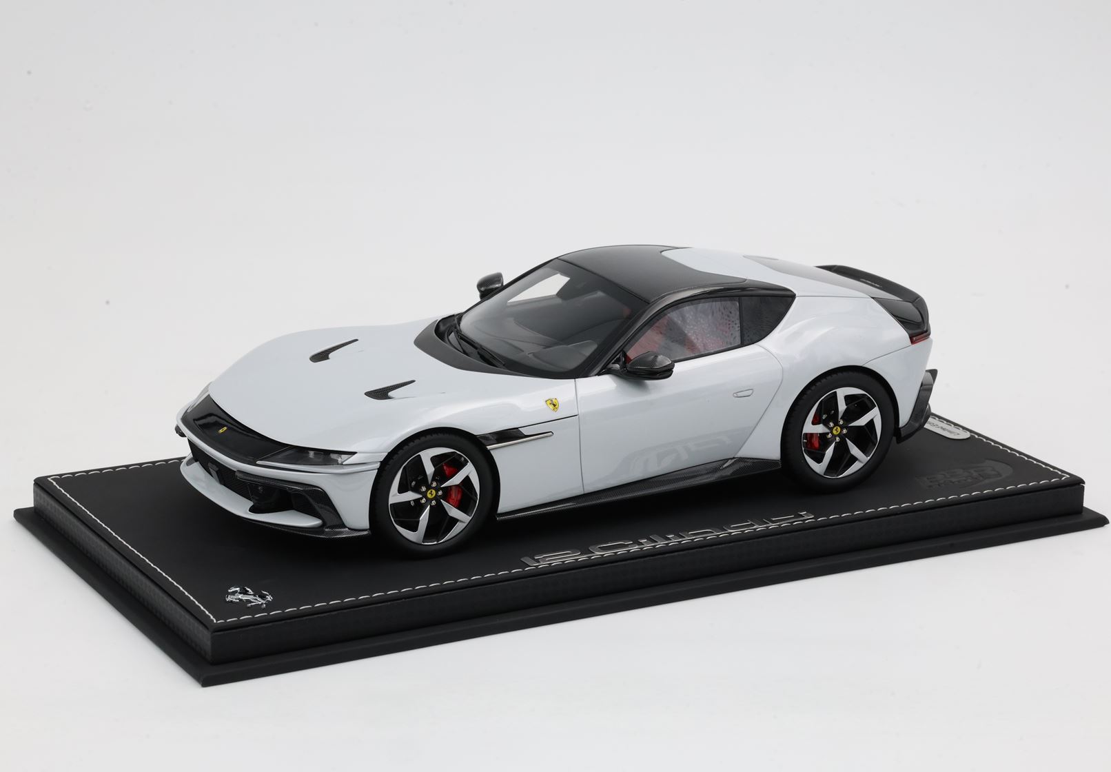 The essential lines become muscular by the wheel arches. The rear one, prominent but without excess, is perfectly integrated into the geometry of the car. The front one, with clear reference to the 365GTB Daytona, shows its sinuous charm by embellishing the side. At the front, a single wraparound band integrates the headlights and DRLs like two blades of light. Proportions are perfect for a GT: very long nose, compact cockpit and short rear.