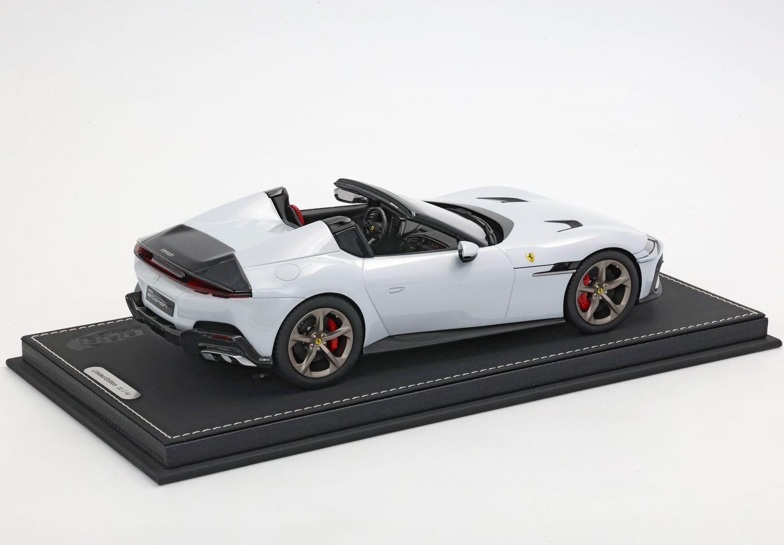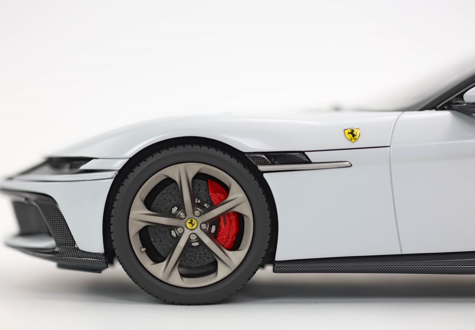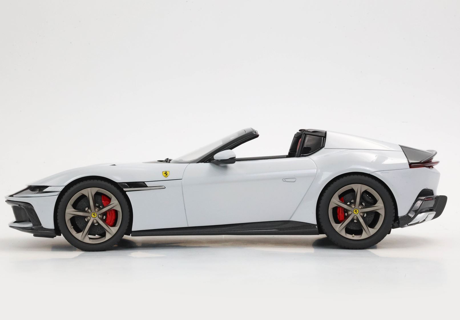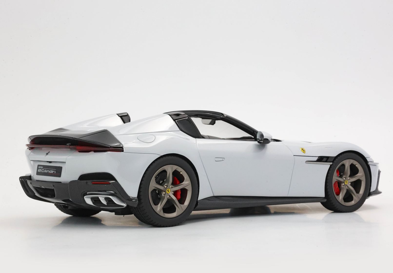 The shapes of the two rear "fins" constitute the main character of the Ferrari 12Cilindri Spider. The essential lines become muscular by the wheel arches. The rear one, prominent but without excess, is perfectly integrated into the geometry of the car. The front one, with clear reference to the 365GTB Daytona, shows its sinuous charm by embellishing the side. At the front, a single wraparound band integrates the headlights and DRLs like two blades of light. Proportions are perfect for a GT: very long nose, compact cockpit and short rear.