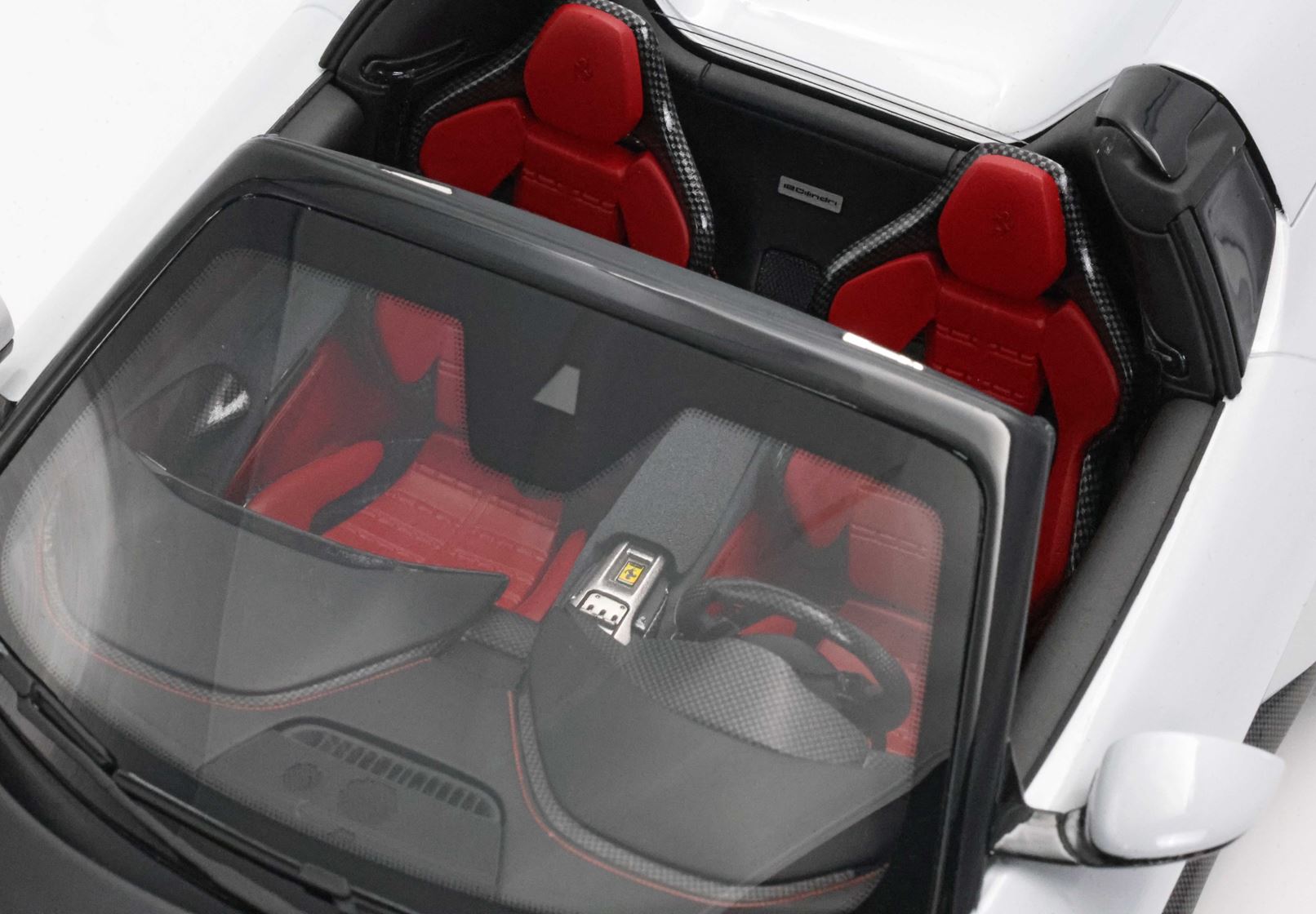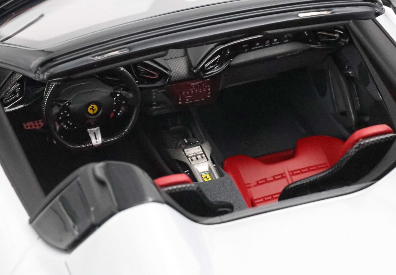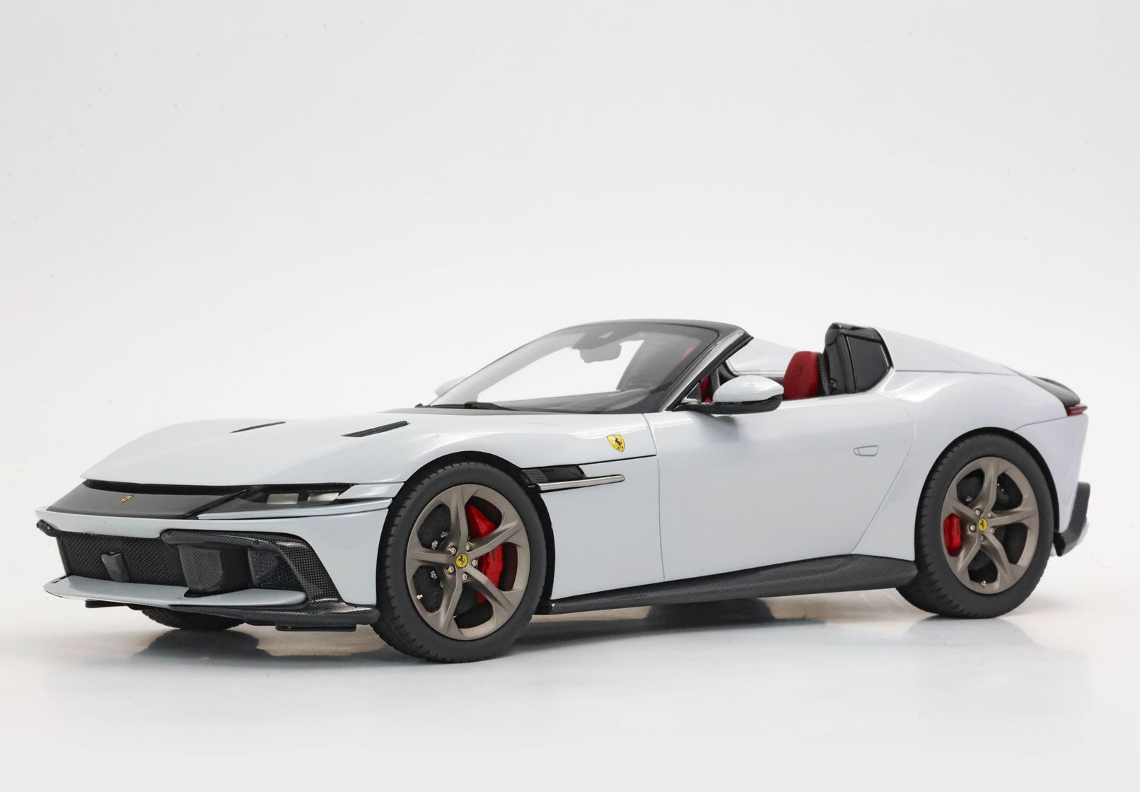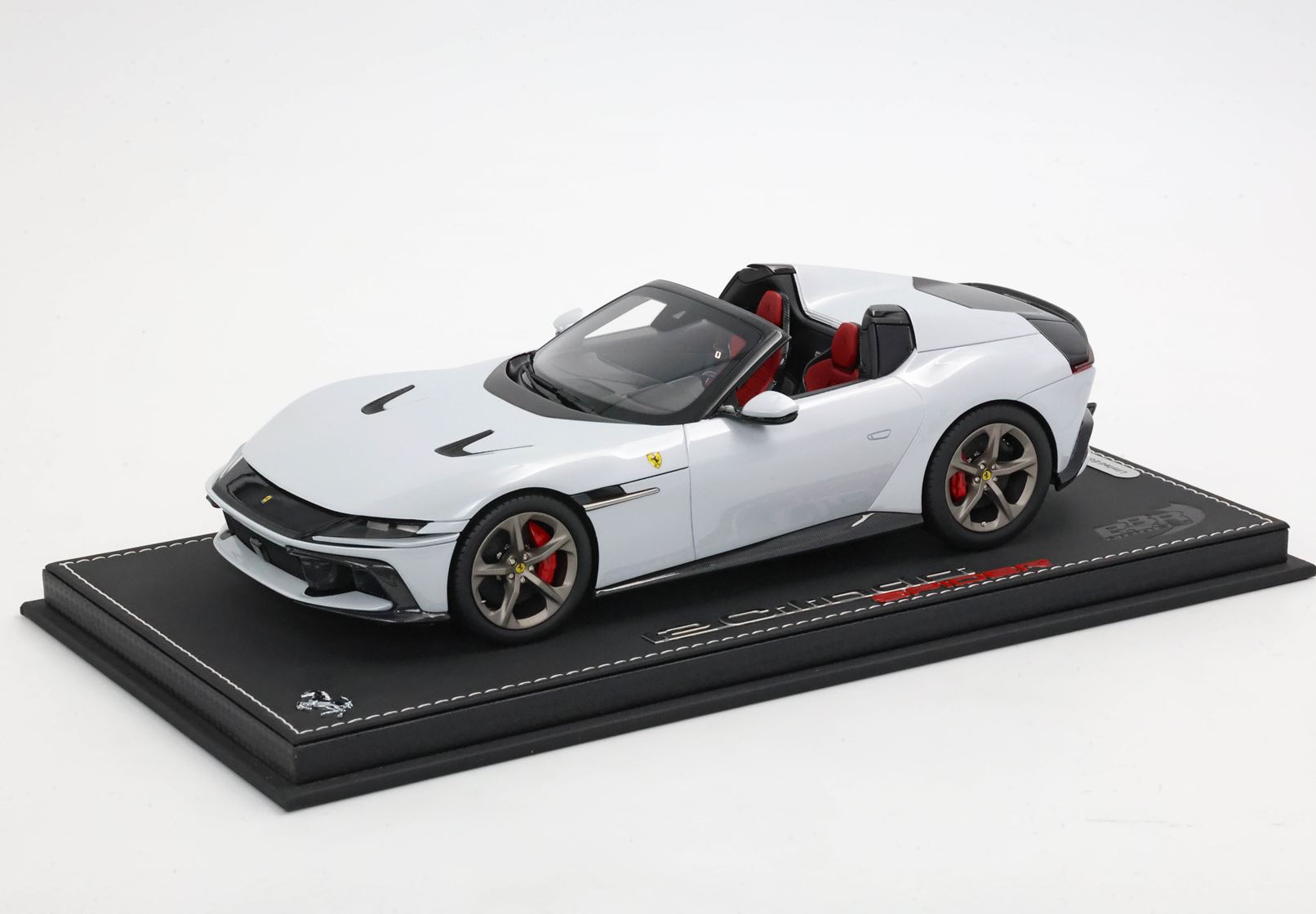 The shapes of the two rear "fins" constitute the main character of the Ferrari 12Cilindri Spider. The essential lines become muscular by the wheel arches. The rear one, prominent but without excess, is perfectly integrated into the geometry of the car. The front one, with clear reference to the 365GTB Daytona, shows its sinuous charm by embellishing the side. At the front, a single wraparound band integrates the headlights and DRLs like two blades of light. Proportions are perfect for a GT: very long nose, compact cockpit and short rear.