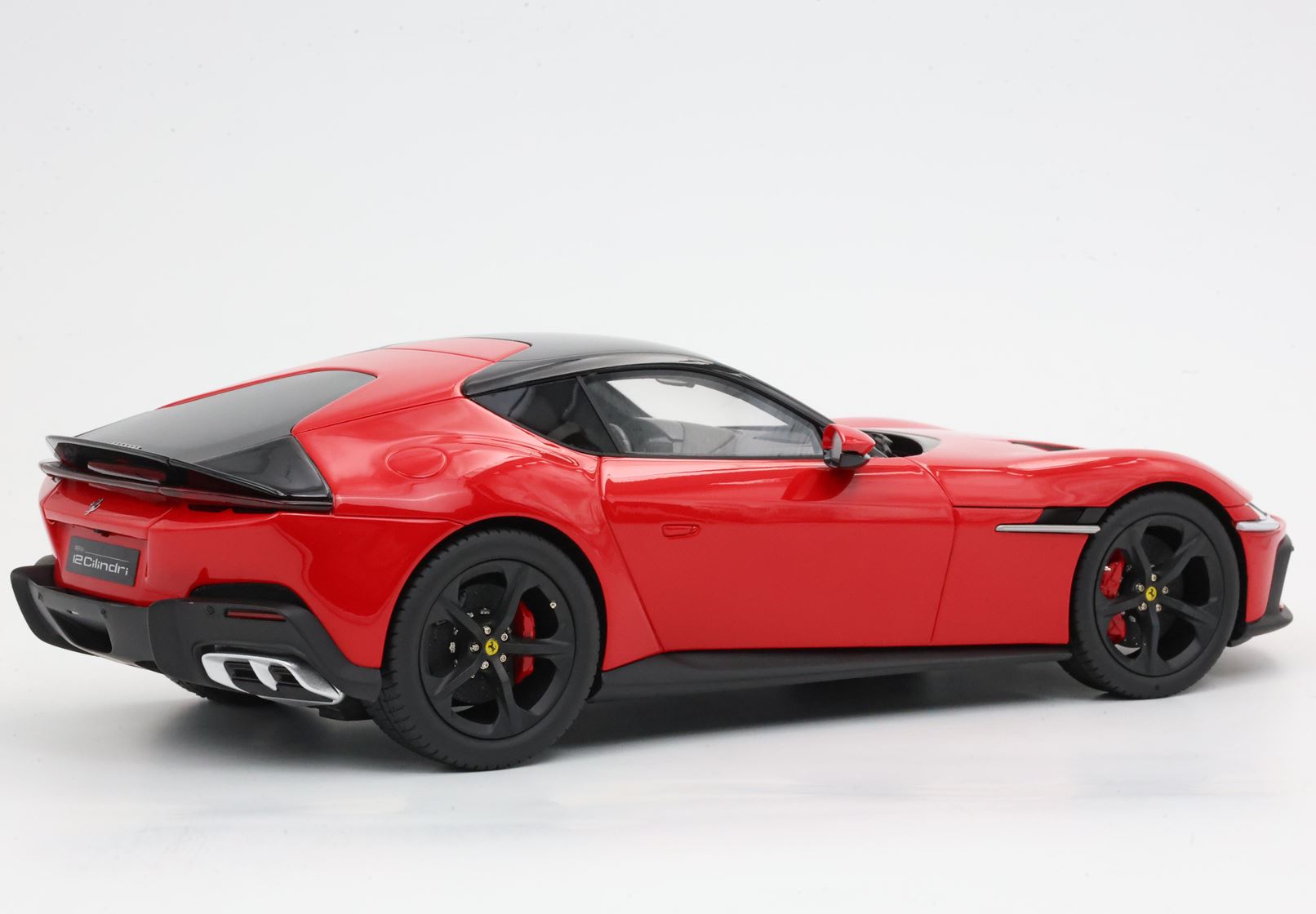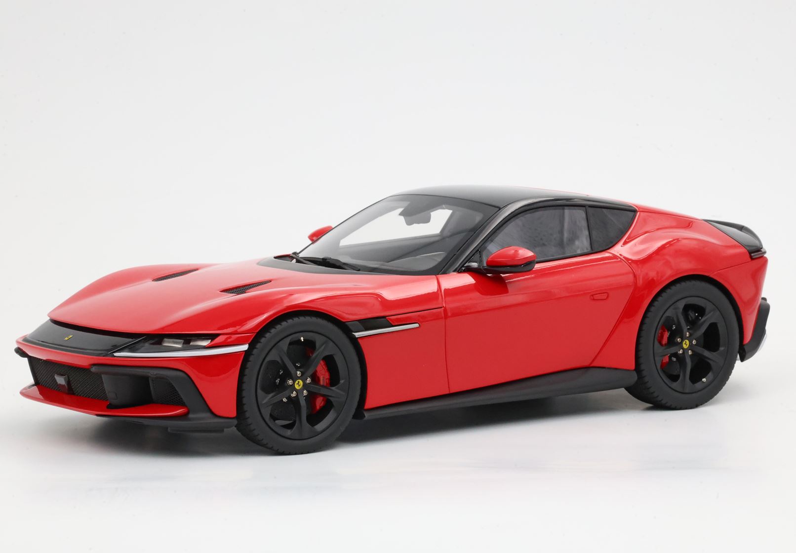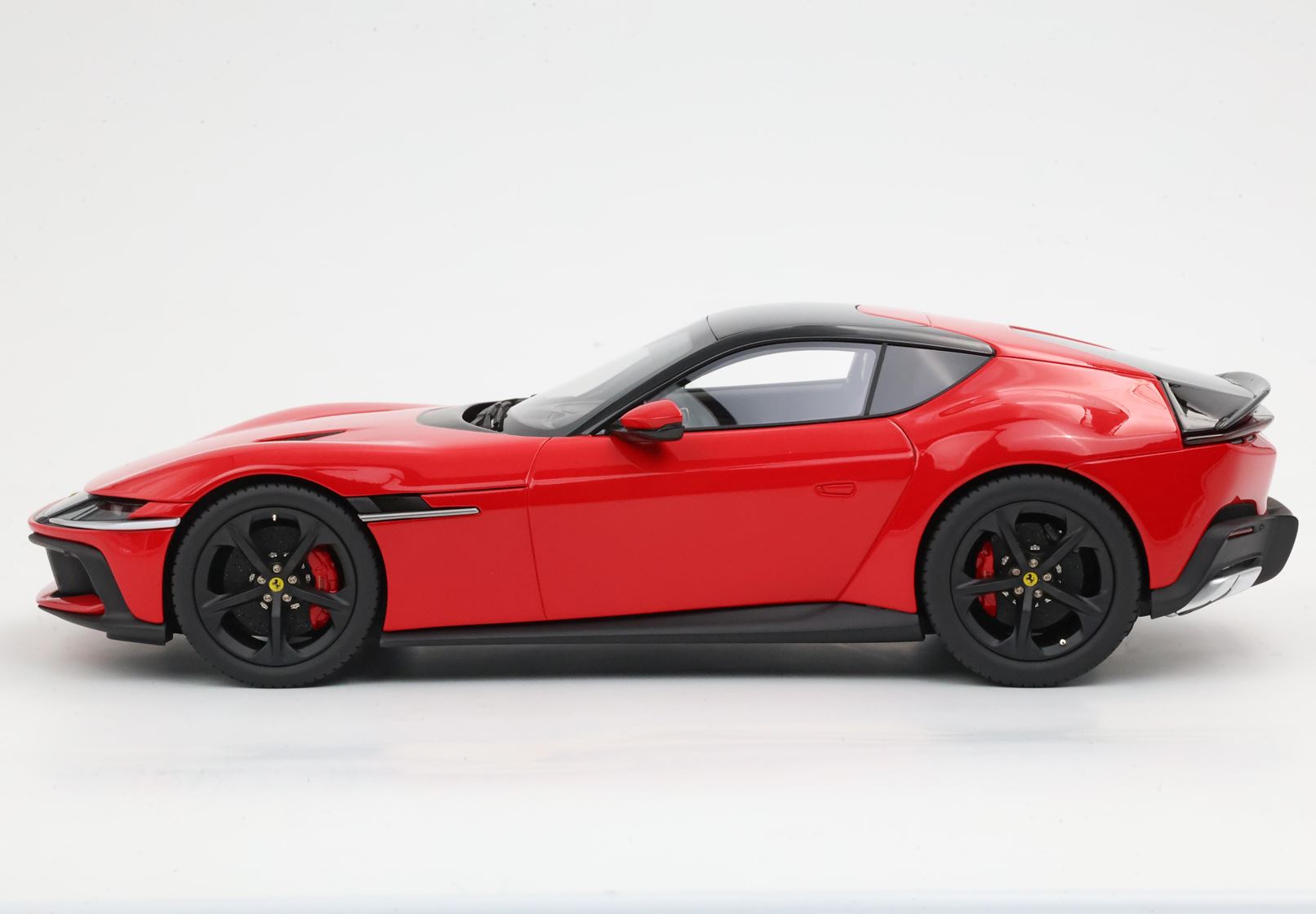 The essential lines become muscular by the wheel arches. The rear one, prominent but without excess, is perfectly integrated into the geometry of the car. The front one, with clear reference to the 365GTB Daytona, shows its sinuous charm by embellishing the side. At the front, a single wraparound band integrates the headlights and DRLs like two blades of light. Proportions are perfect for a GT: very long nose, compact cockpit and short rear.