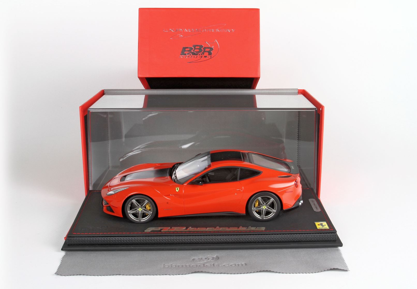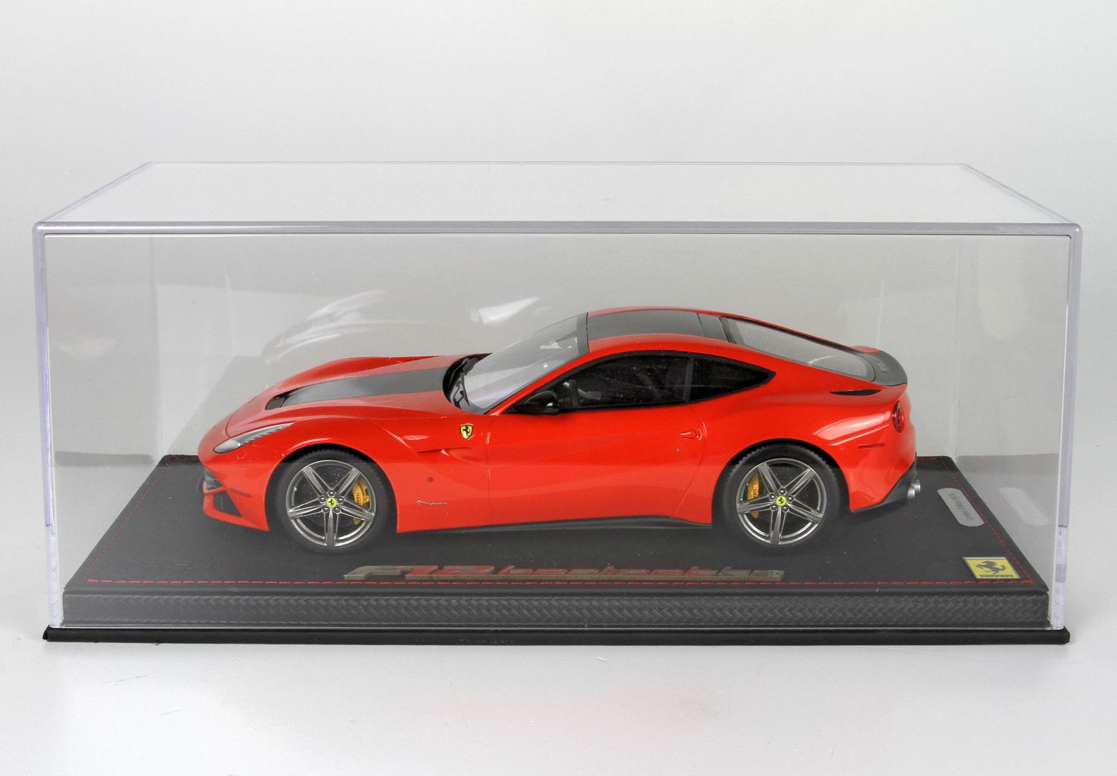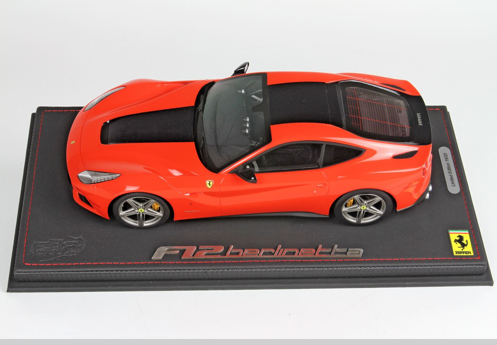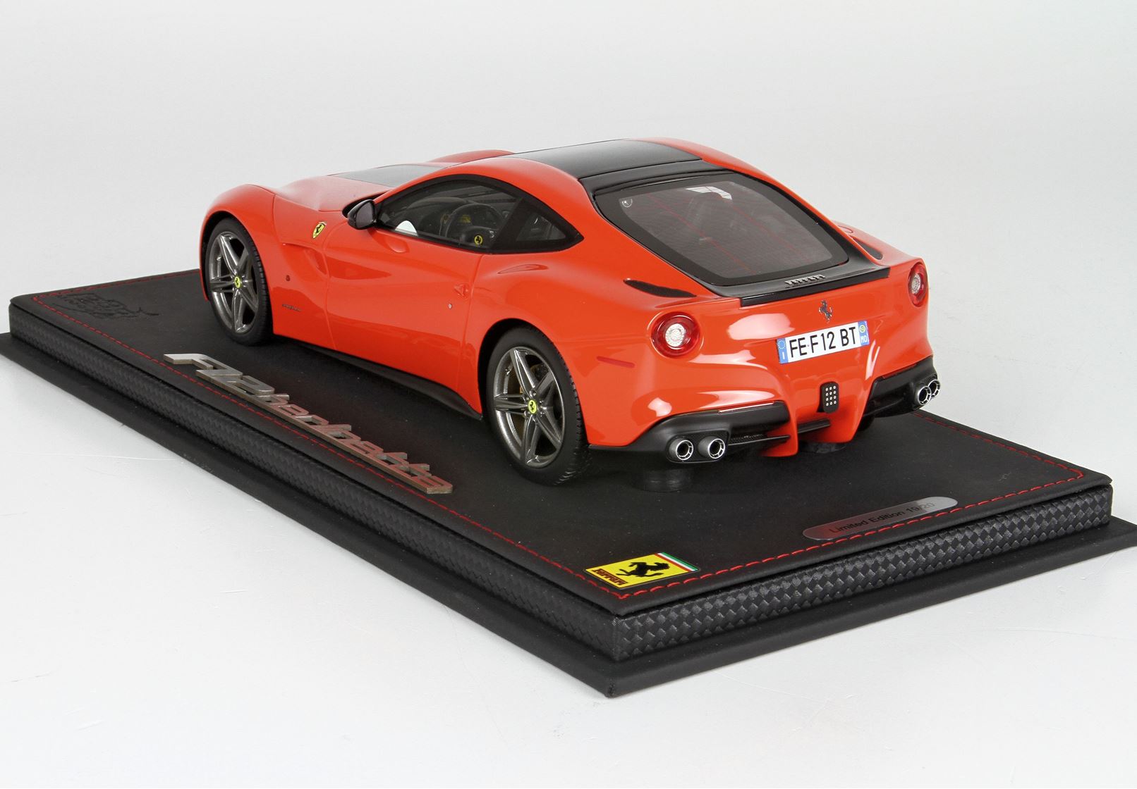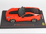 This model replicas the real Ferrari F12 Berlinetta in the color red Ferrari Dino, with a special black stripe covering the hood, the roof and rear part.