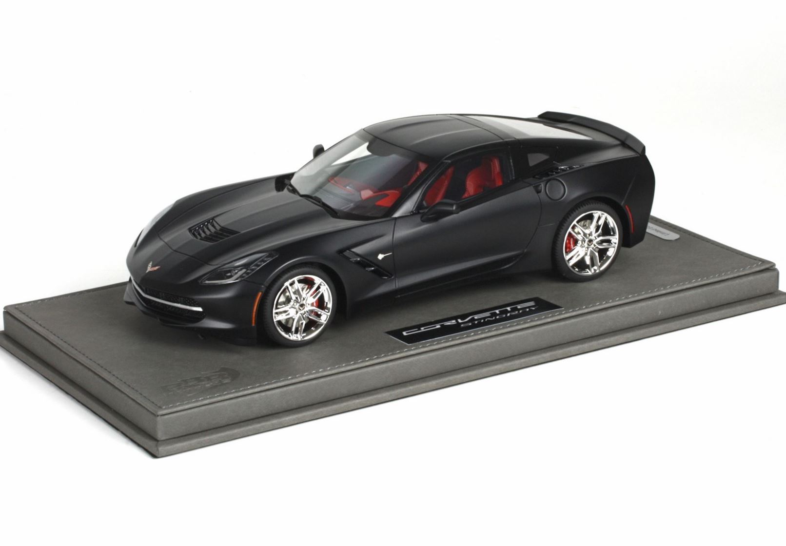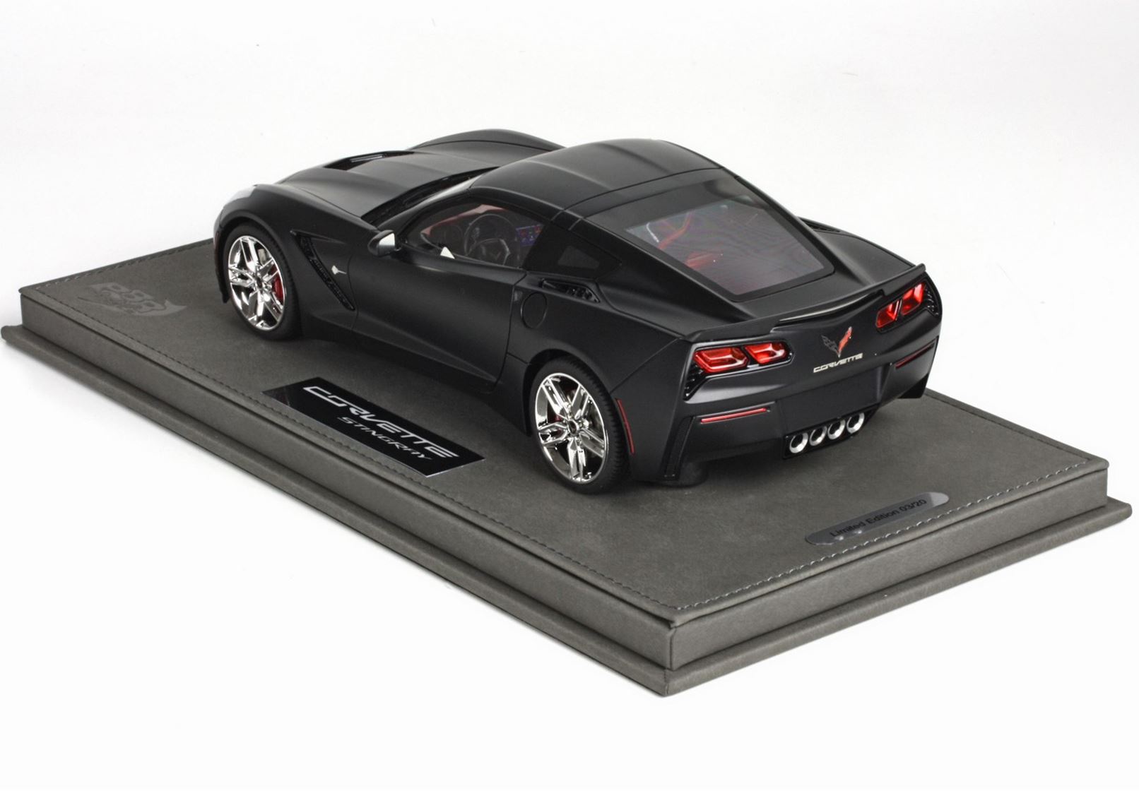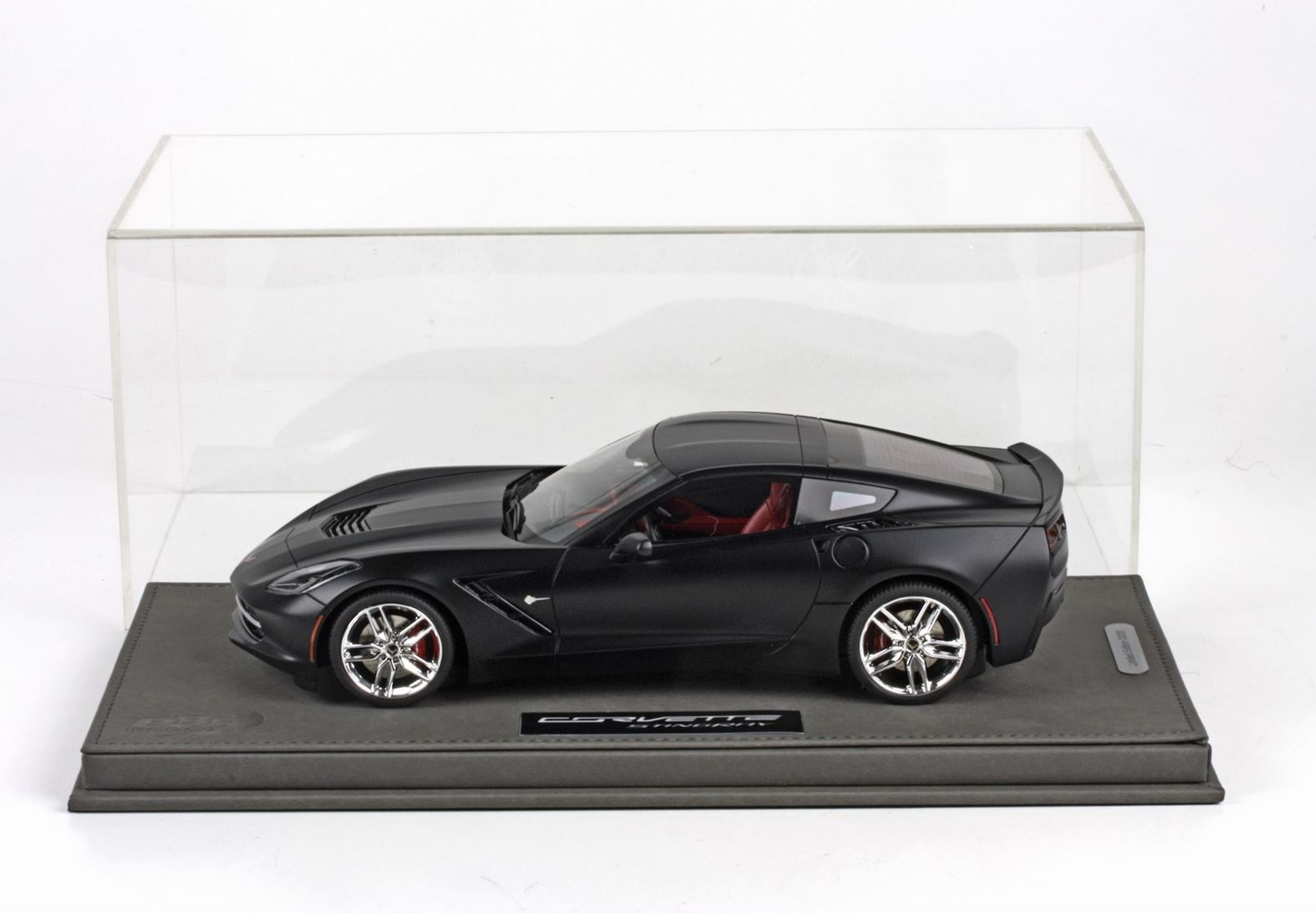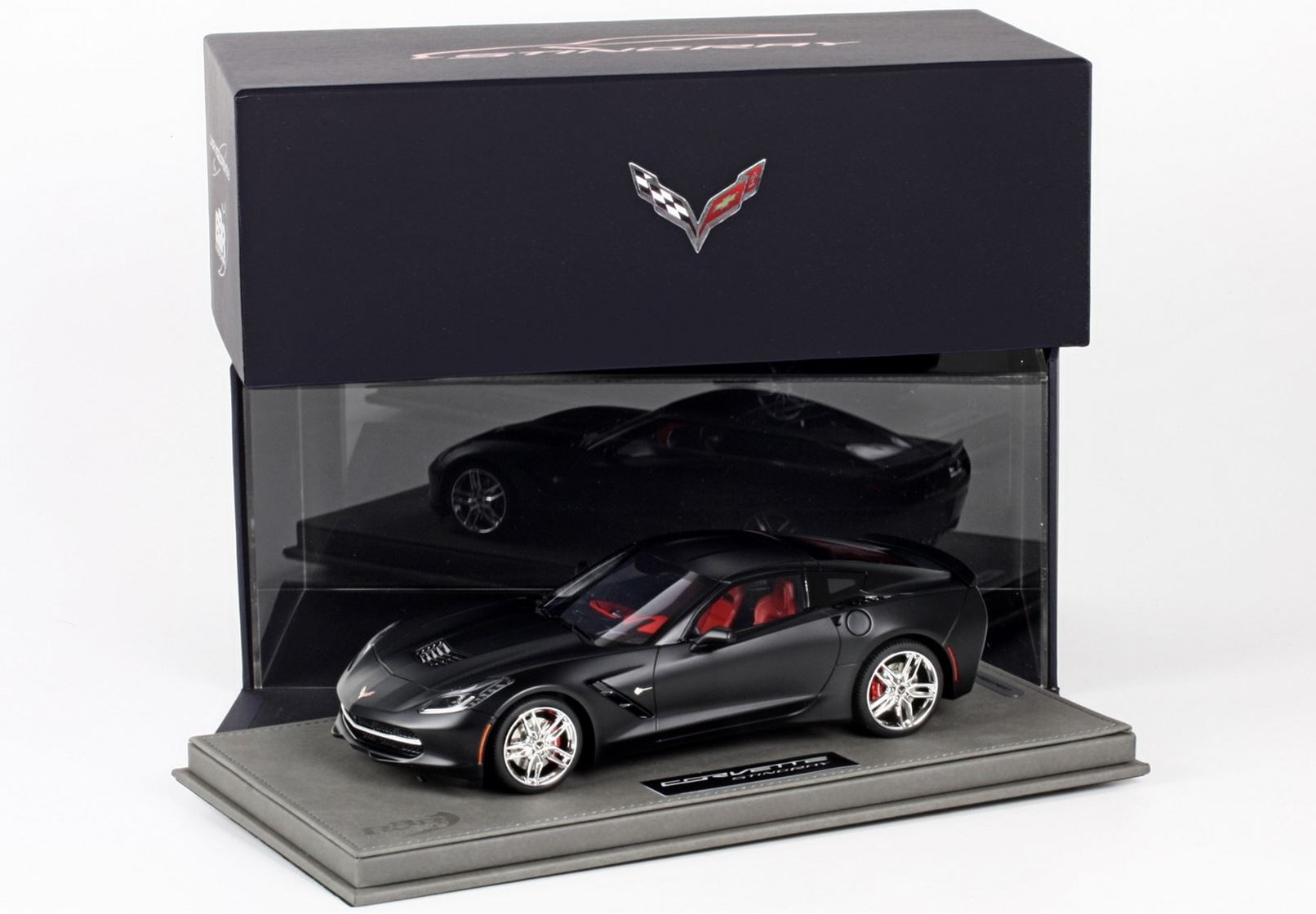Outer packaging in paper and soft touch with chrome Chevrolet logo. Model is protected with a hand made plexiglass display case.