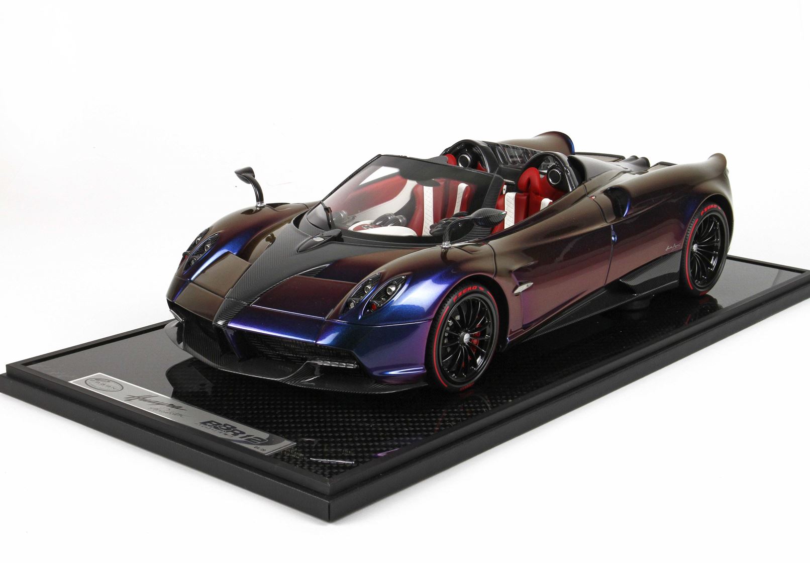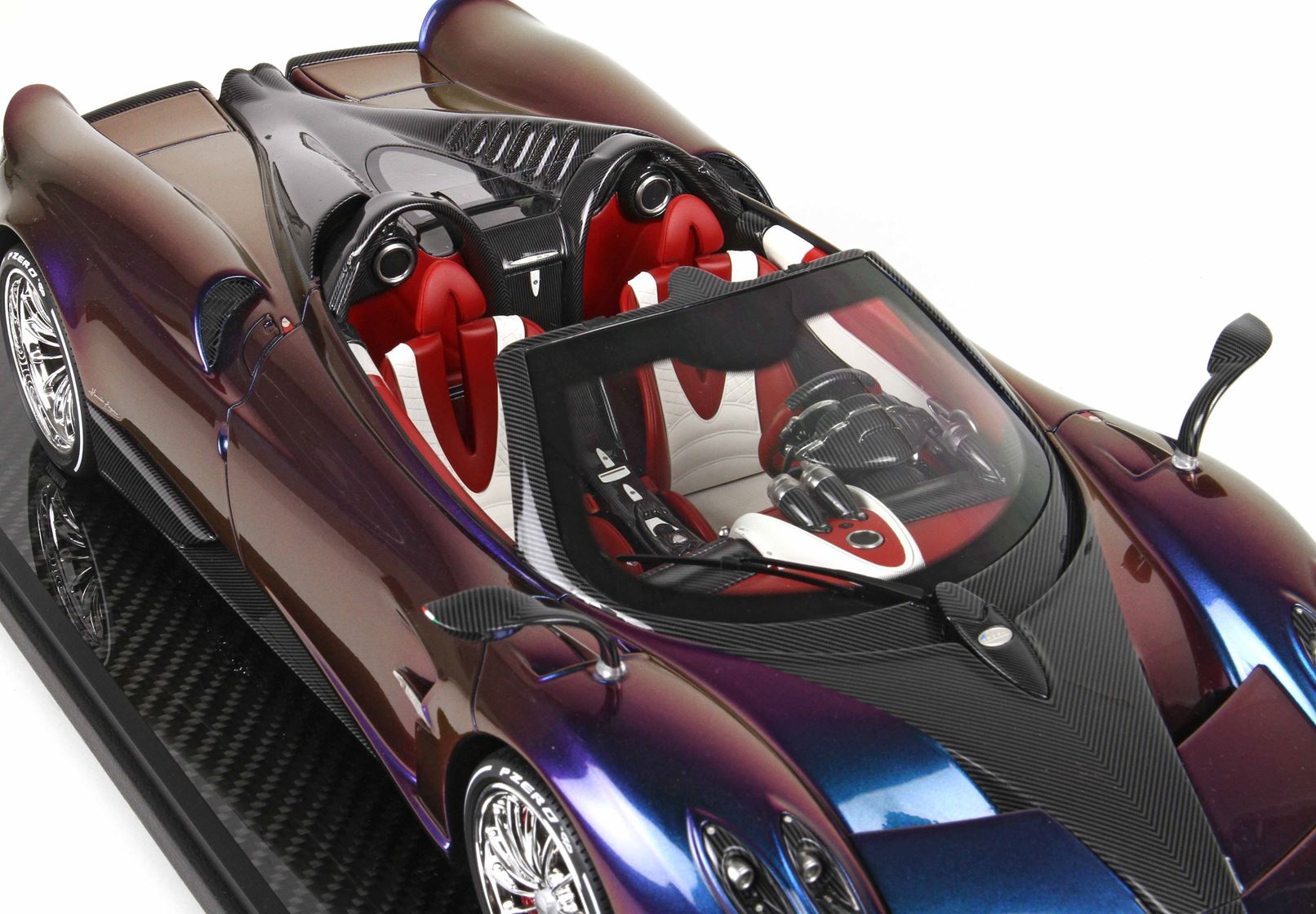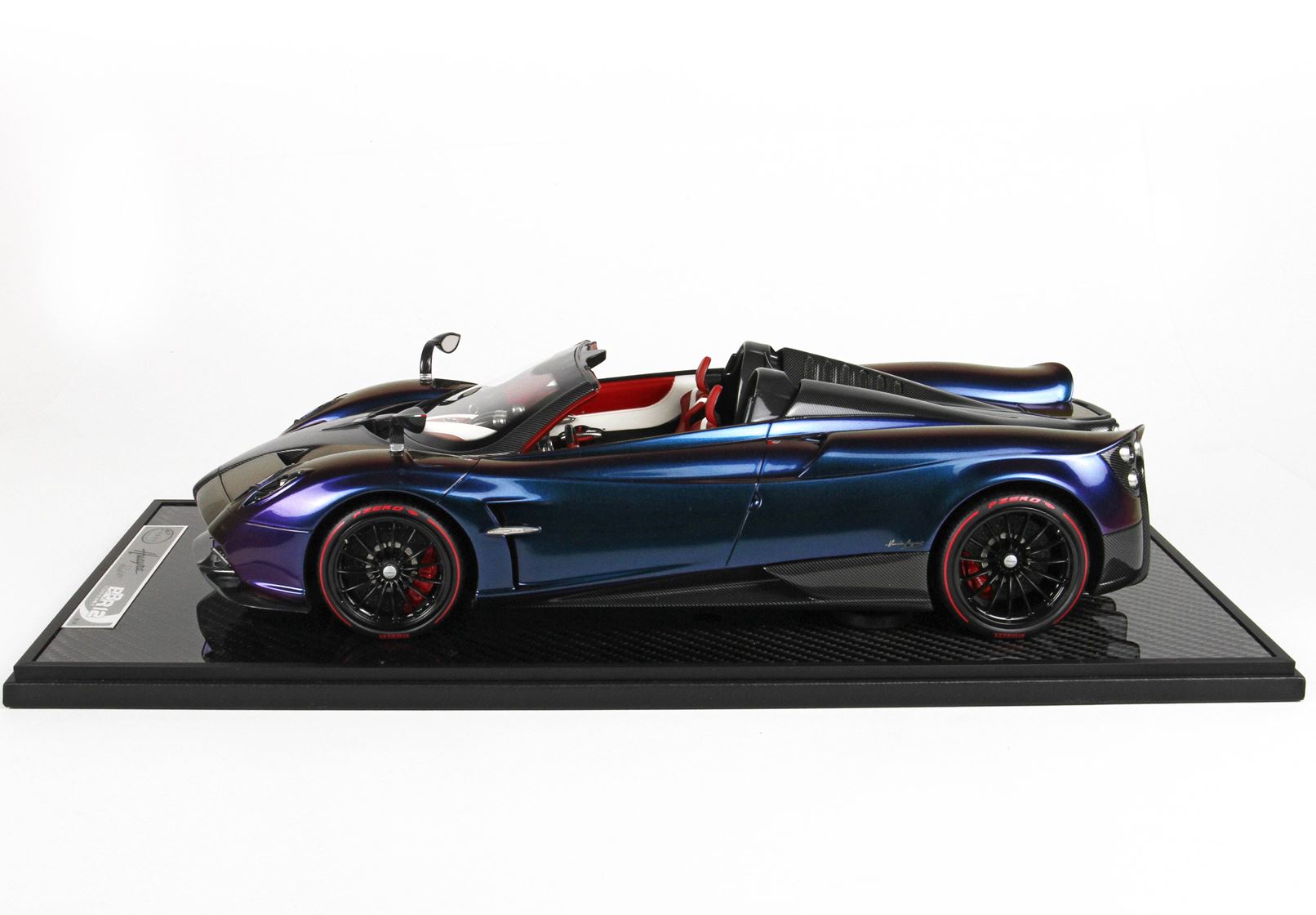 questo automodello replica fedelmente in ogni particolare la Huayra Spider, da notare la differente colorazione dei cerchi destri e sinistri