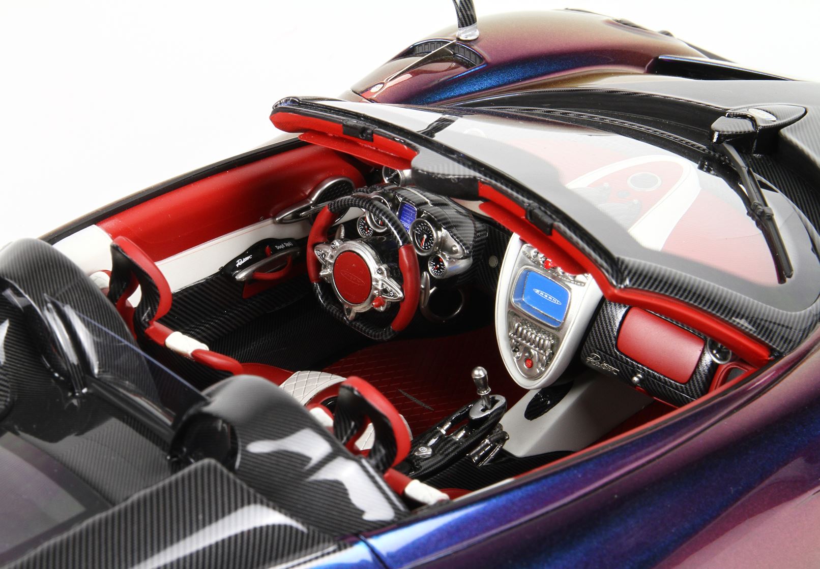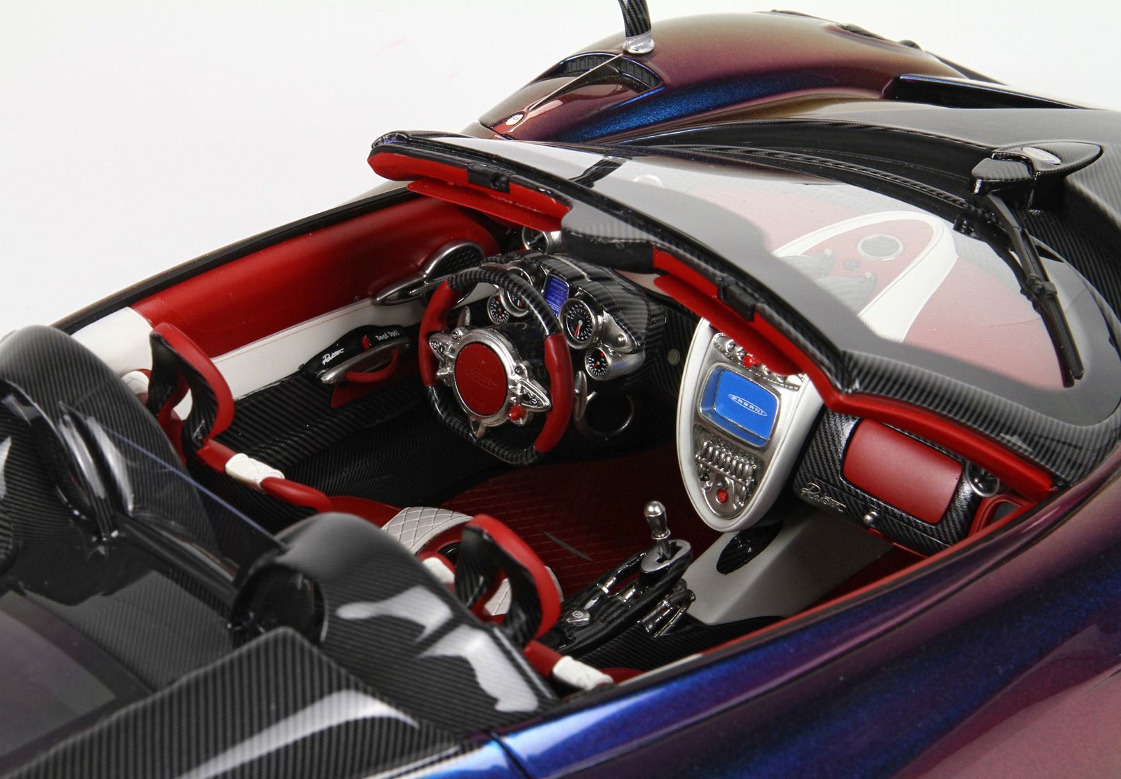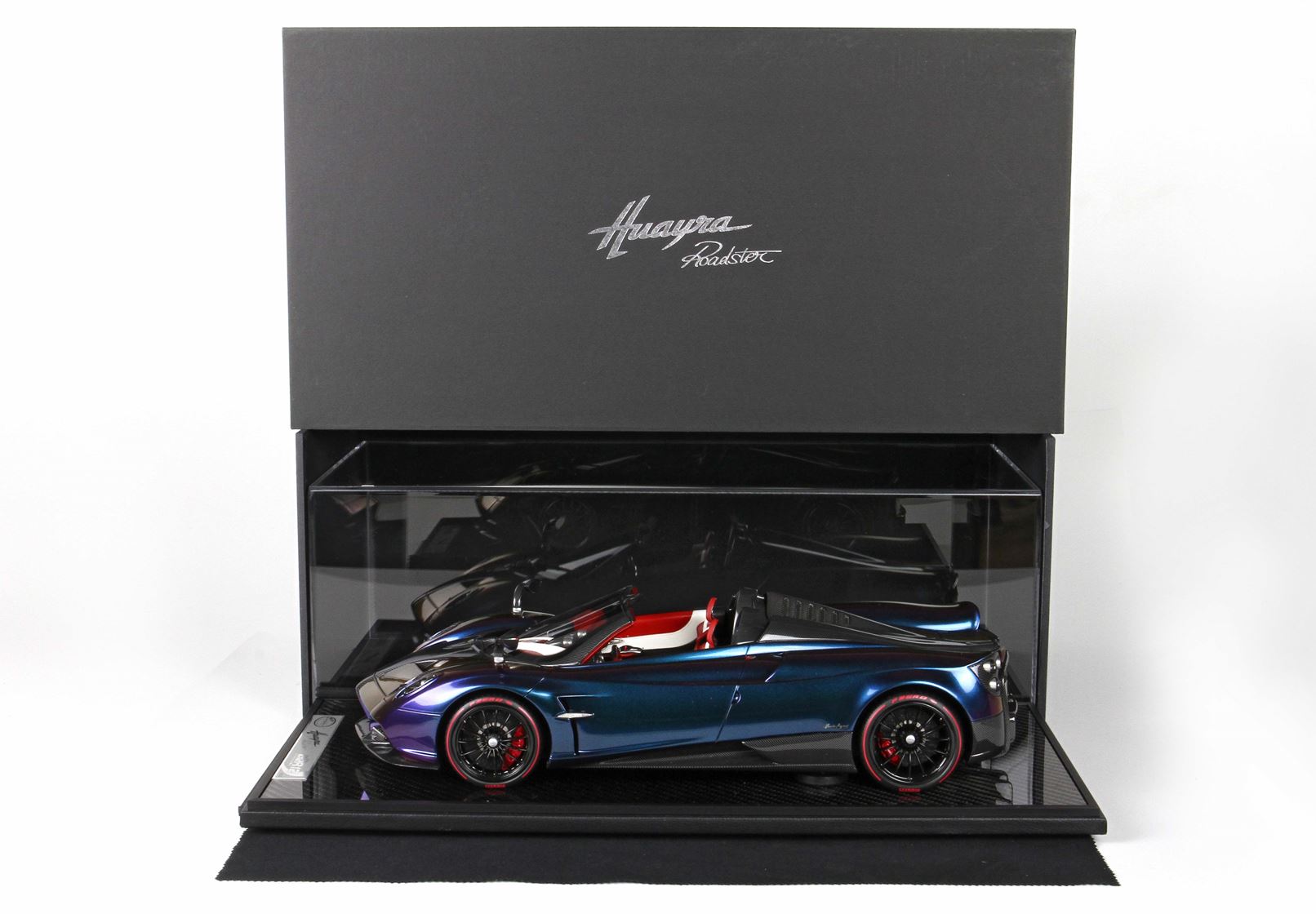 questo automodello replica fedelmente in ogni particolare la Huayra Spider, da notare la differente colorazione dei cerchi destri e sinistri