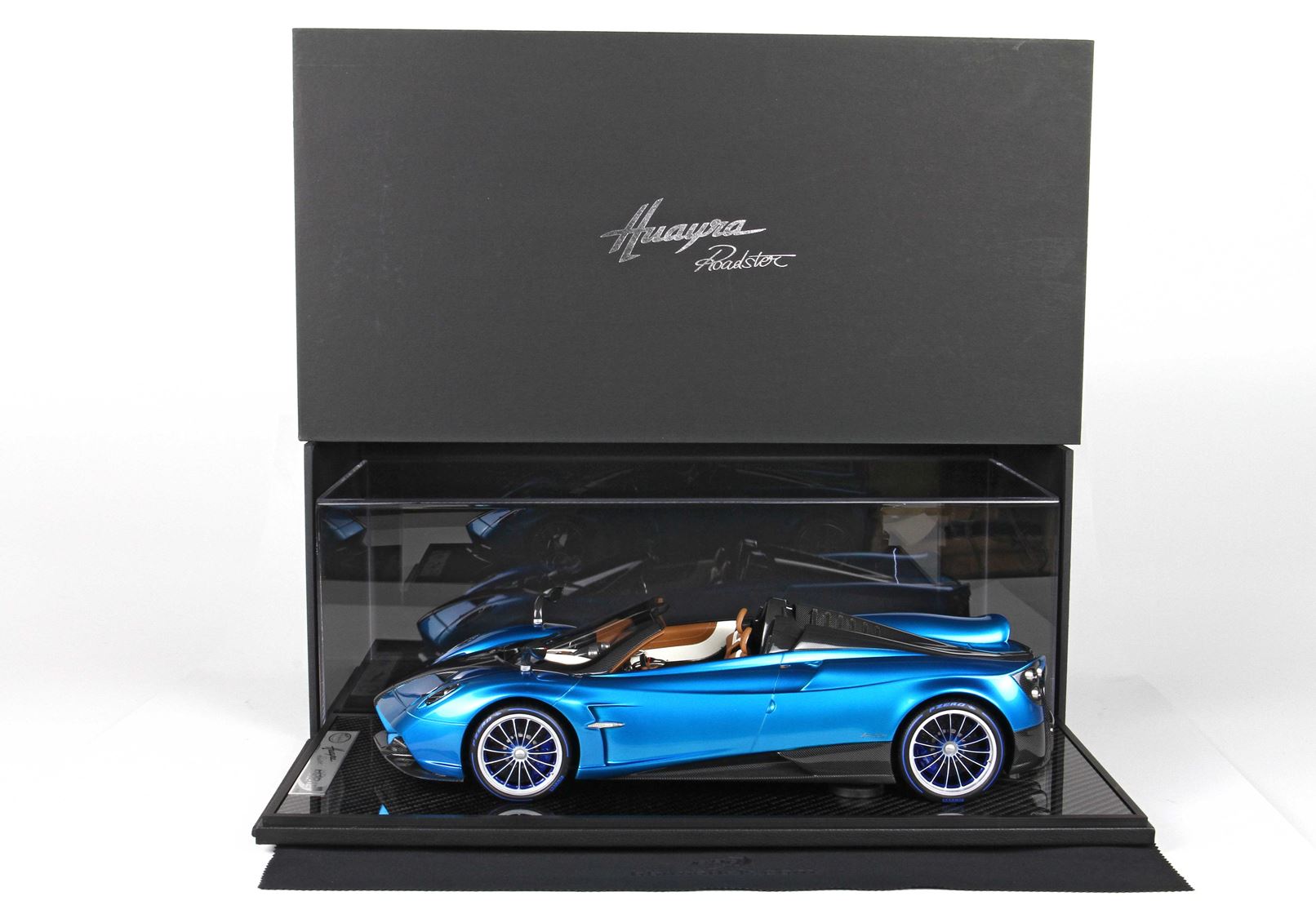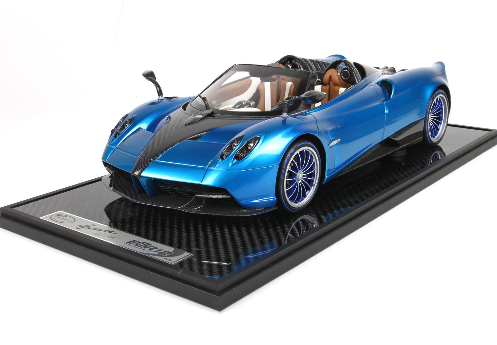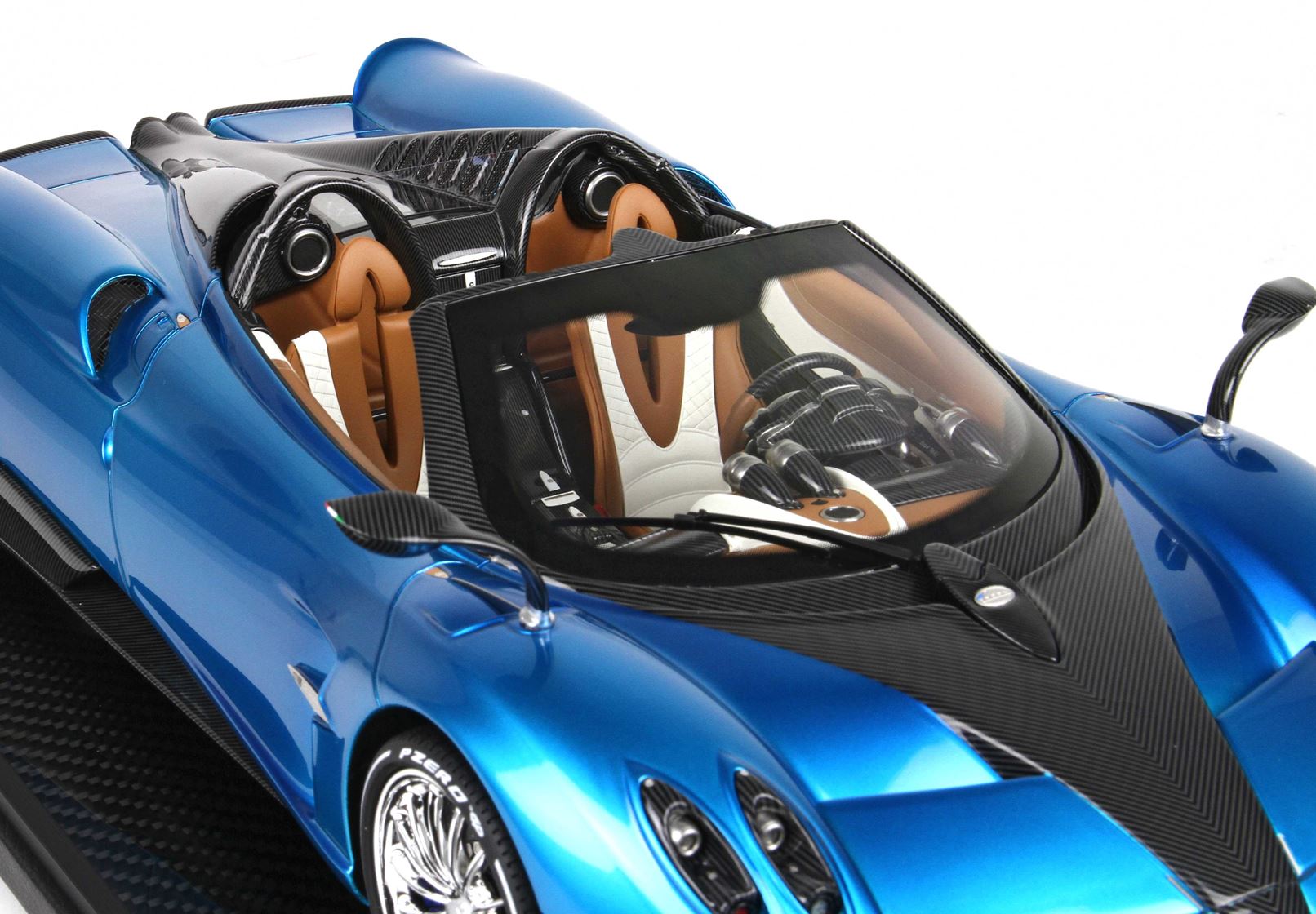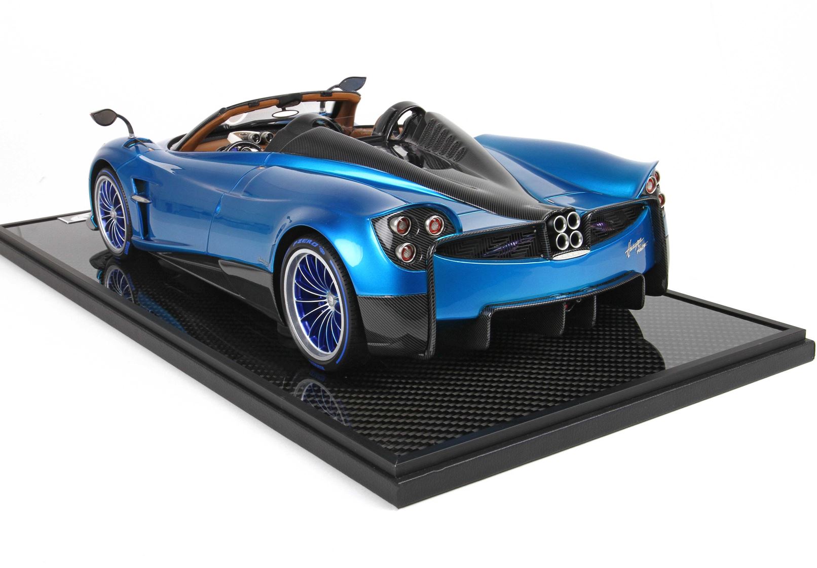 questo automodello replica fedelmente in ogni particolare la Huayra Spider, da notare la differente colorazione dei cerchi destri e sinistri