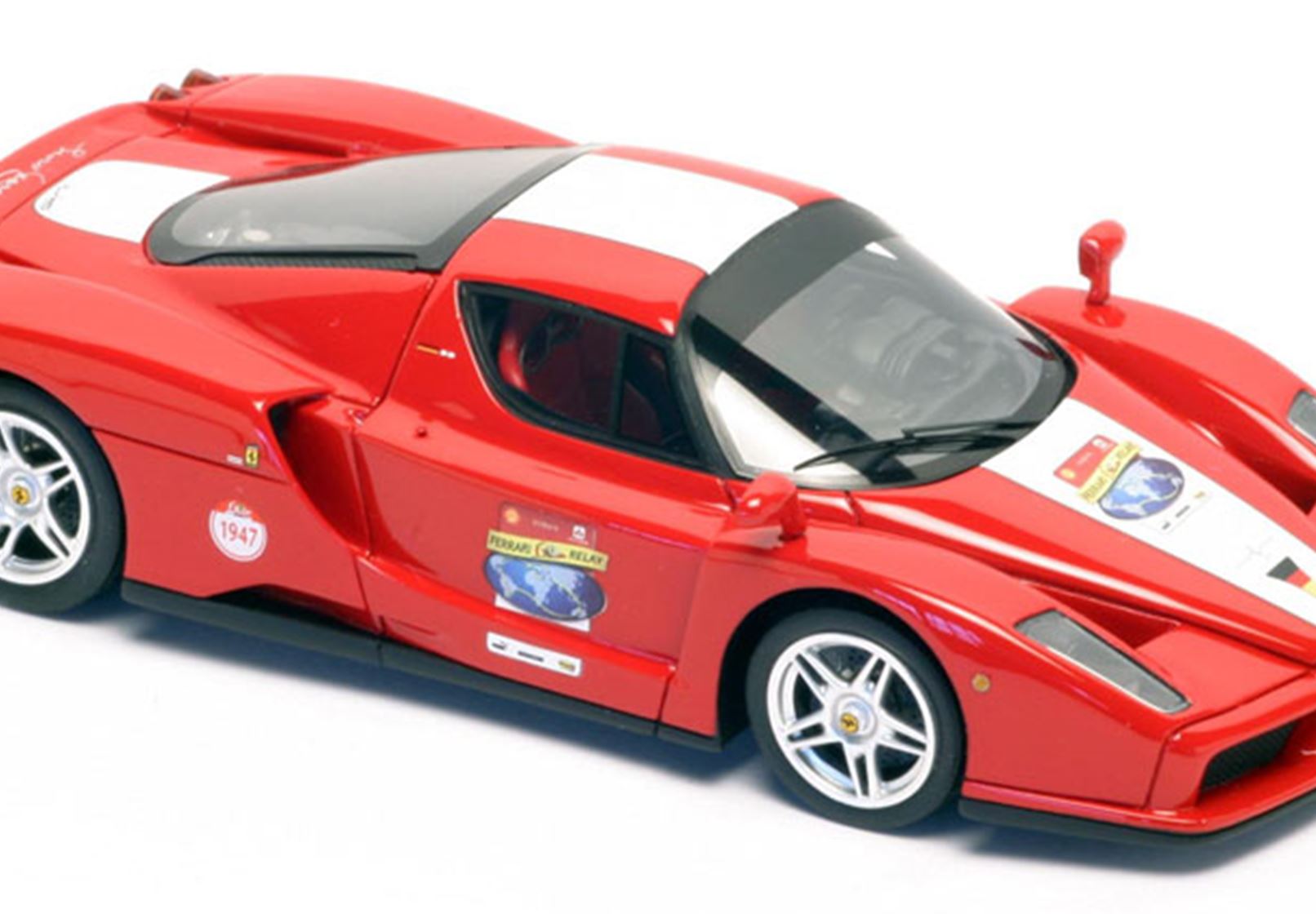 This is really a special Enzo, which has run the German stage of the 60° Relay Ferrari. It is painted with a special red color and on the back you can see the Enzo Ferrari signature instead of the usual script of the car name.