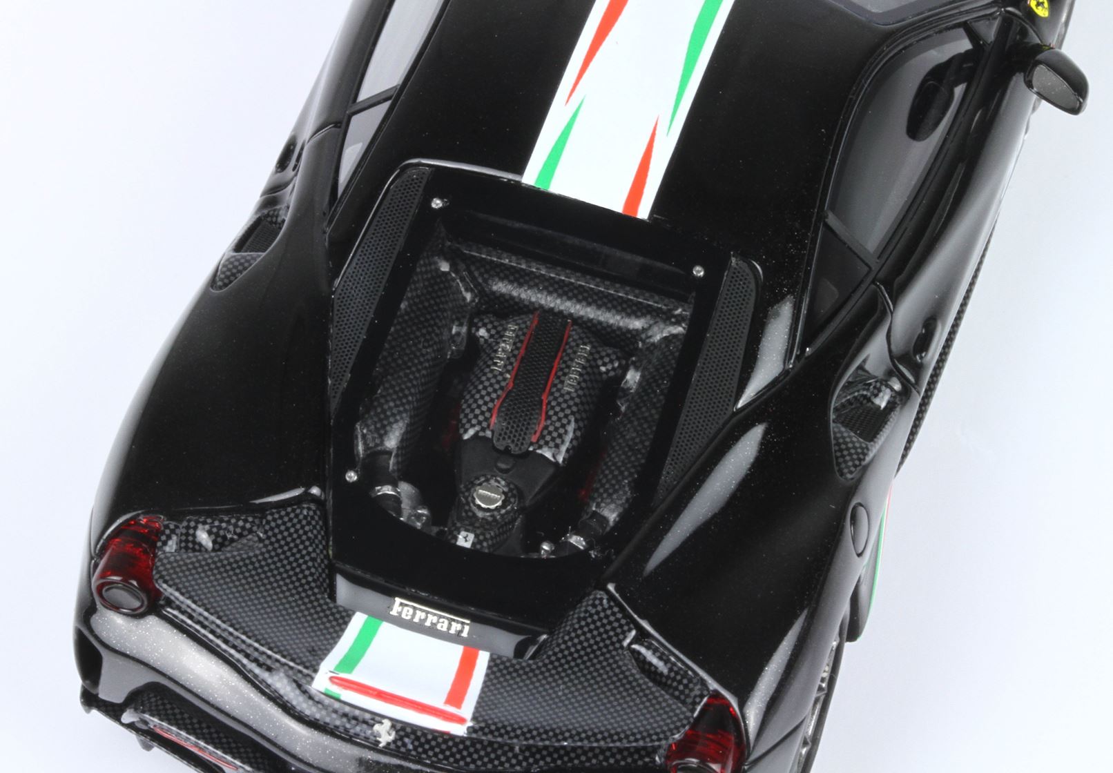 Passando agli interni, i rivestimenti dei sedili sono in una speciale Alcantara nera e traforata; al centro dello schienale viene ripresa una bandiera tricolore sfumata, tema ripreso anche sui tappetini e sul bordo delle palette del cambio.