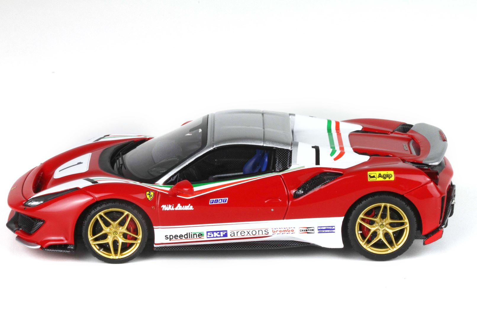 L’auto di Maranello, in strada con immatricolazione e con targa tedesca, è stata colorata di bianco e rosso, con profili tricolore, aggiungendo tutti gli adesivi e le scritte degli sponsor Ferrari F1 nel 1976. Con tanto di nome pilota in corsivo accostato a quella scritta Fiat, che iniziava a caratterizzare proprio da quei tempi le monoposto Ferrari. I cerchi, ovviamente in energica tinta bronzo.