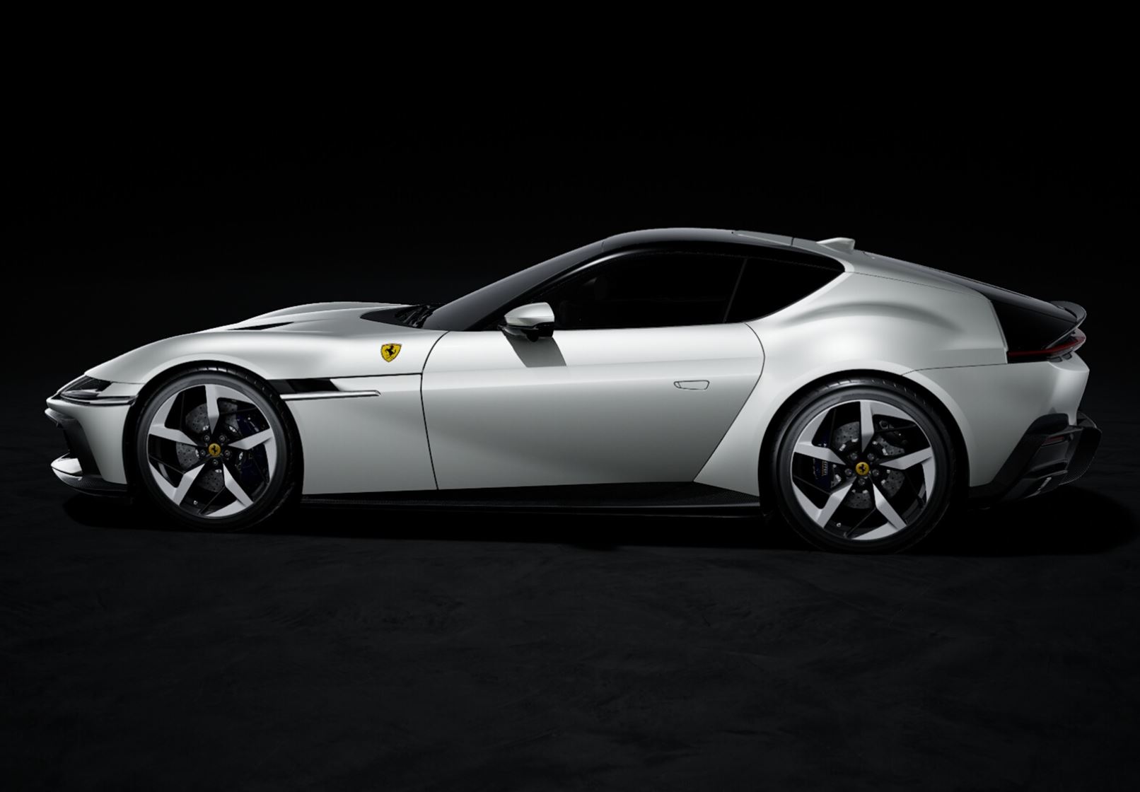 Le linee essenziali sono rese muscolari dai parafanghi. Quello posteriore prominente ma senza eccessi, è perfettamente integrato nella geometria dell'auto. Quello anteriore, con evidente richiamo alla 365GTB Daytona, mostra il suo fascino sinuoso impreziosendo la fiancata. Nel frontale, un'unica fascia avvolgente integra i fari e i DRL come due lame di luce. Proporzioni perfette per una GT: muso lunghissimo, abitacolo compatto e retro corto.