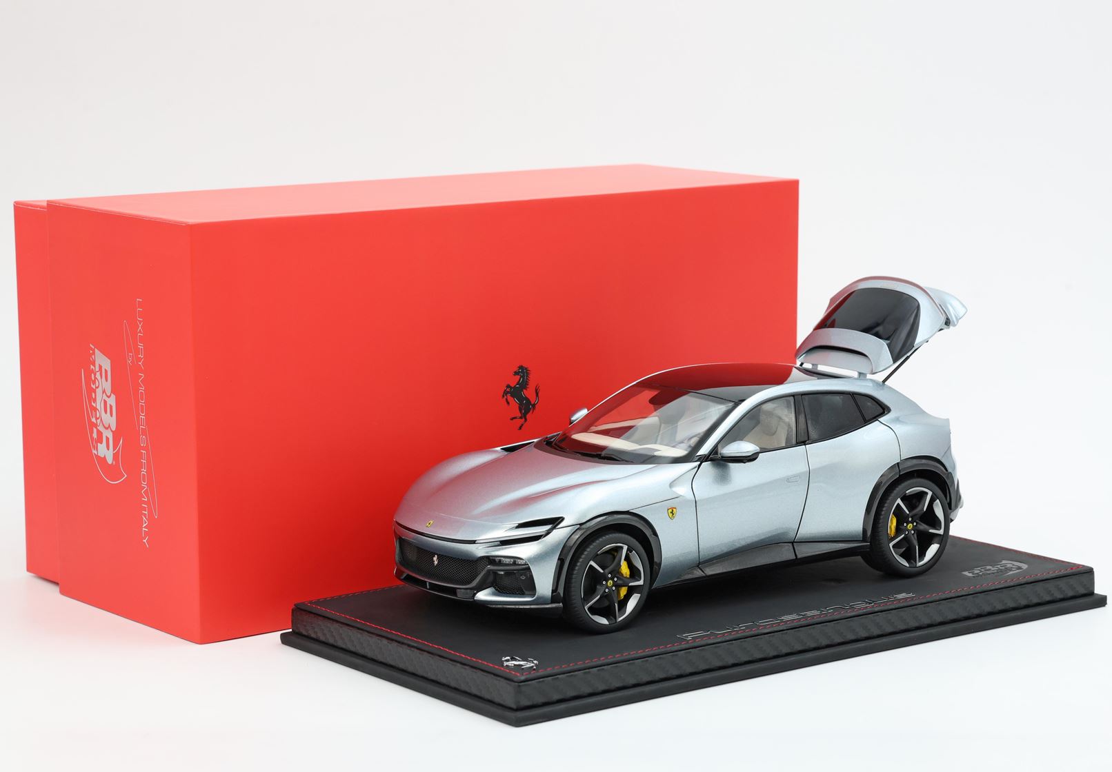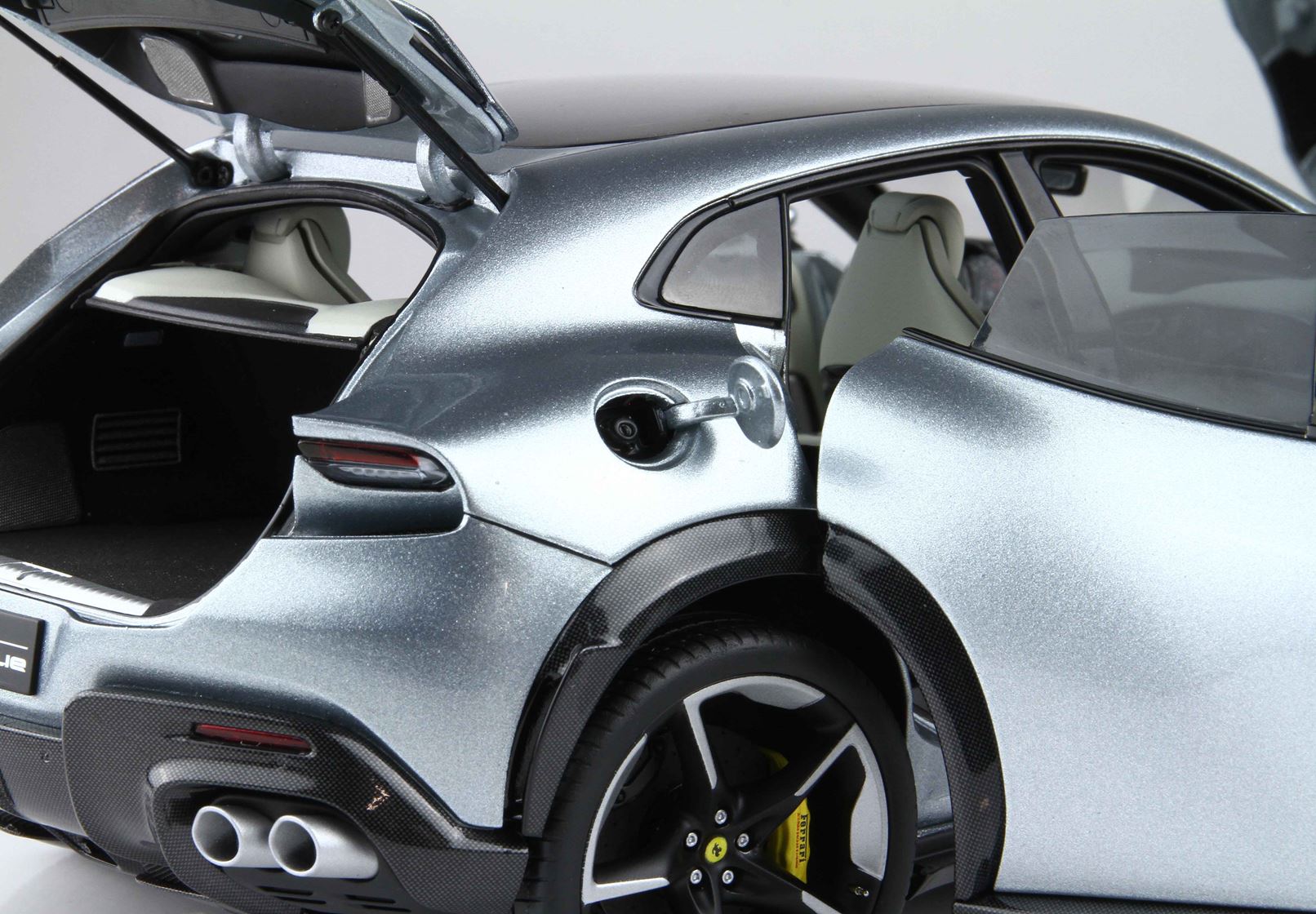 Esclusiva mondiale di Purosangue in scala 1/18 diecast completamente apribile. Rendono unico il modello firmato BBR, una fedele riproduzione dell’aperture di porte e cofani (tramite pistoncini telescopici) ma anche la possibilità di aprire braccioli interni e tappo benzina. Parti in metallo e abs si alternano a fotoincisioni e decals per un risultato di alta qualità. Quattro ruote realmente ammortizzate e sterzanti con due diversi tipi di cerchi: l’interruttore sul fondo permette inoltre di direzionare le ruote posteriori in direzione parallela o opposta. Tutto come nell'auto da strada ma racchiuso in pochi centimetri. Versione con tetto panoramico.