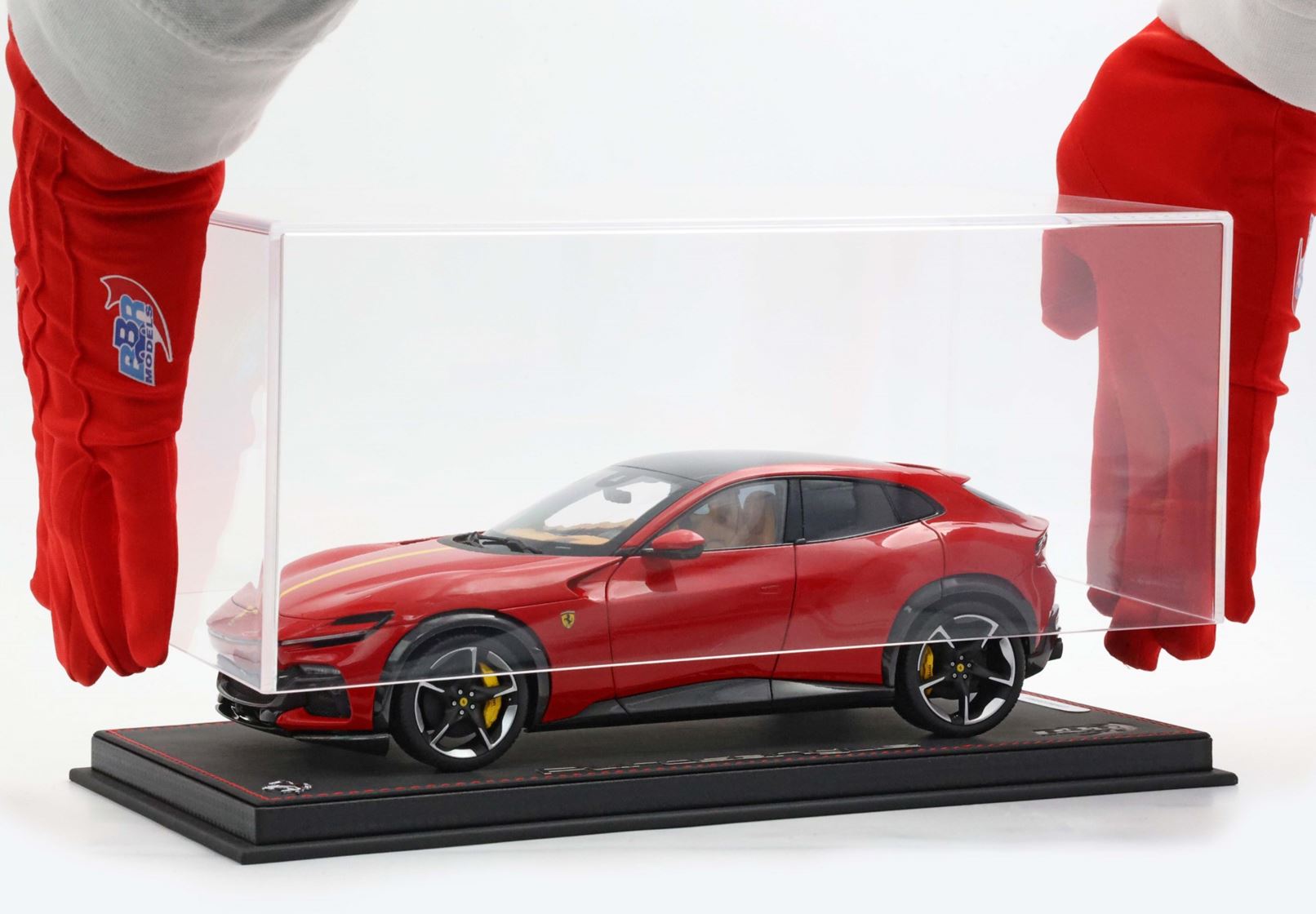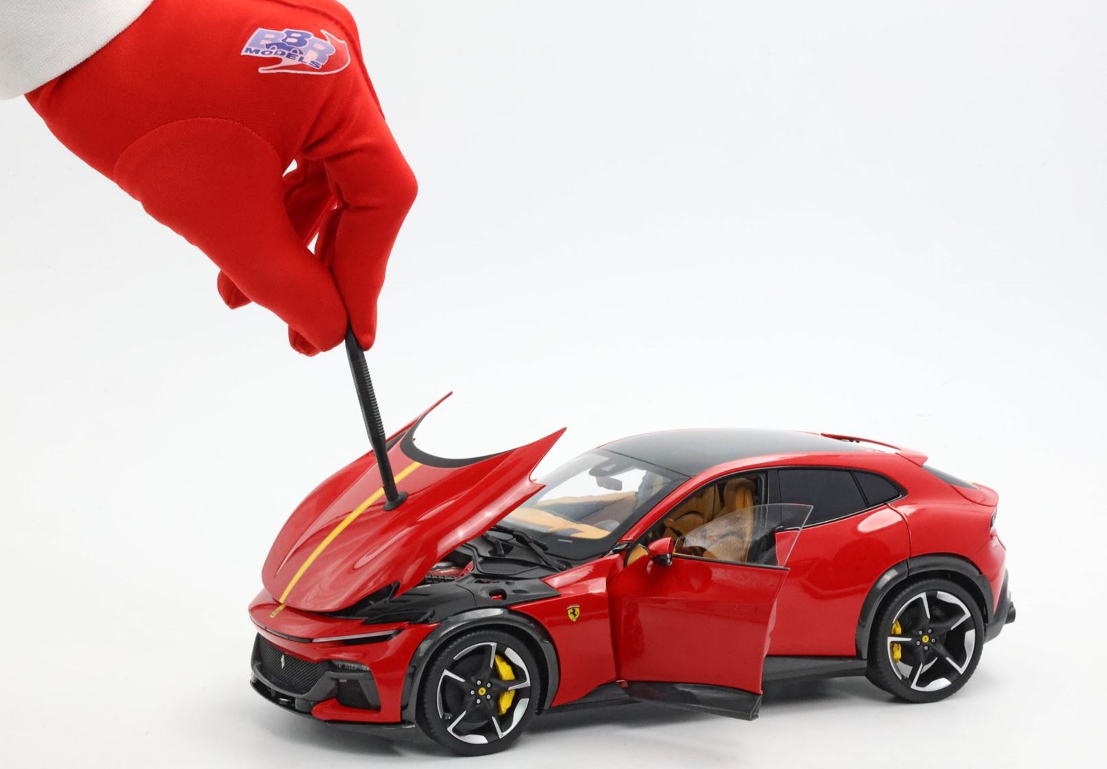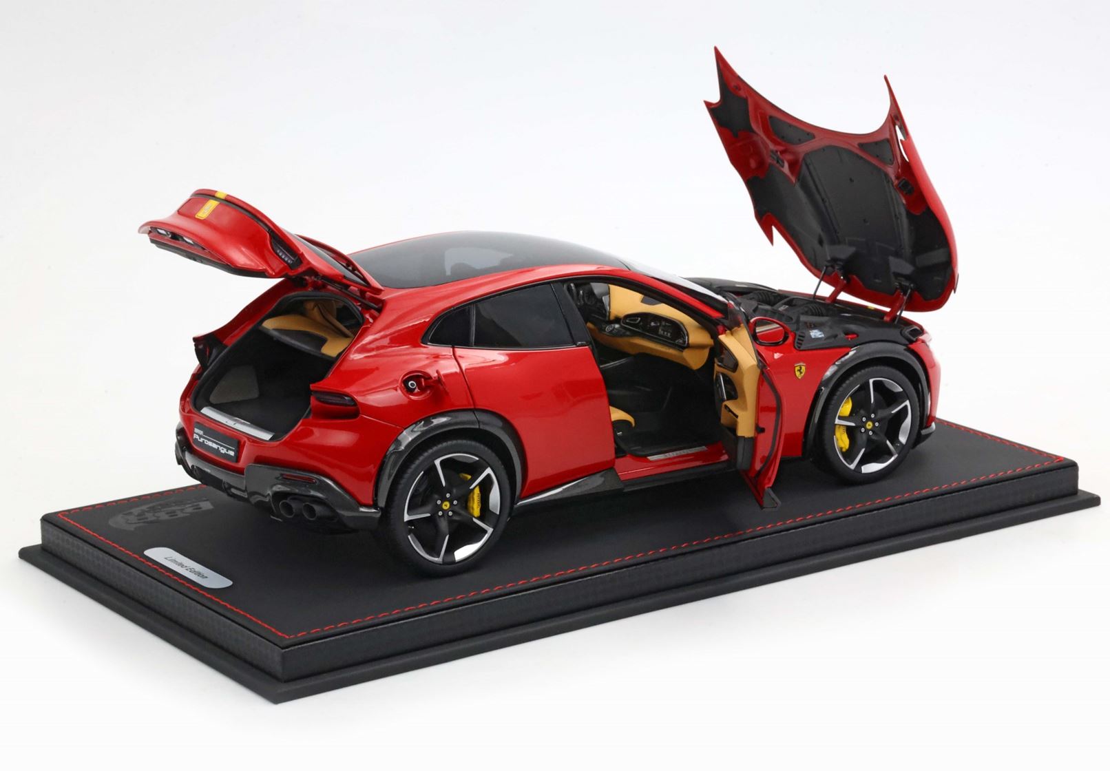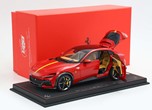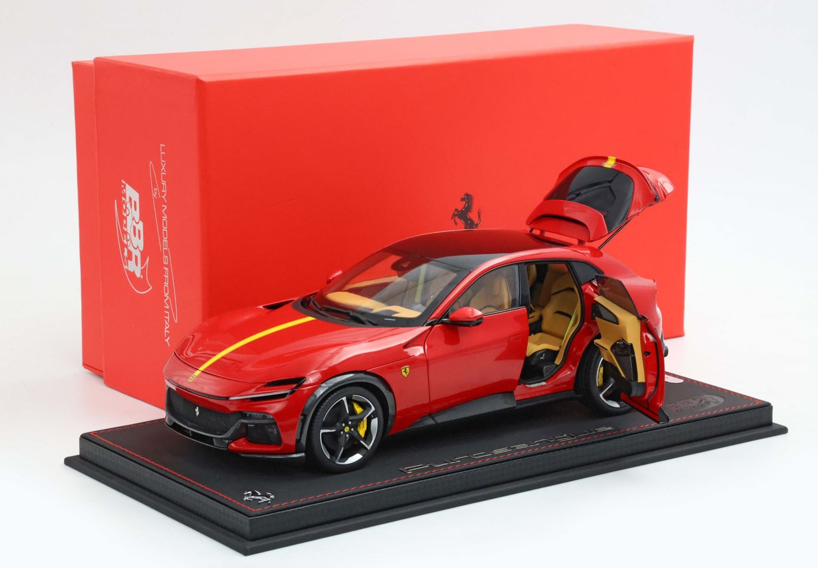 Esclusiva mondiale di Purosangue in scala 1/18 diecast completamente apribile. Rendono unico il modello firmato BBR, una fedele riproduzione dell’aperture di porte e cofani (tramite pistoncini telescopici) ma anche la possibilità di aprire braccioli interni e tappo benzina. Parti in metallo e abs si alternano a fotoincisioni e decals per un risultato di alta qualità. Quattro ruote realmente ammortizzate e sterzanti con due diversi tipi di cerchi: l’interruttore sul fondo permette inoltre di direzionare le ruote posteriori in direzione parallela o opposta. Tutto come nell'auto da strada ma racchiuso in pochi centimetri. Versione con tetto panoramico.