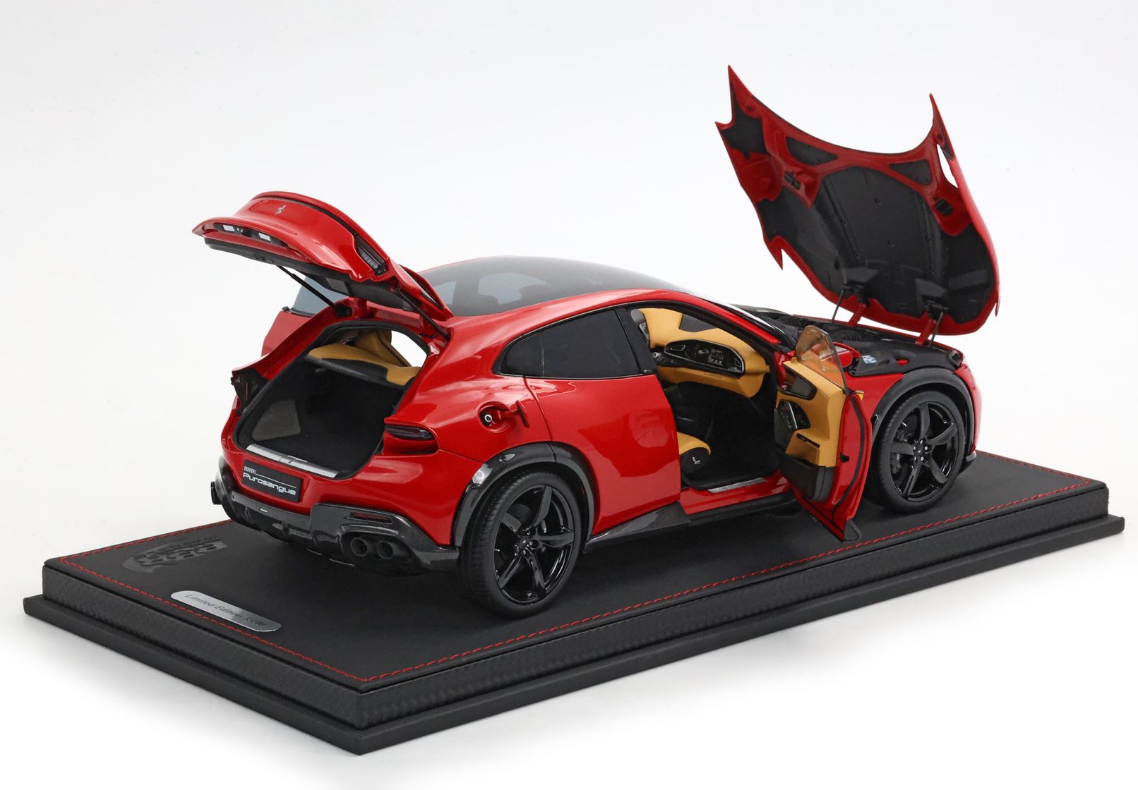 Esclusiva mondiale di Purosangue in scala 1/18 diecast completamente apribile. Rendono unico il modello firmato BBR, una fedele riproduzione dell’aperture di porte e cofani (tramite pistoncini telescopici) ma anche la possibilità di aprire braccioli interni e tappo benzina. Parti in metallo e abs si alternano a fotoincisioni e decals per un risultato di alta qualità. Quattro ruote realmente ammortizzate e sterzanti con due diversi tipi di cerchi: l’interruttore sul fondo permette inoltre di direzionare le ruote posteriori in direzione parallela o opposta. Tutto come nell'auto da strada ma racchiuso in pochi centimetri. Versione con tetto panoramico.