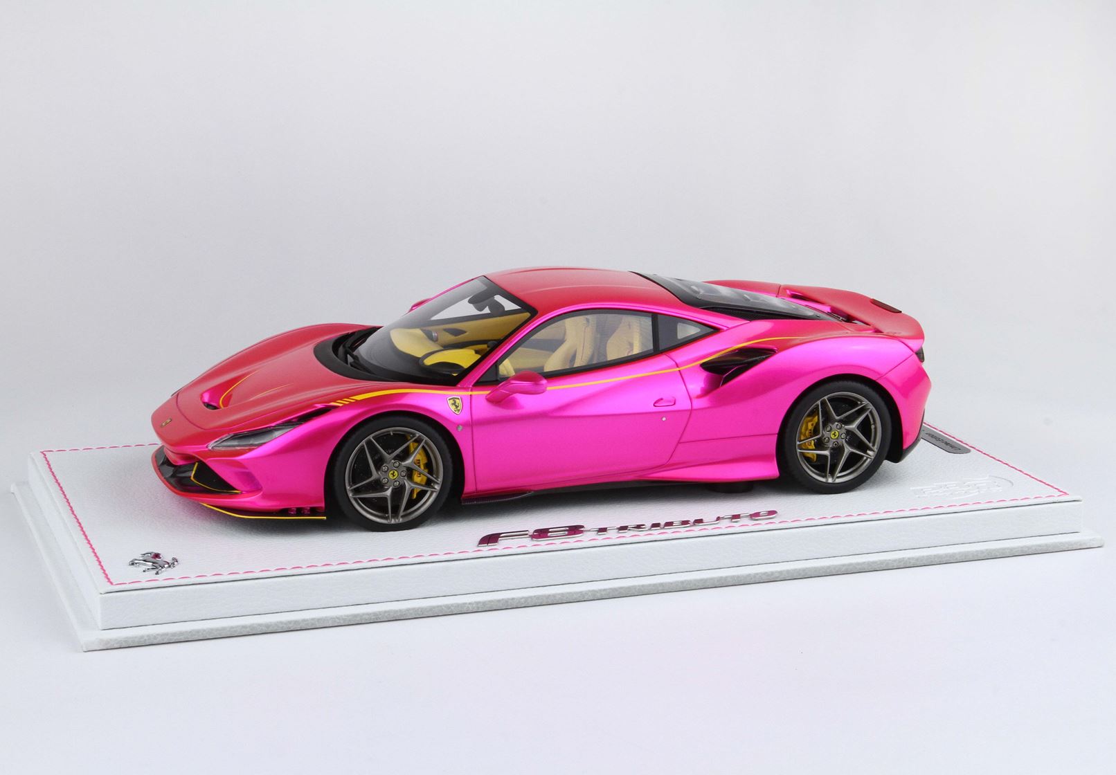 Logo F8 Tributo in acciaio e base in ecopelle.