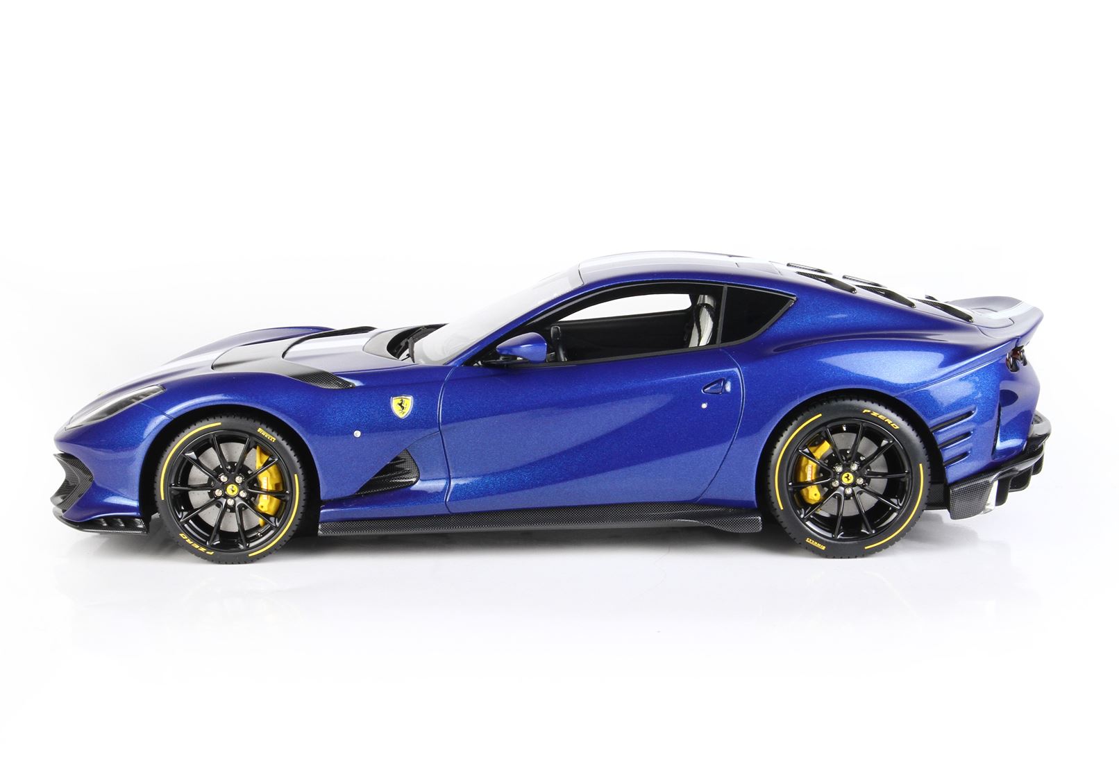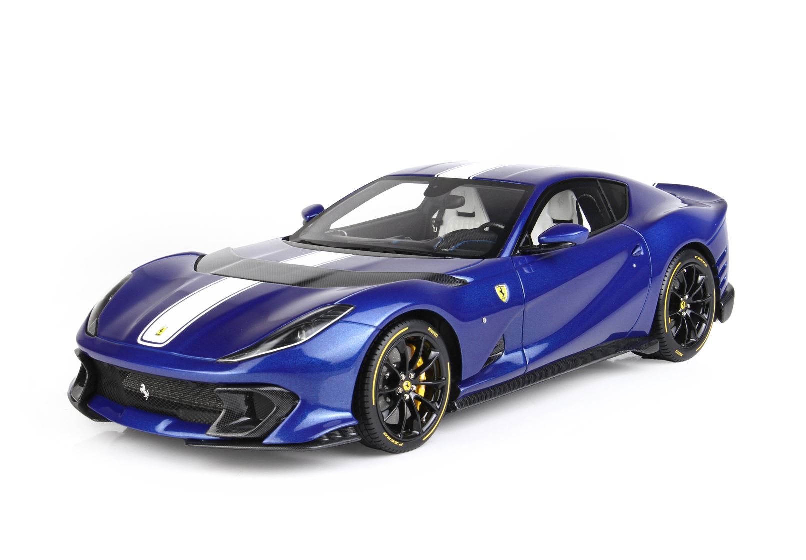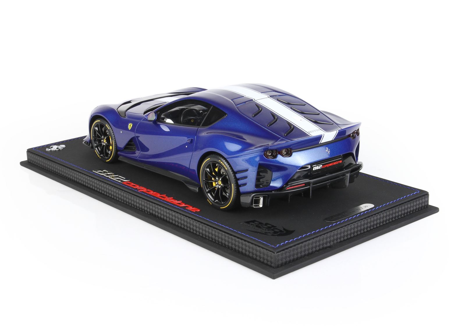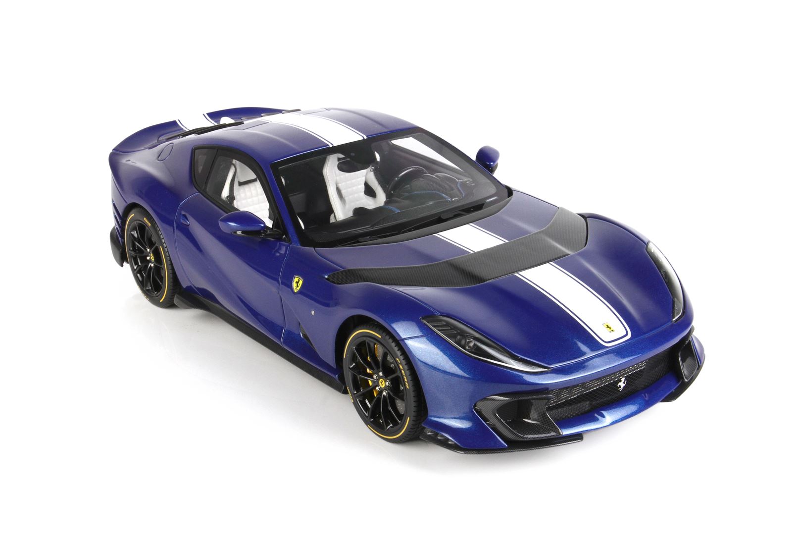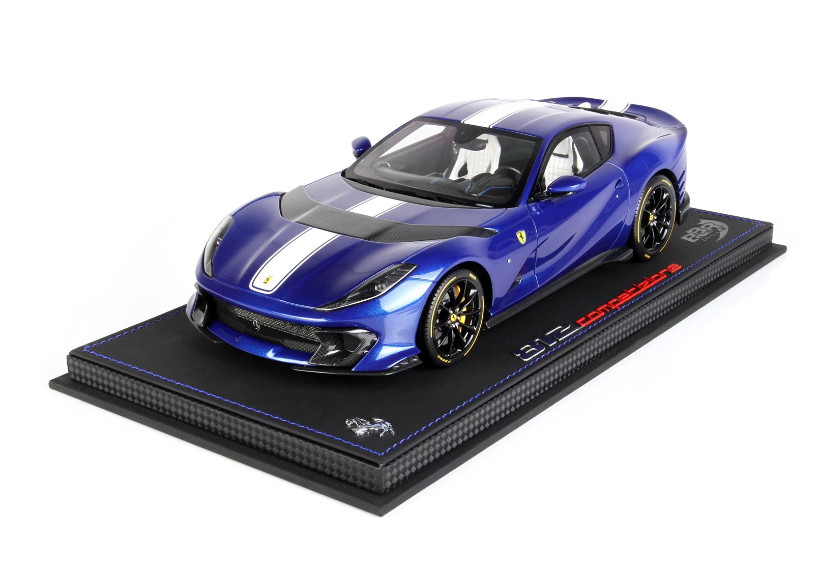 Colore Blue Tour De France completato dalla striscia bianca, interni in colore nero opaco e sedili bianchi. Il cruscotto è replicato in fibra di carbonio e riporta le strisce blu che sulla vettura vera è un optional.