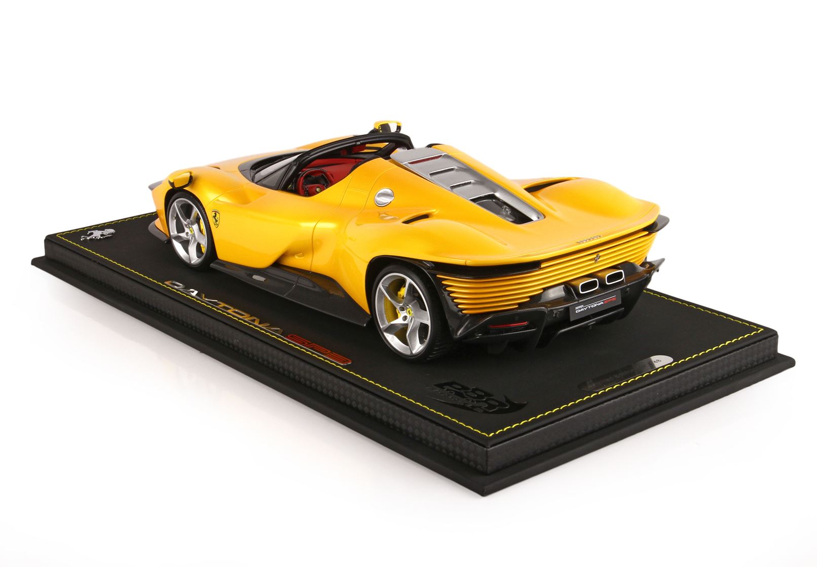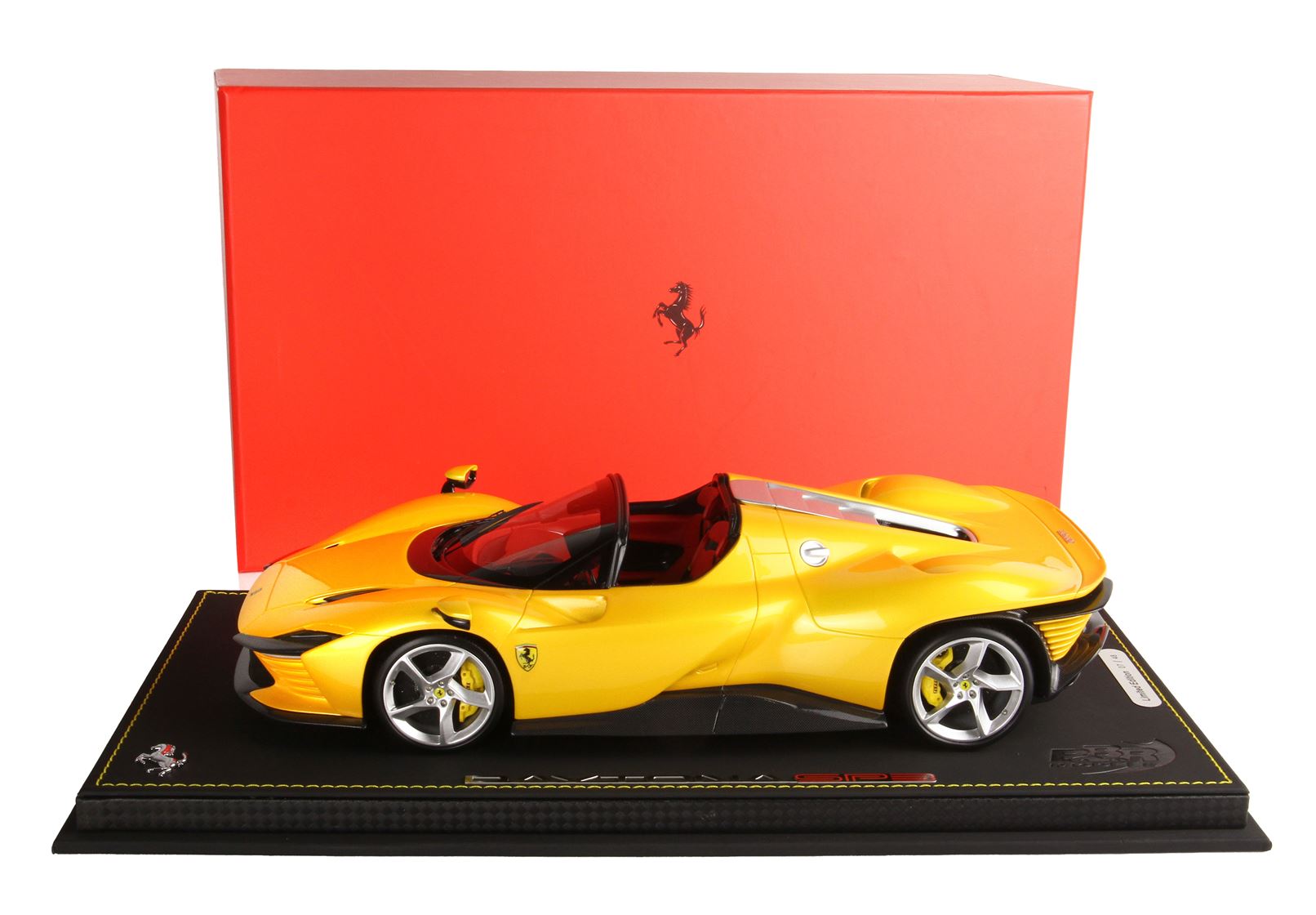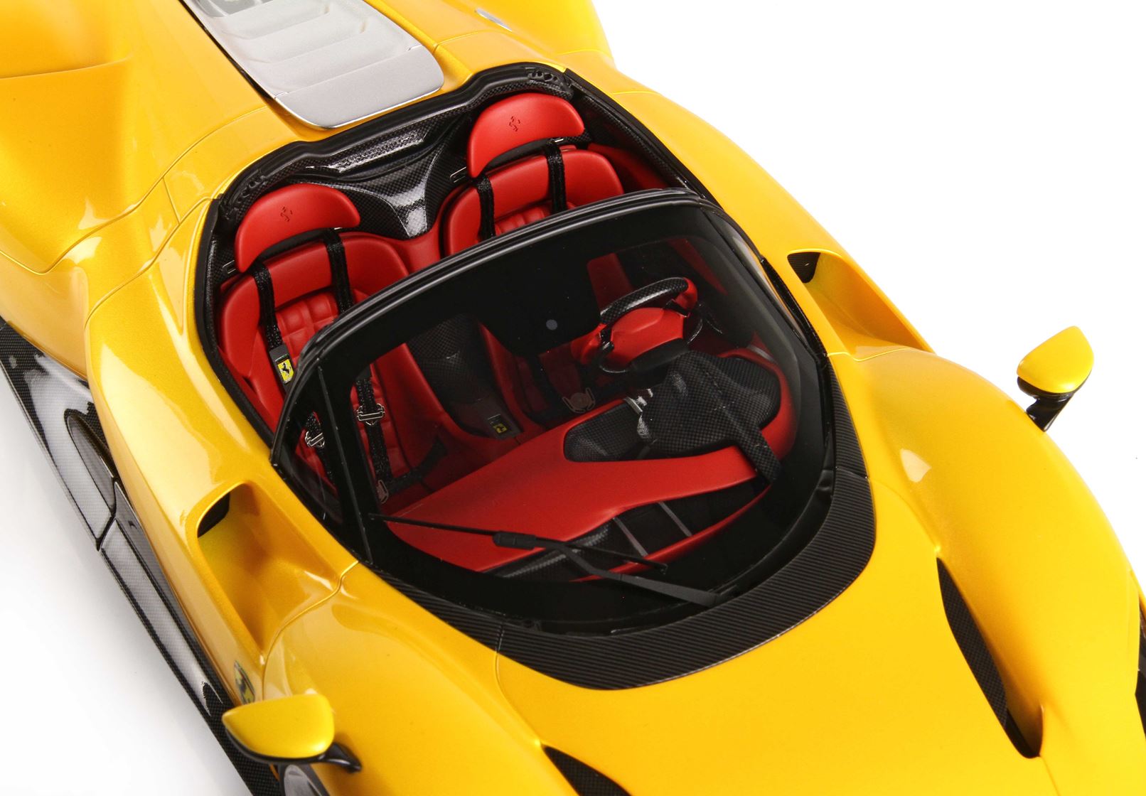 Colore giallo tristrato, ruote in colore argento con freni a disco gialli. Interno vettura in colore rosso.