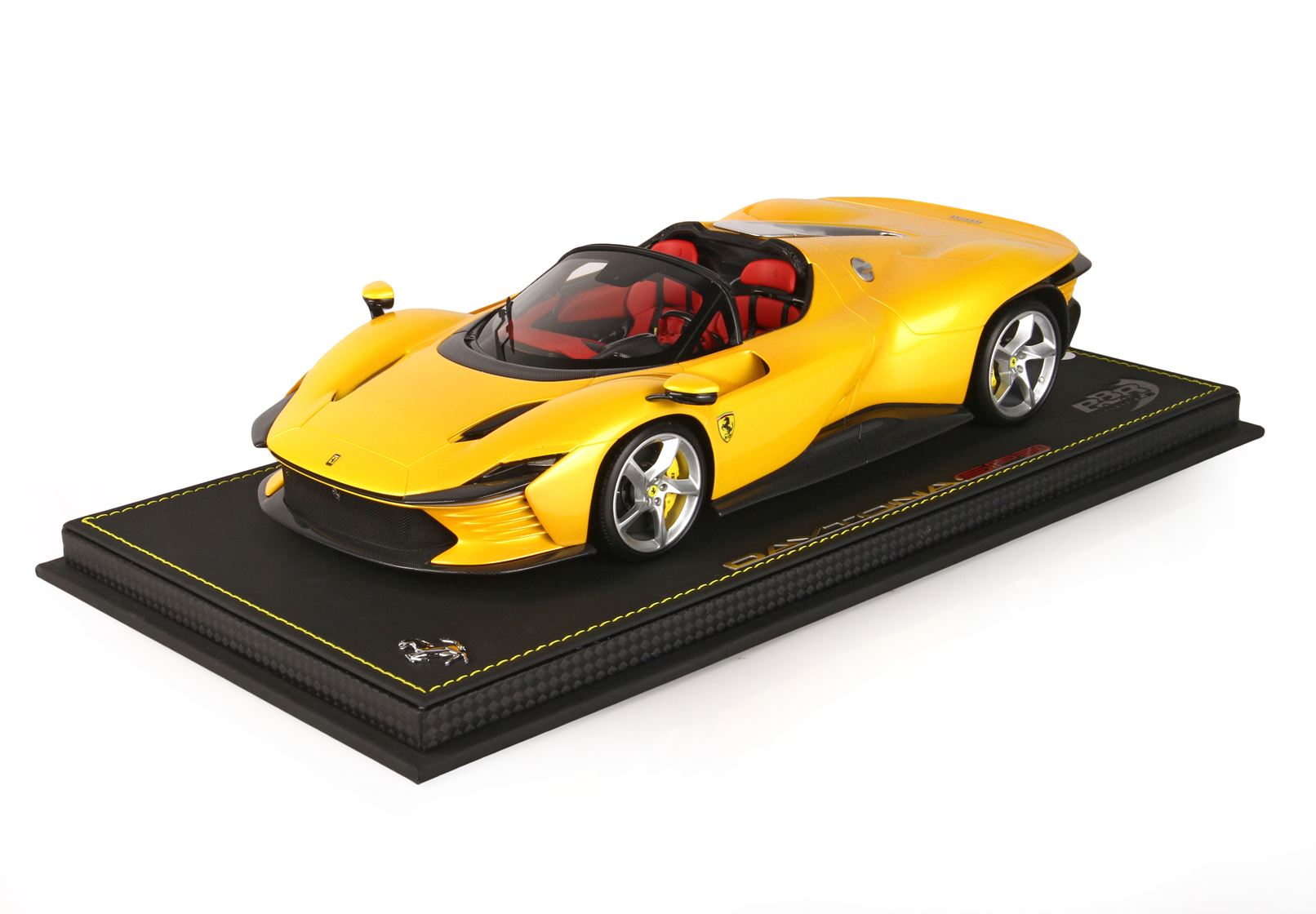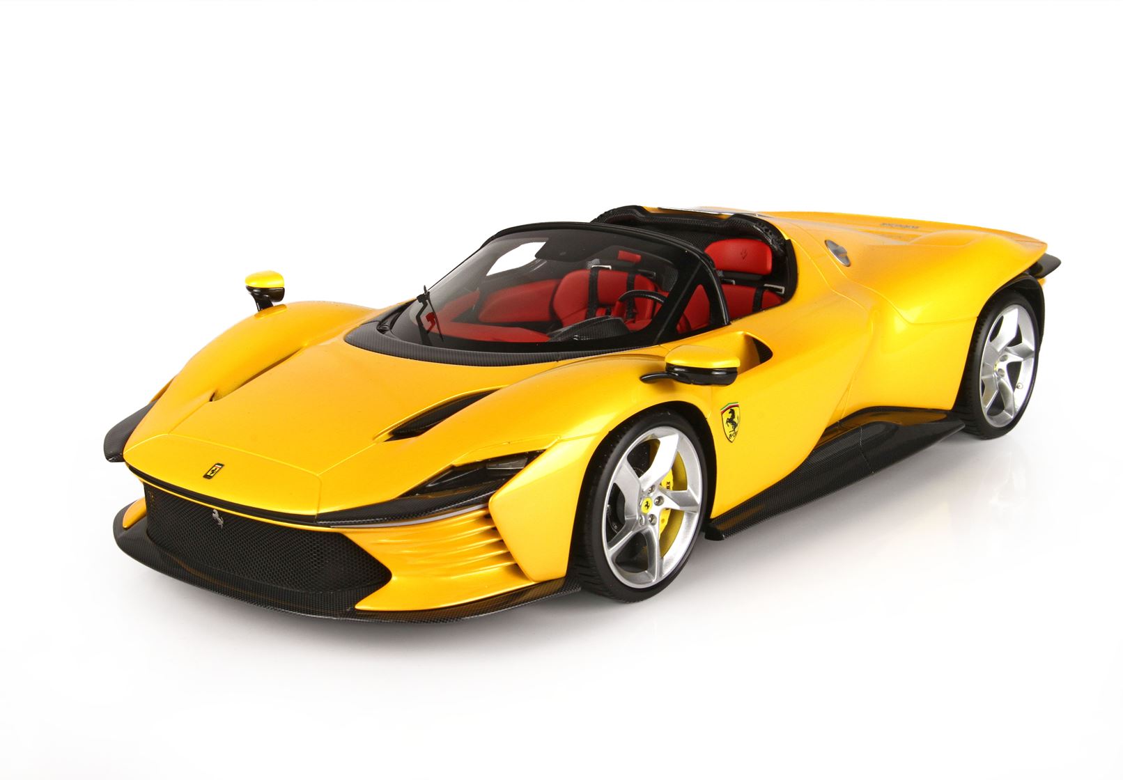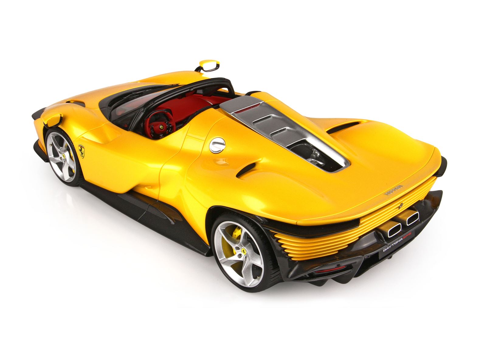 Colore giallo tristrato, ruote in colore argento con freni a disco gialli. Interno vettura in colore rosso.