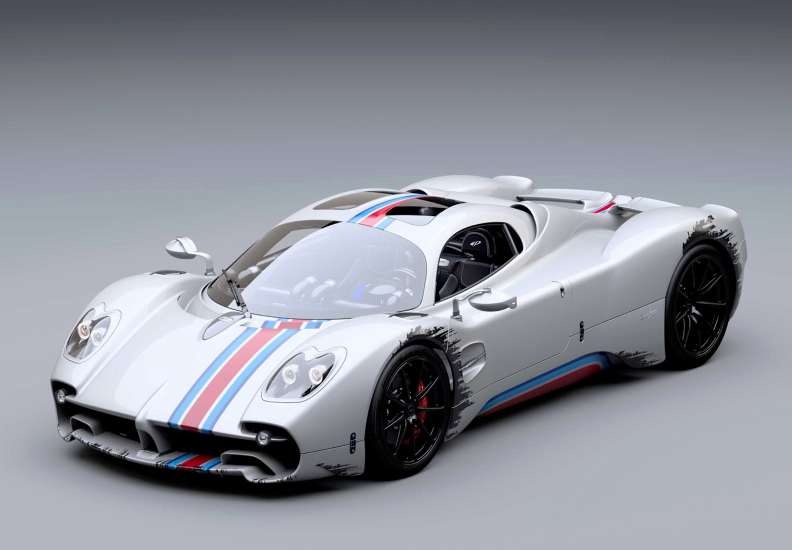 Una striscia ispirata alle corse nei colori Rosso Monza, Blu e Turchese sulla carrozzeria Bianco Benny per questa Pagani unica nel suo genere, che BBR riproduce fin nei minimi dettagli.