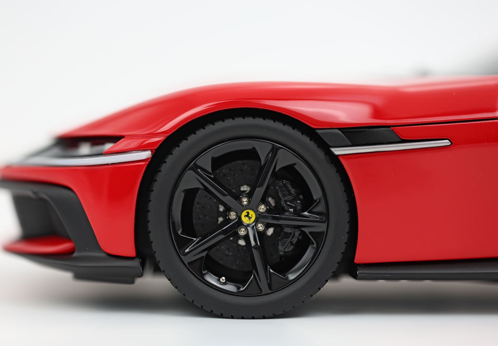 Le linee essenziali sono rese muscolari dai parafanghi. Quello posteriore prominente ma senza eccessi, è perfettamente integrato nella geometria dell'auto. Quello anteriore, con evidente richiamo alla 365GTB Daytona, mostra il suo fascino sinuoso impreziosendo la fiancata. Nel frontale, un'unica fascia avvolgente integra i fari e i DRL come due lame di luce. Proporzioni perfette per una GT: muso lunghissimo, abitacolo compatto e retro corto.