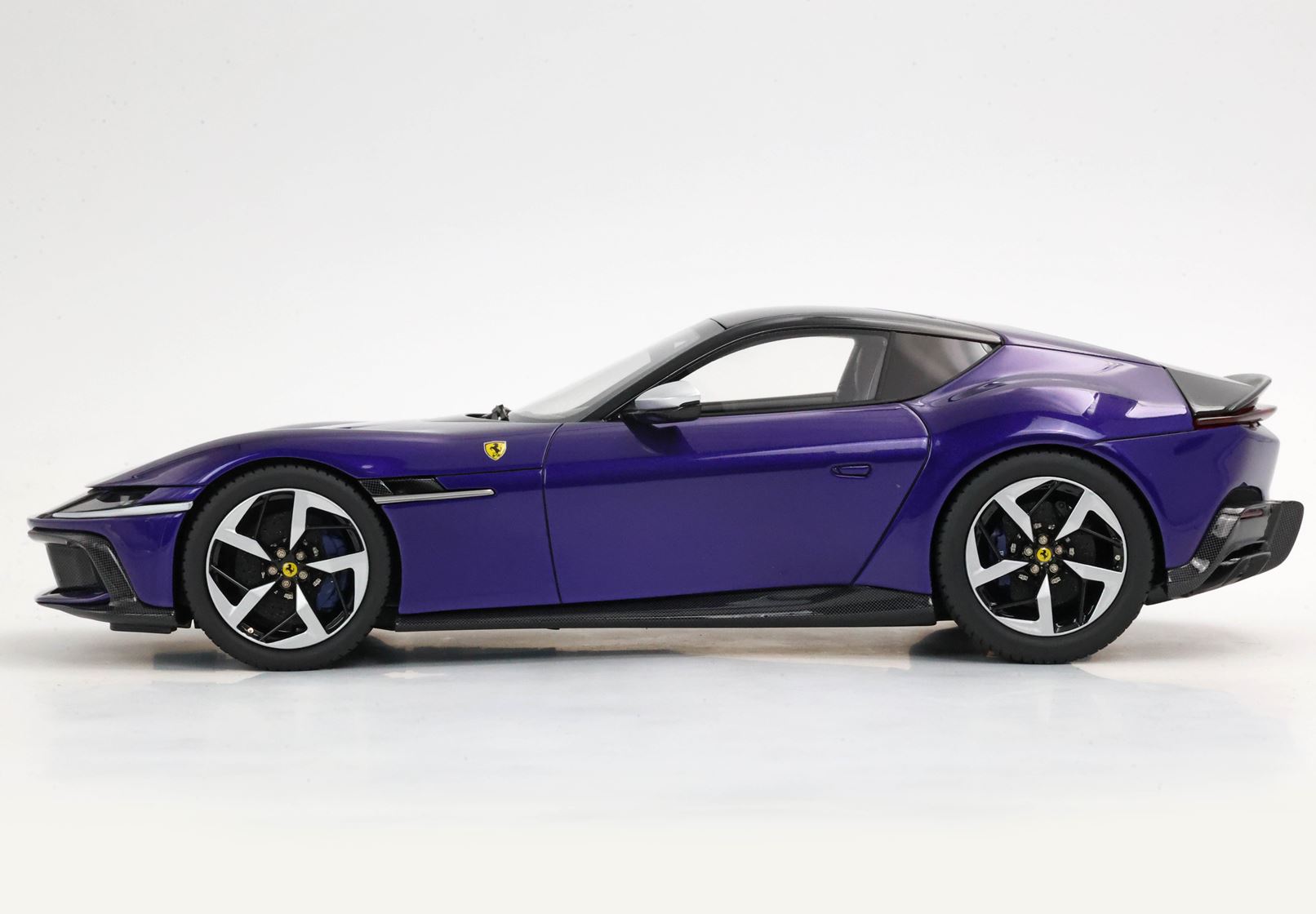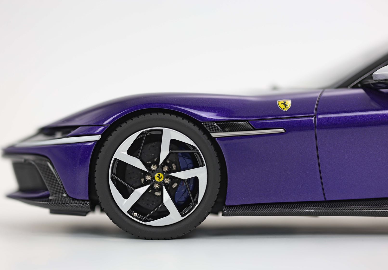 Le linee essenziali sono rese muscolari dai parafanghi. Quello posteriore prominente ma senza eccessi, è perfettamente integrato nella geometria dell'auto. Quello anteriore, con evidente richiamo alla 365GTB Daytona, mostra il suo fascino sinuoso impreziosendo la fiancata. Nel frontale, un'unica fascia avvolgente integra i fari e i DRL come due lame di luce. Proporzioni perfette per una GT: muso lunghissimo, abitacolo compatto e retro corto.