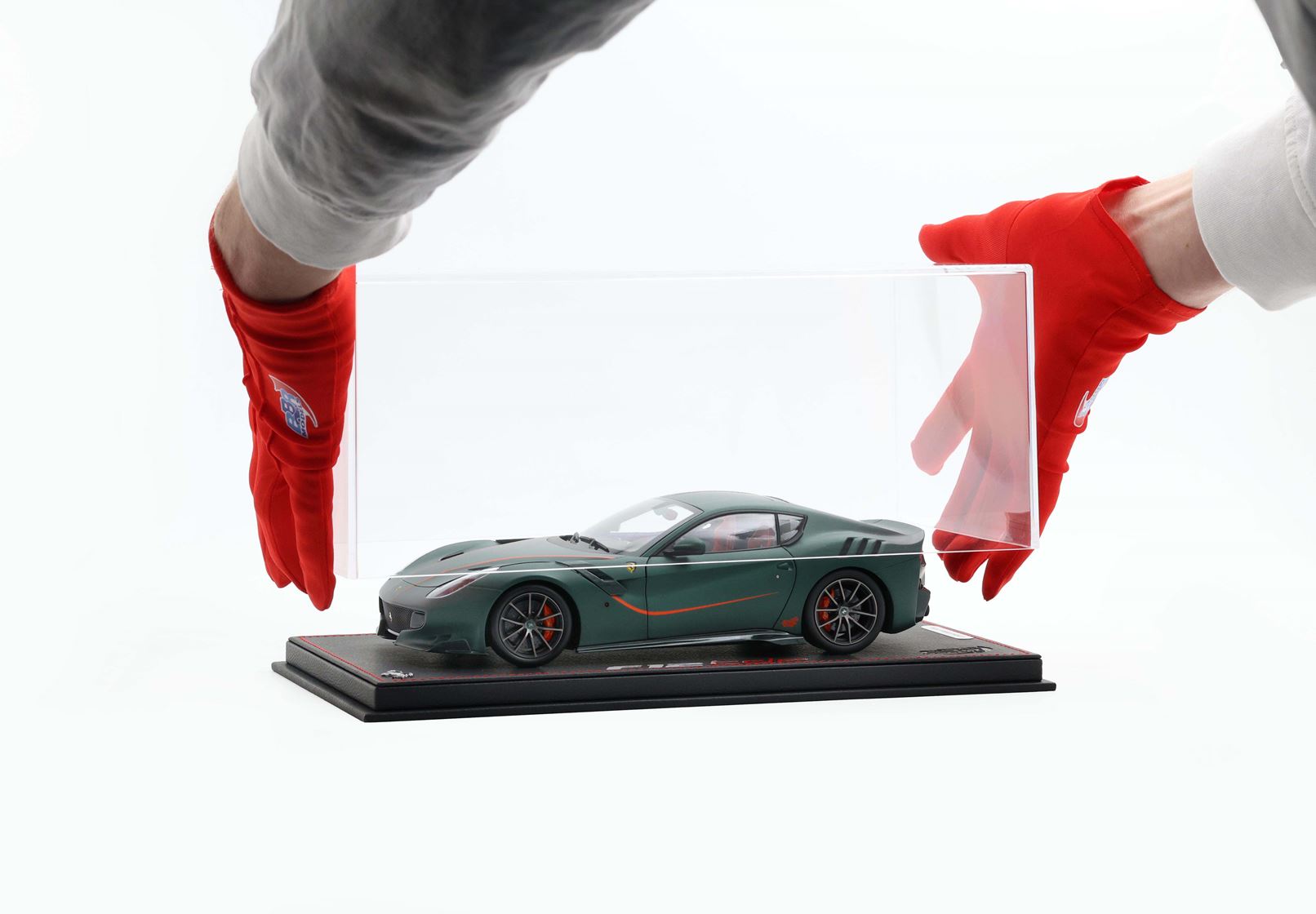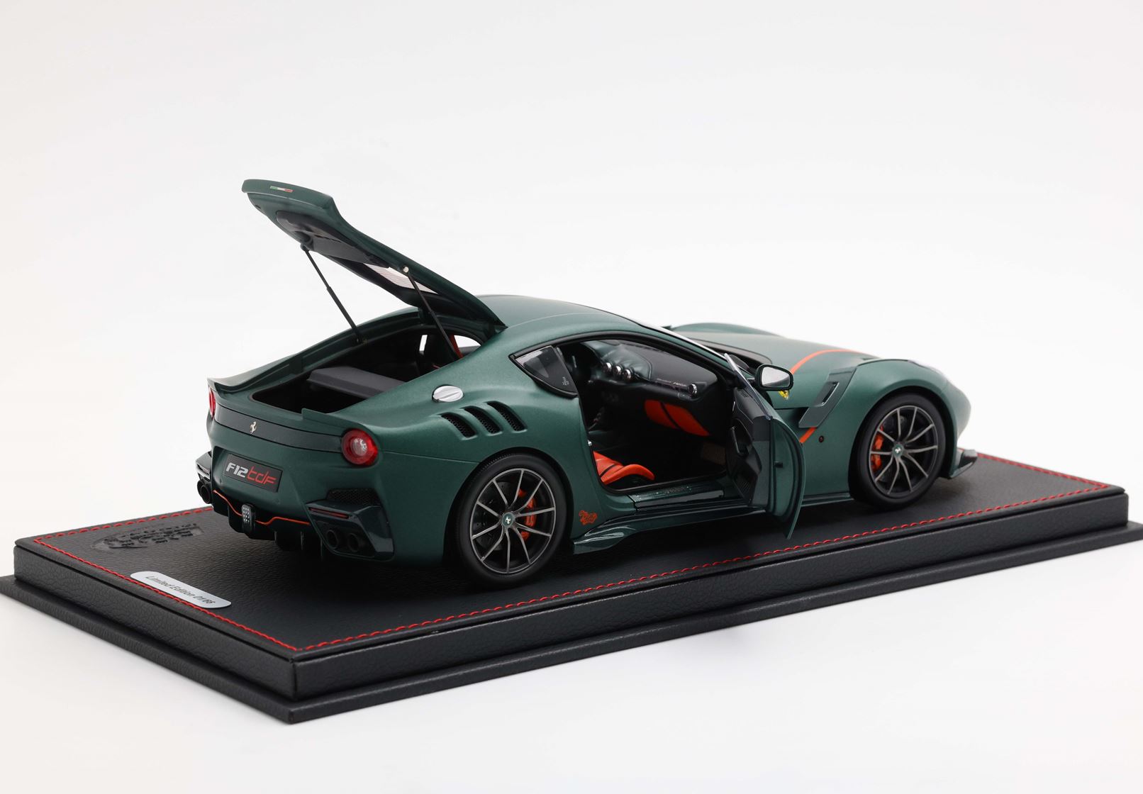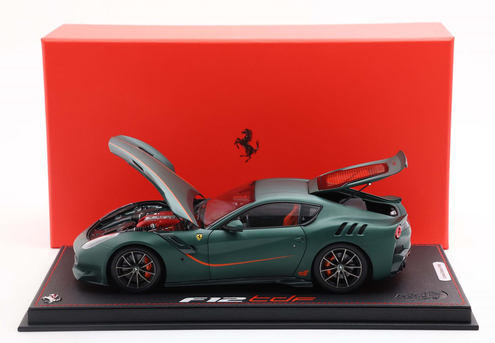 All model cars are assembled on an eco-leather base with the Official F12 TDF Steel logo.