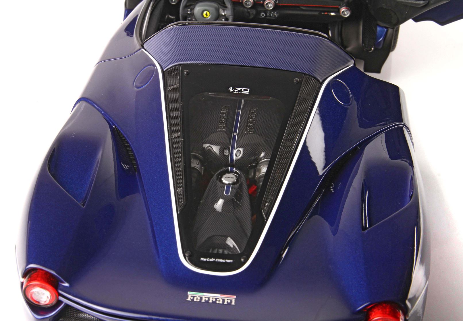 Questa Ferrari one off, oltre ad avere un colore unico tra tutte le LaFerrari Aperta, ha il carbonio in colore blu e le gli interni e le ruote sono personalizzati.