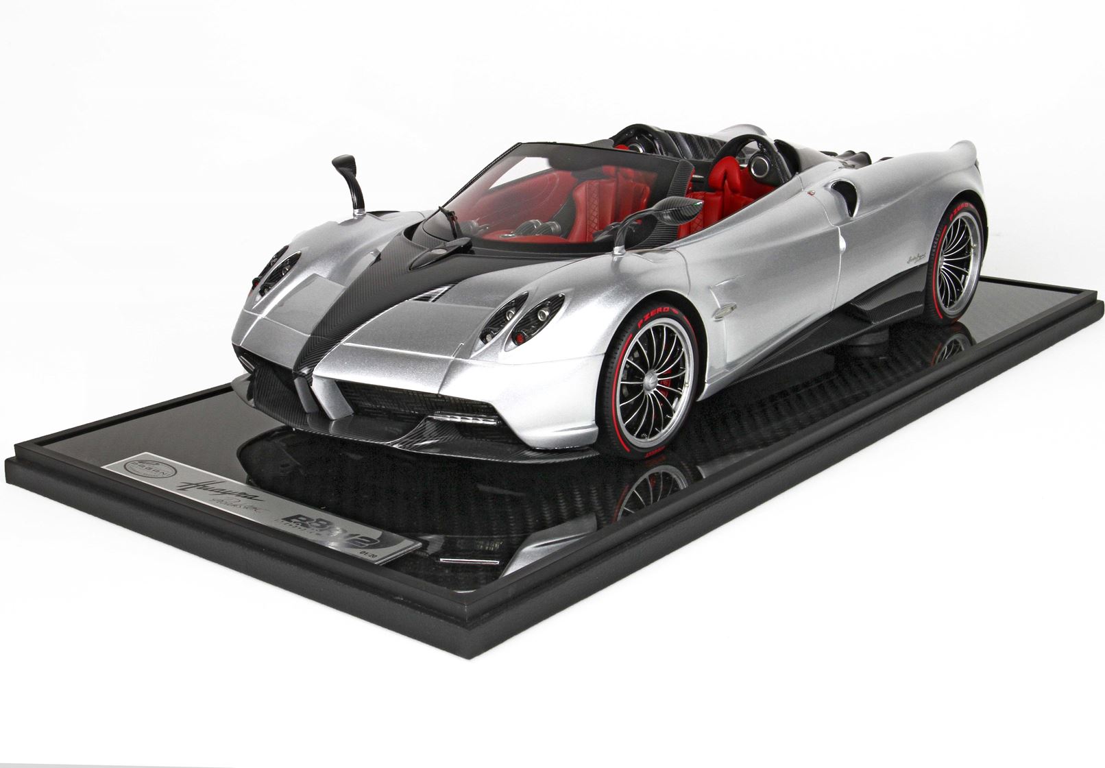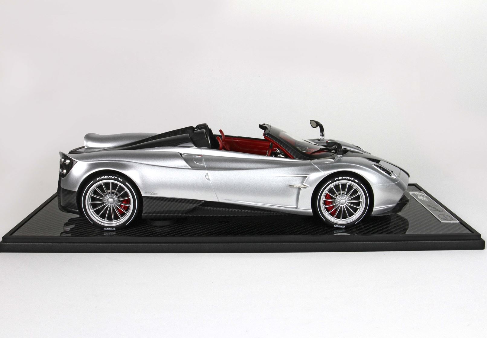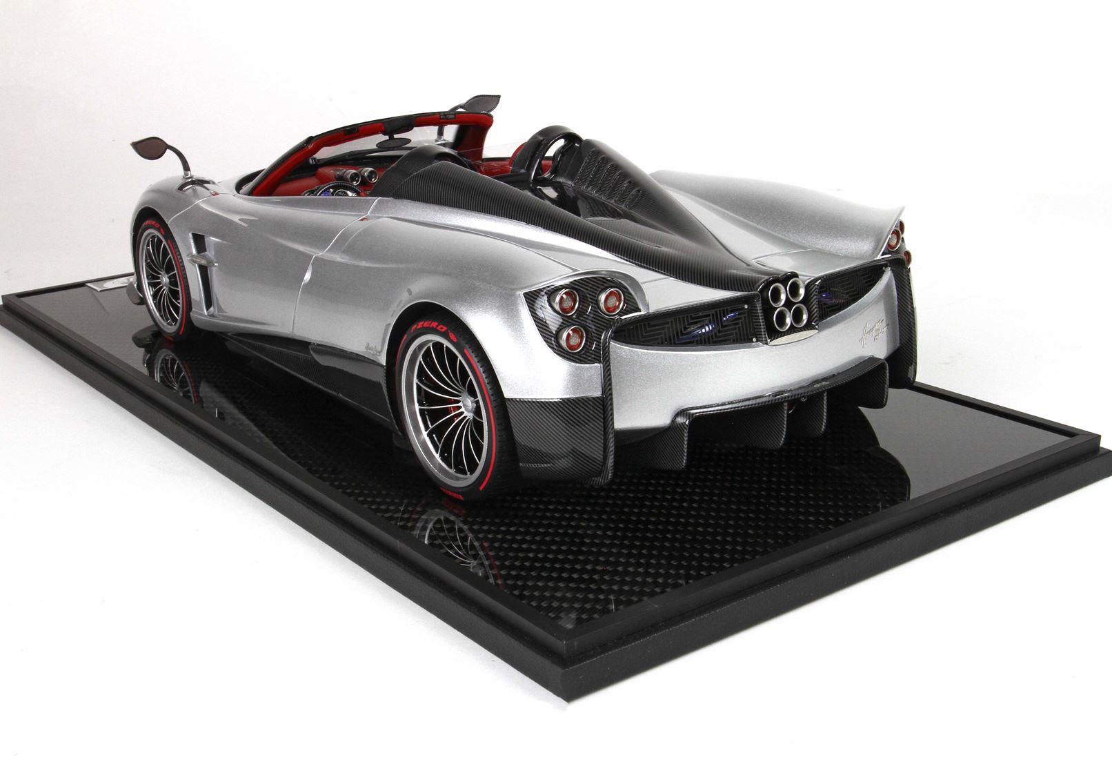 questo automodello replica fedelmente in ogni particolare la Huayra Spider, da notare la differente colorazione dei cerchi destri e sinistri