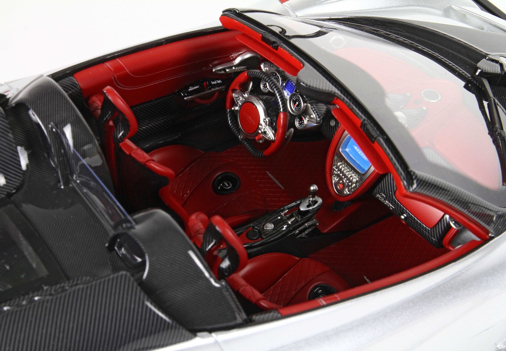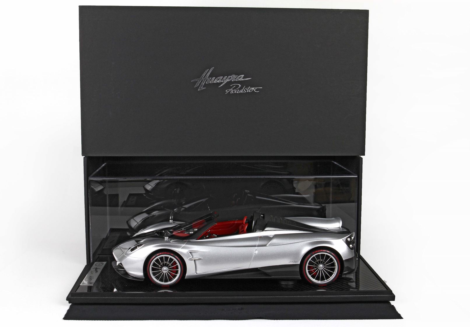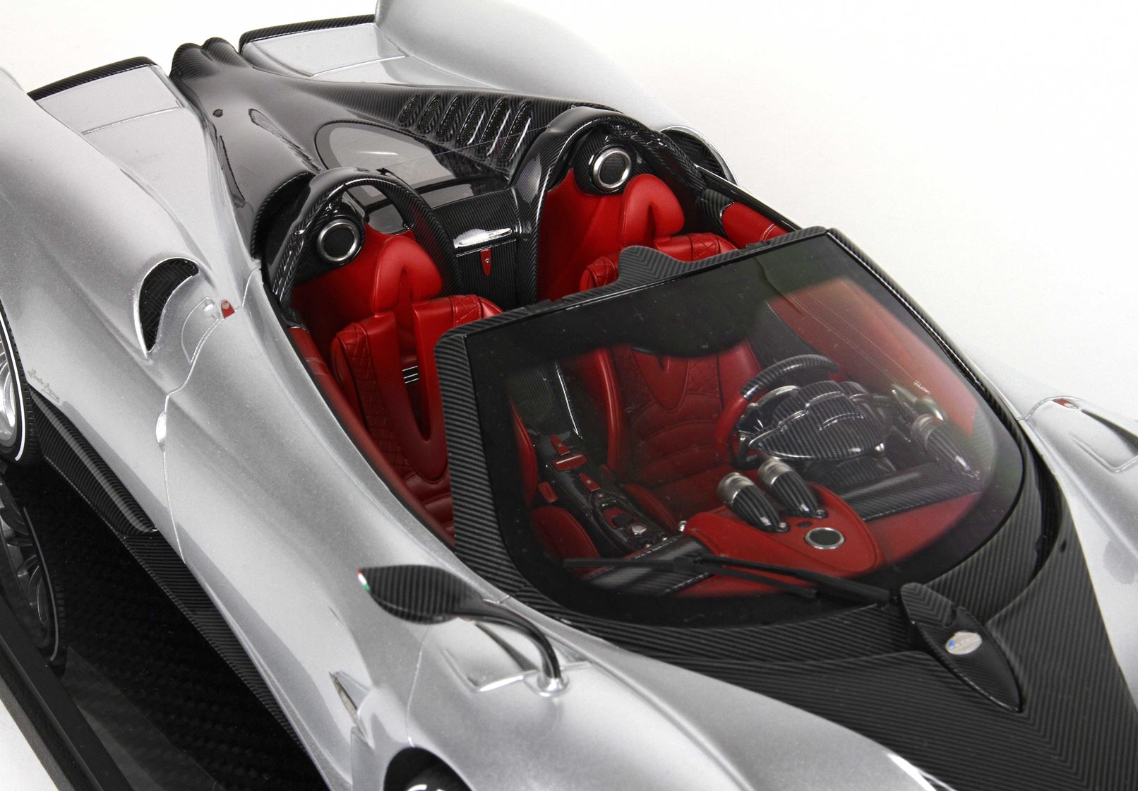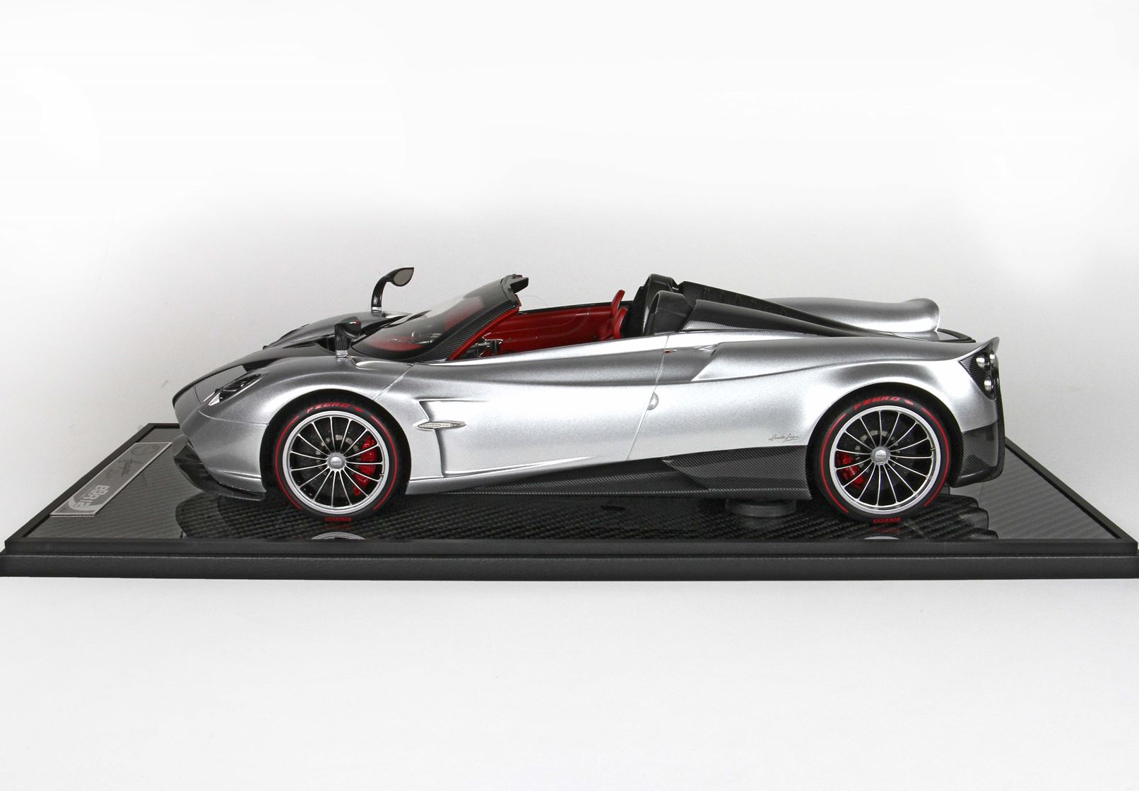 questo automodello replica fedelmente in ogni particolare la Huayra Spider, da notare la differente colorazione dei cerchi destri e sinistri