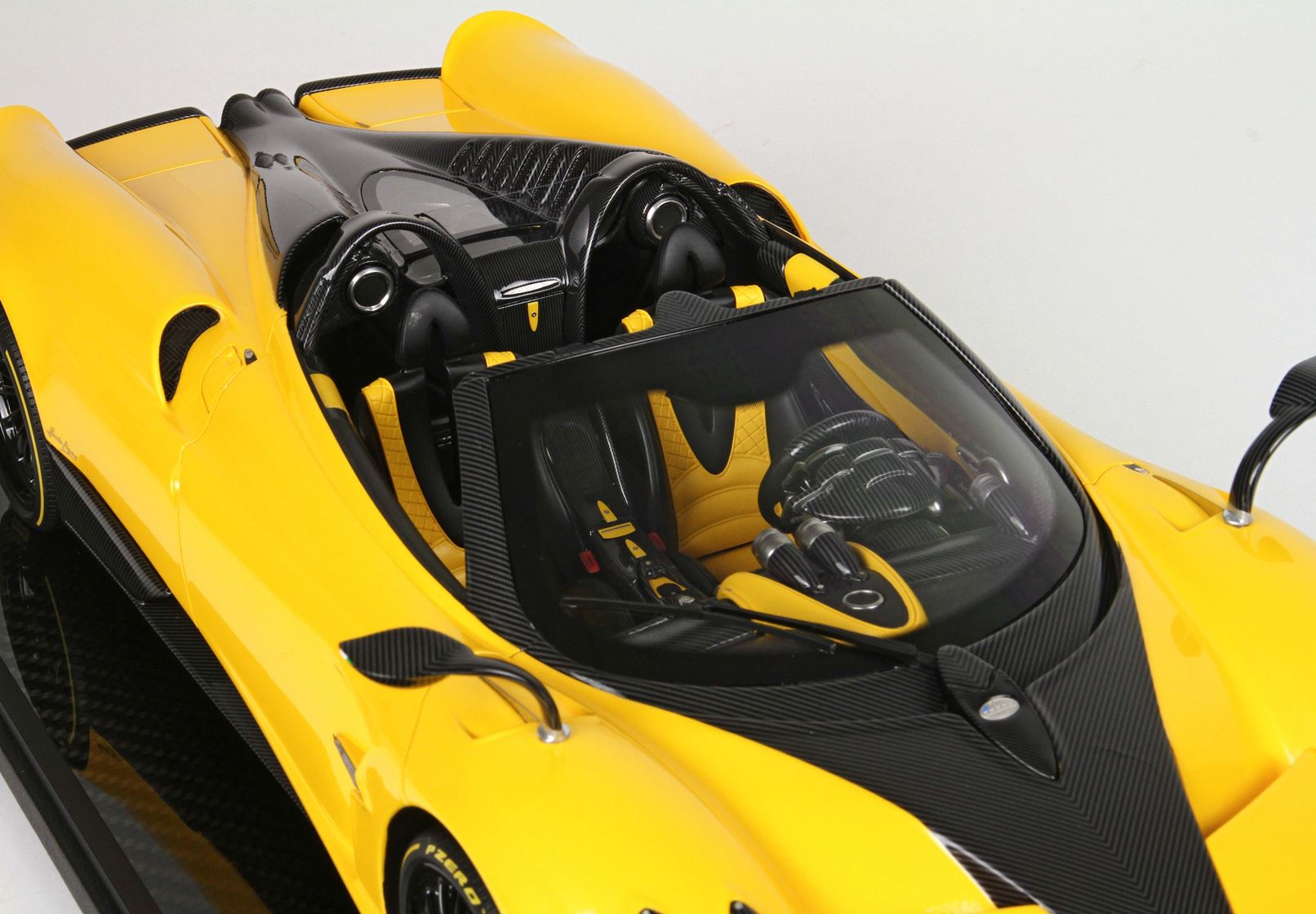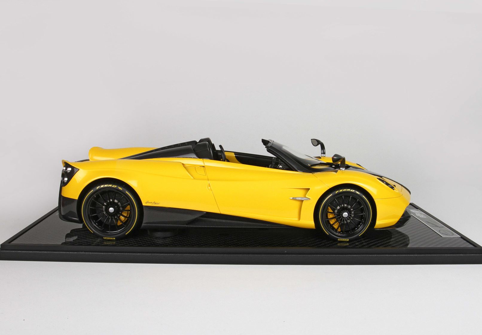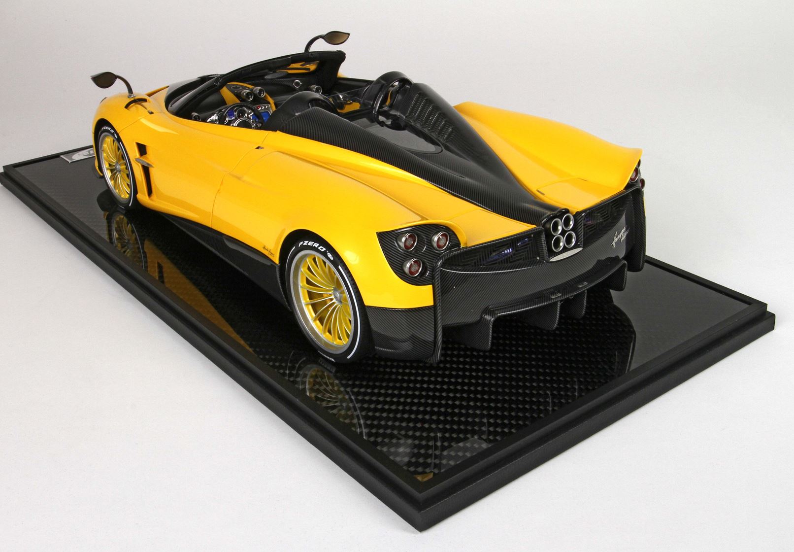 questo automodello replica fedelmente in ogni particolare la Huayra Spider, da notare la differente colorazione dei cerchi destri e sinistri