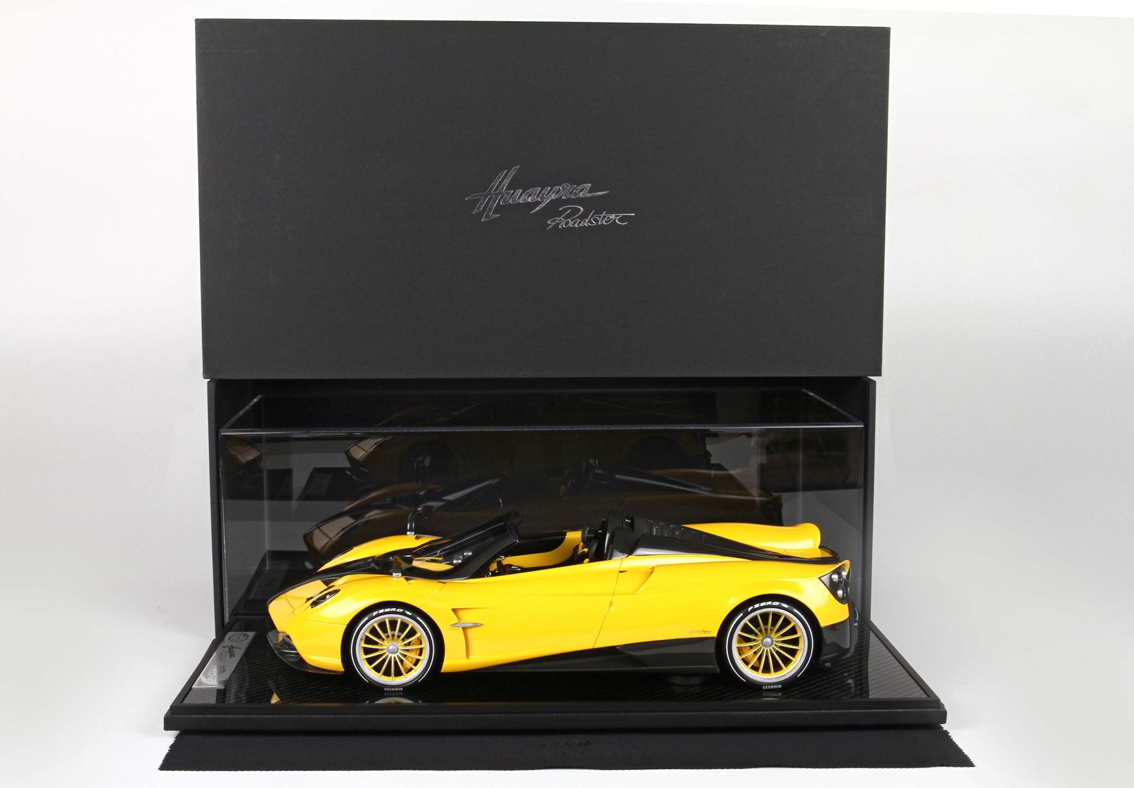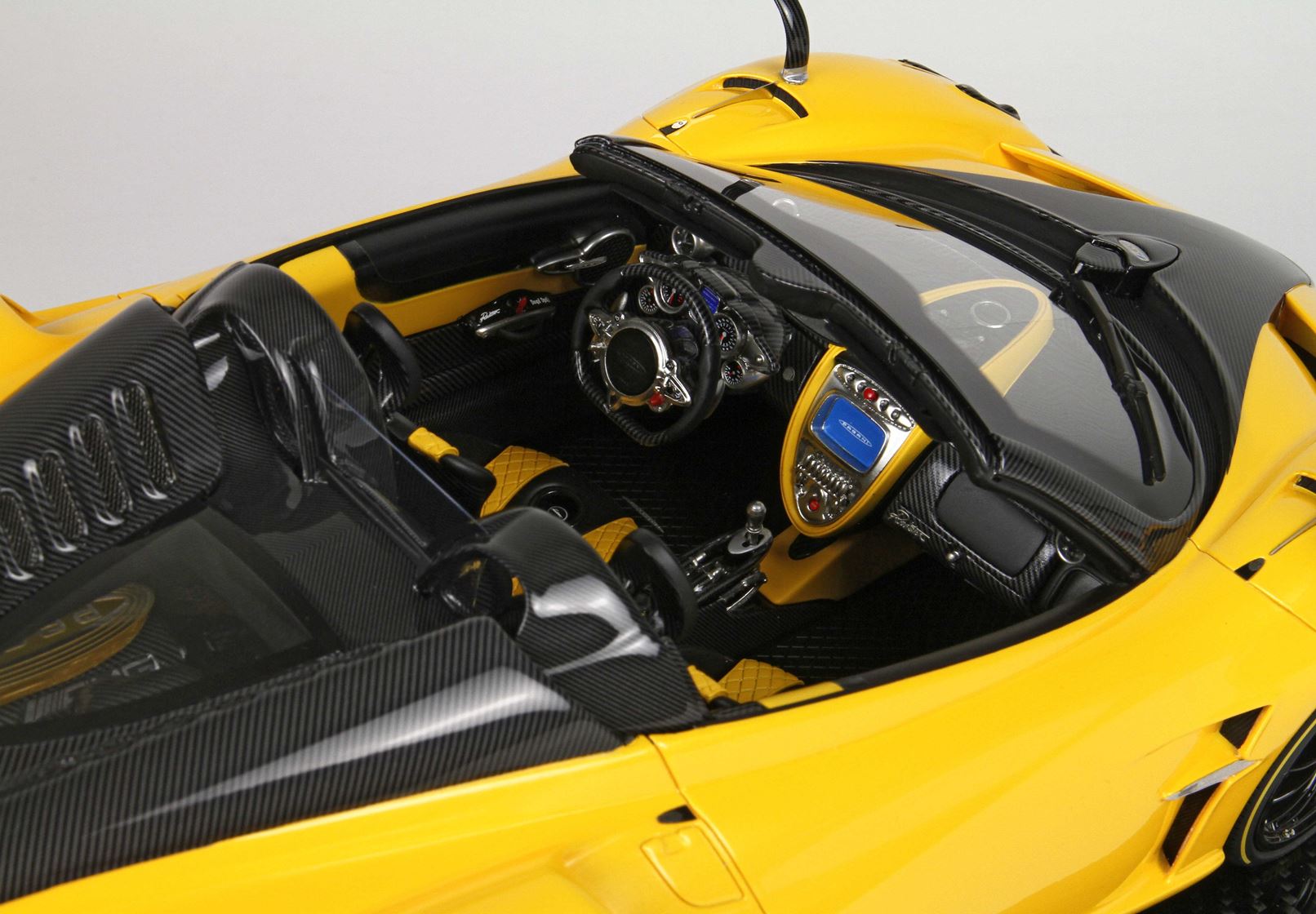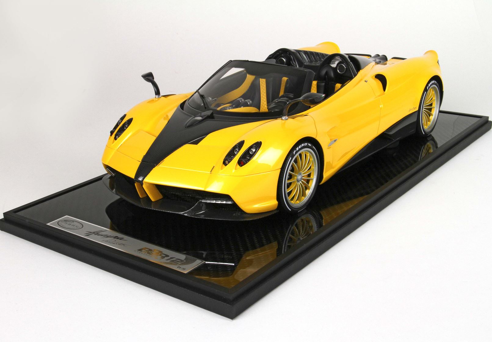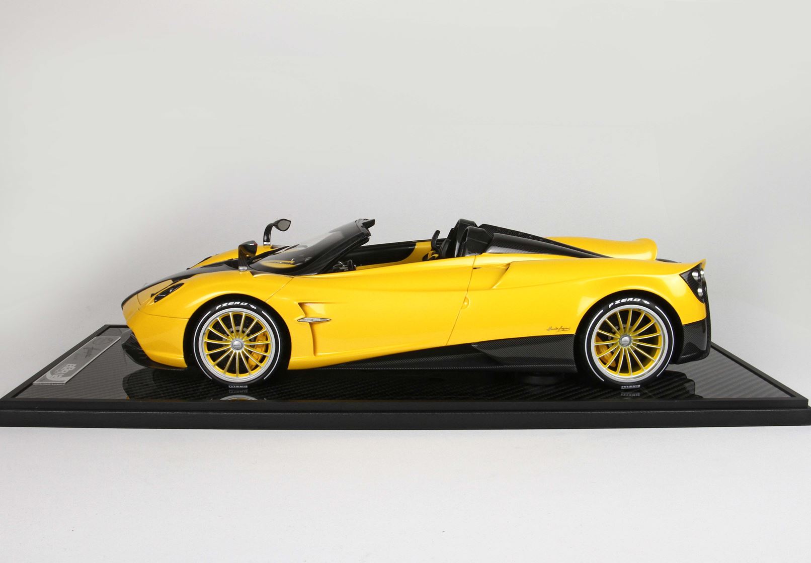 questo automodello replica fedelmente in ogni particolare la Huayra Spider, da notare la differente colorazione dei cerchi destri e sinistri