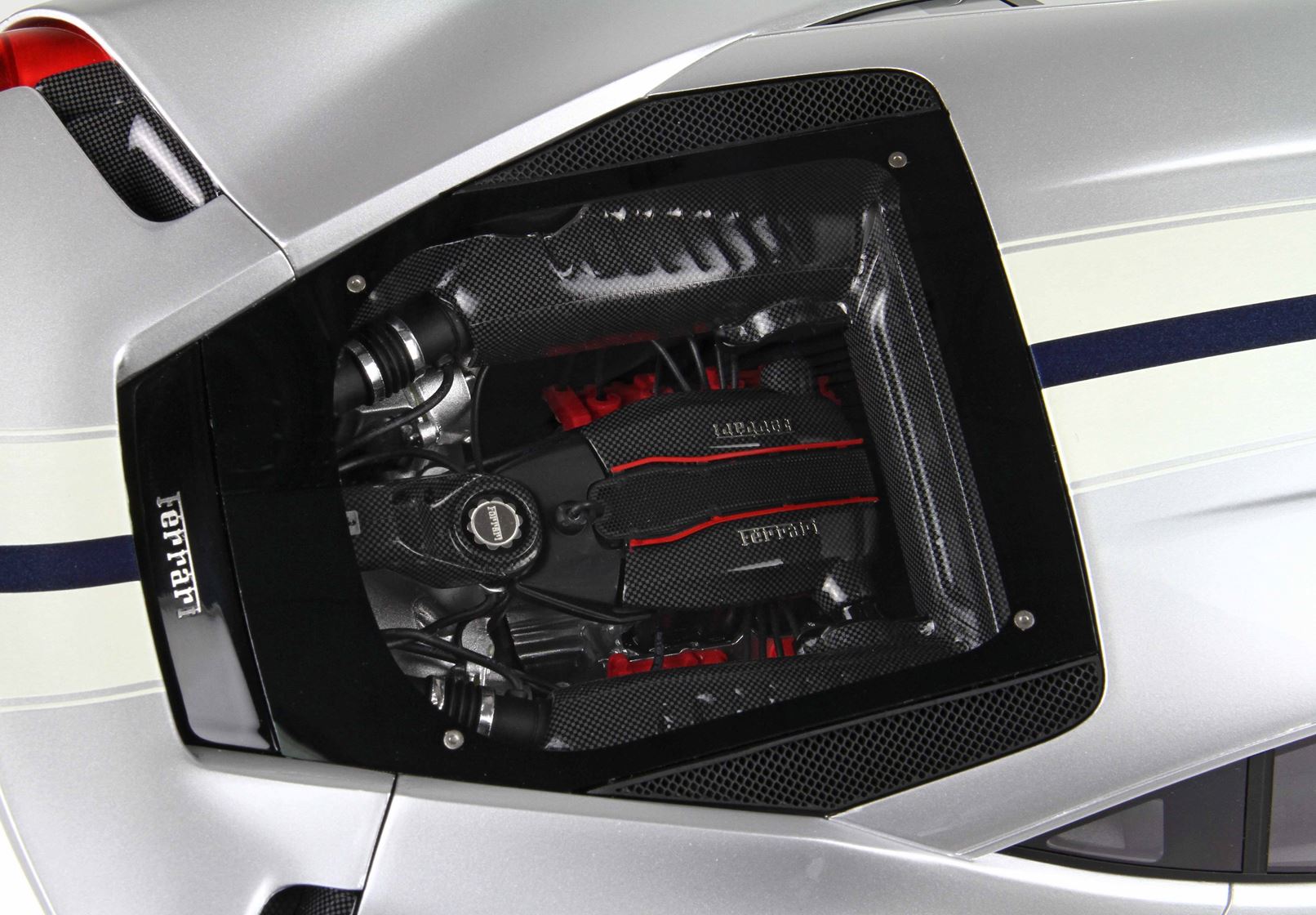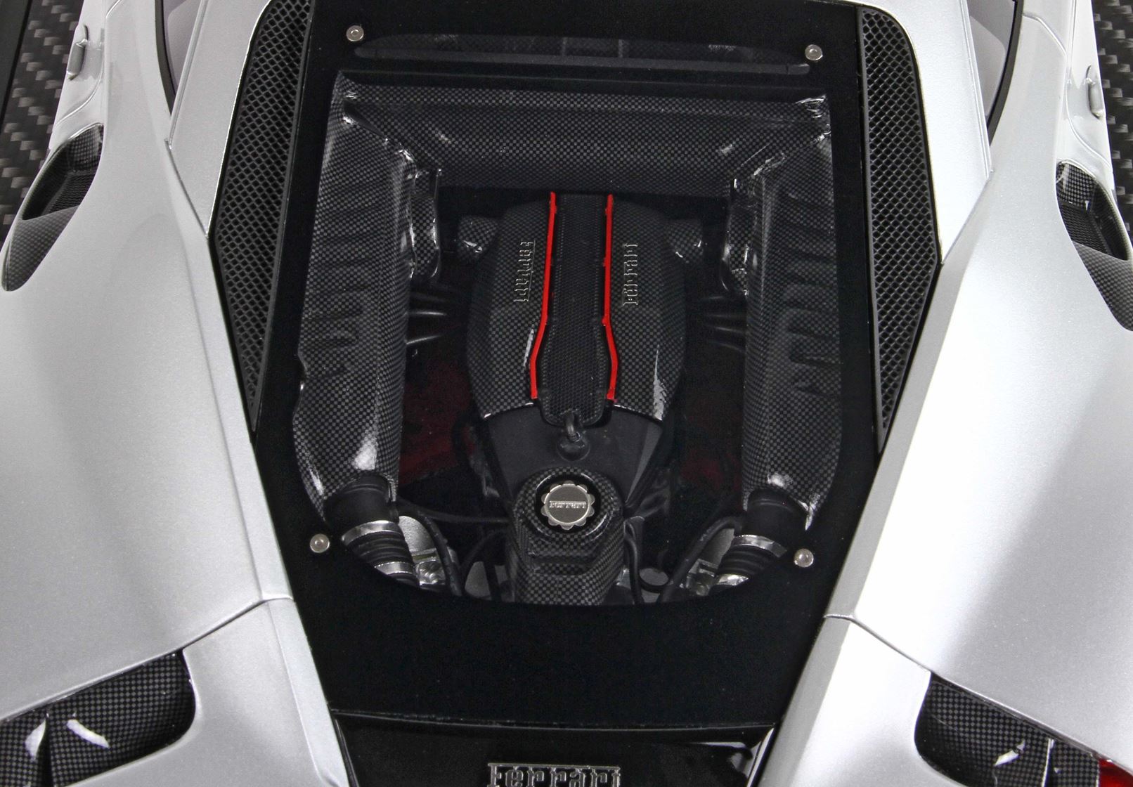 Tutta la zona del motore è rivestita con decals effetto carbonio.