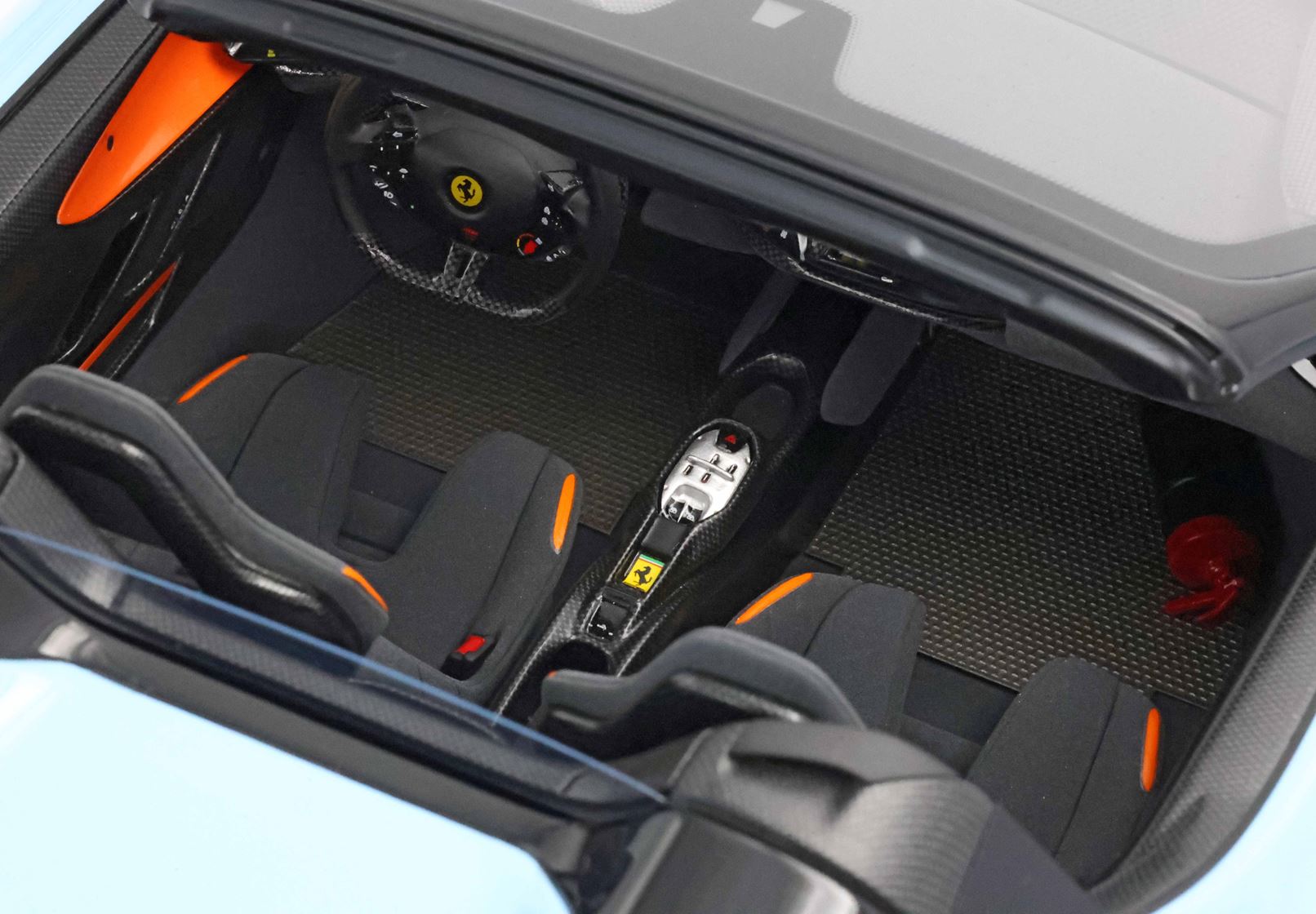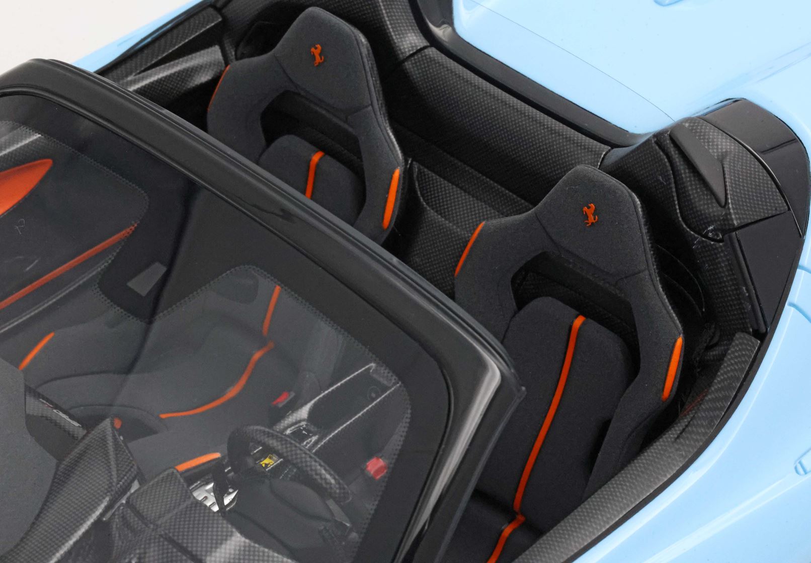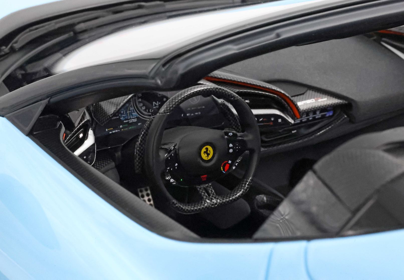 L'abitacolo, ispirato al mondo delle corse, è un connubio di lusso e funzionalità. Materiali pregiati come la fibra di carbonio e i tessuti tecnici creano un ambiente raffinato e leggero, dove ogni dettaglio è pensato per esaltare il piacere di guida.